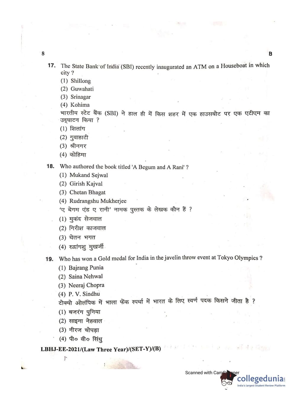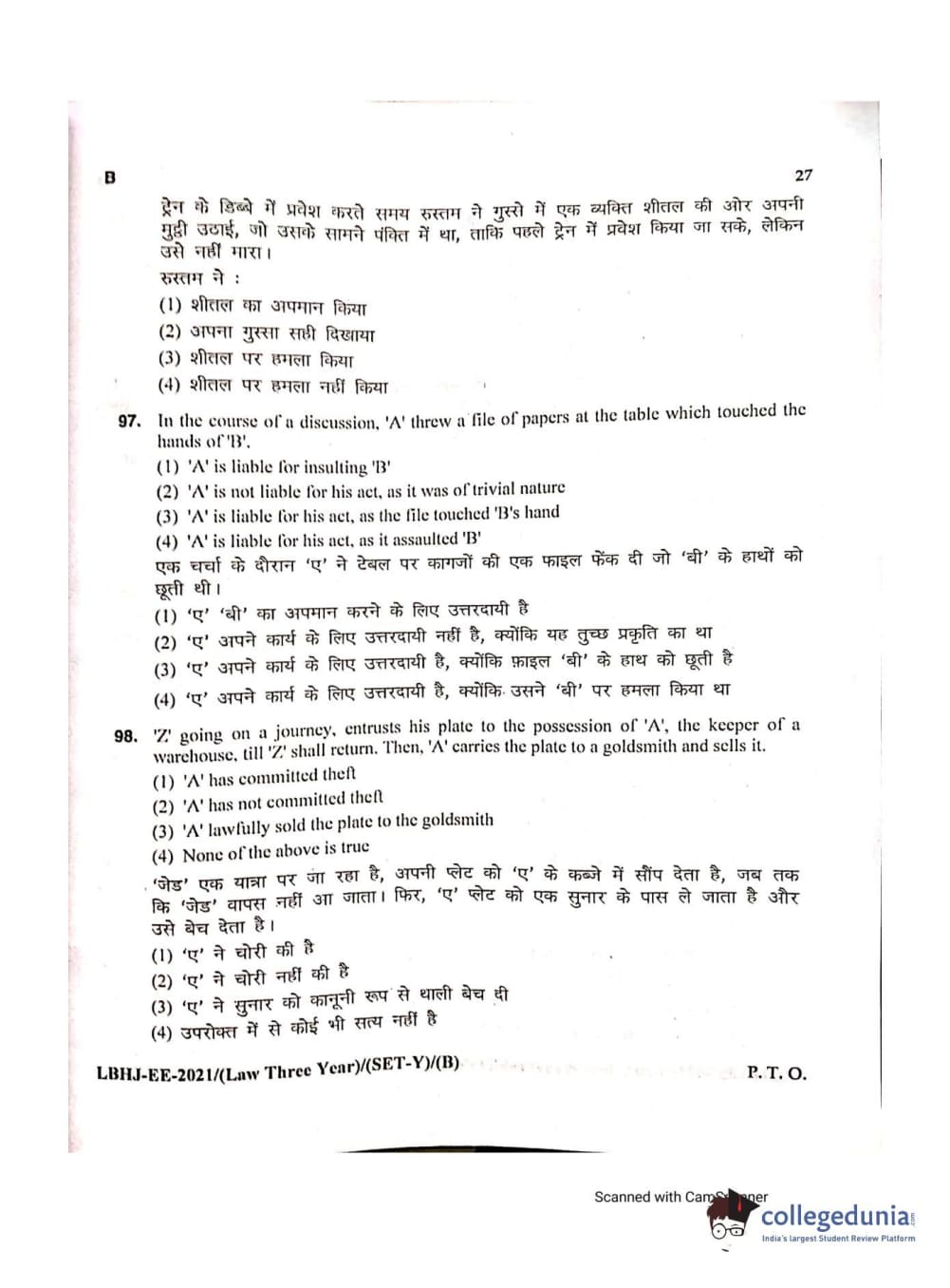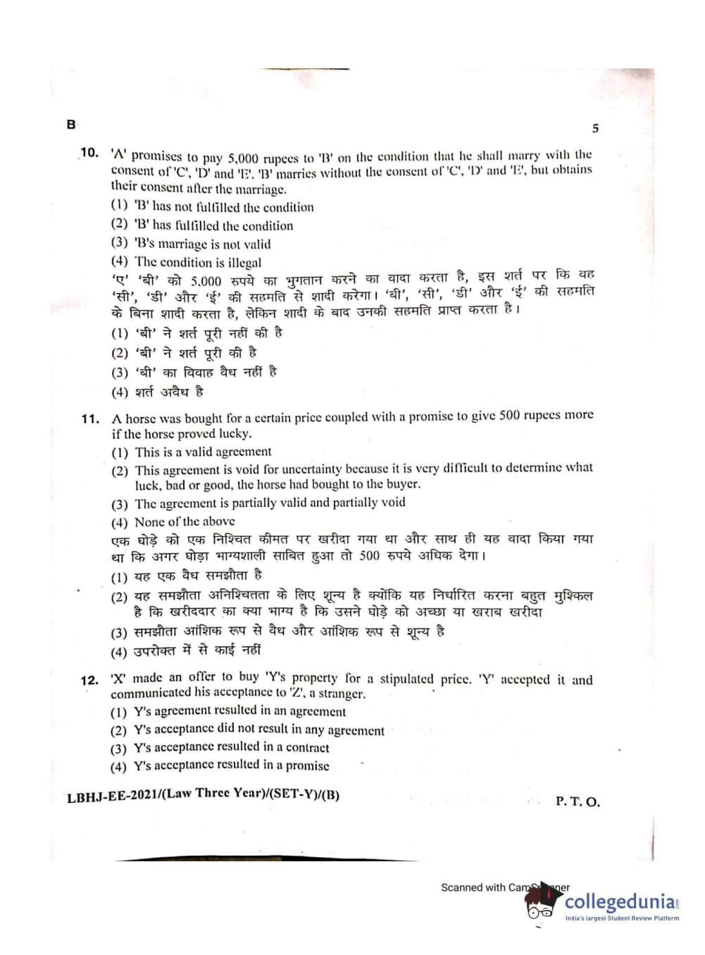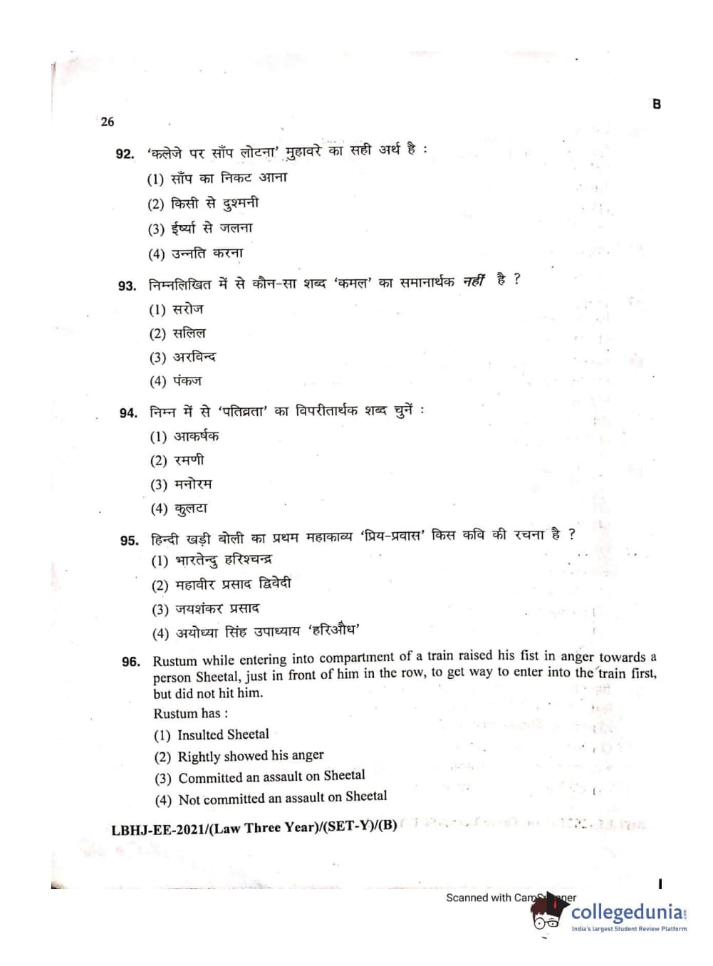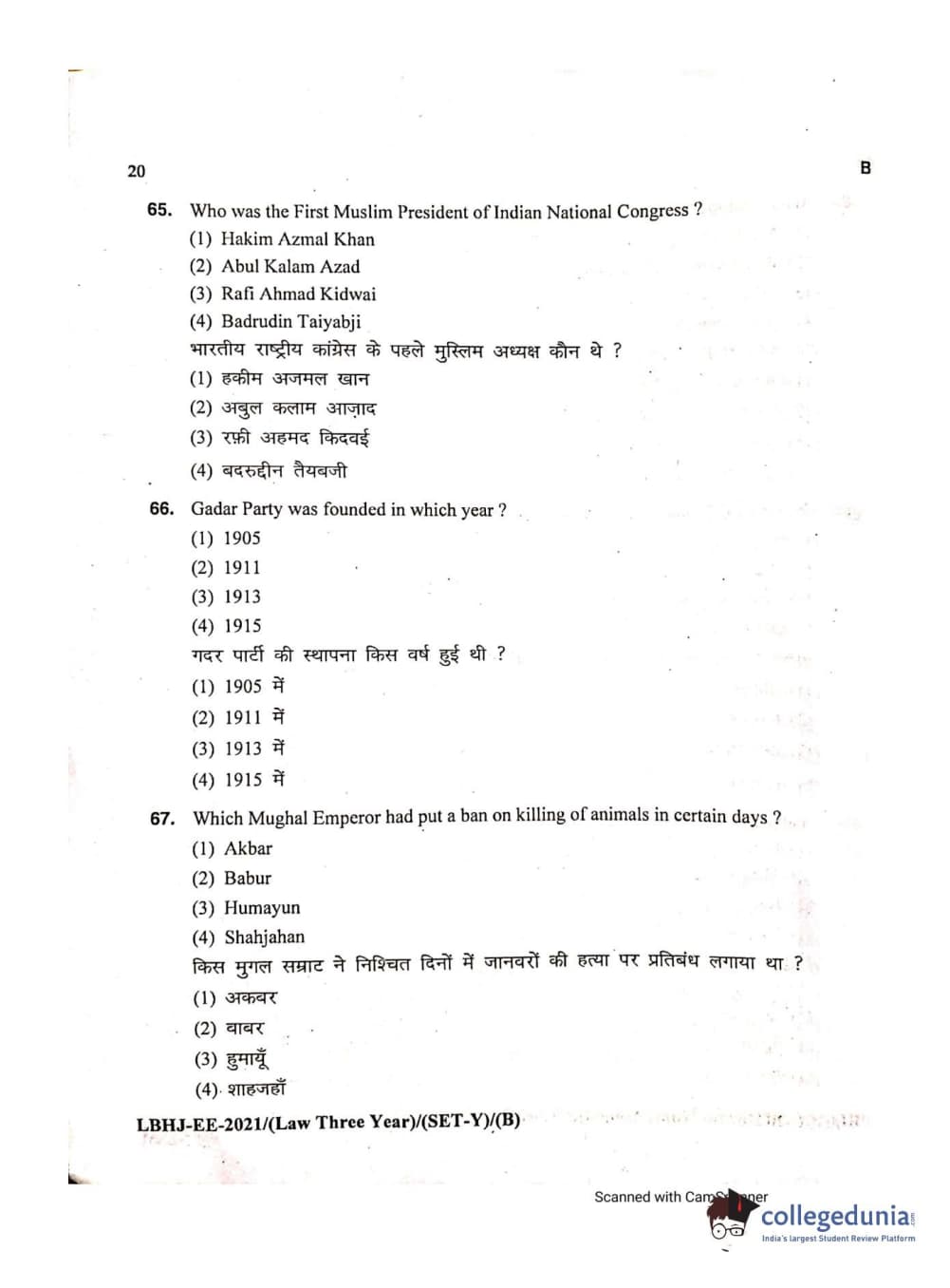MDUCEE 2021 LL.B (Hons.)-3 Year course Set B Question Paper with Answer Key PDFs