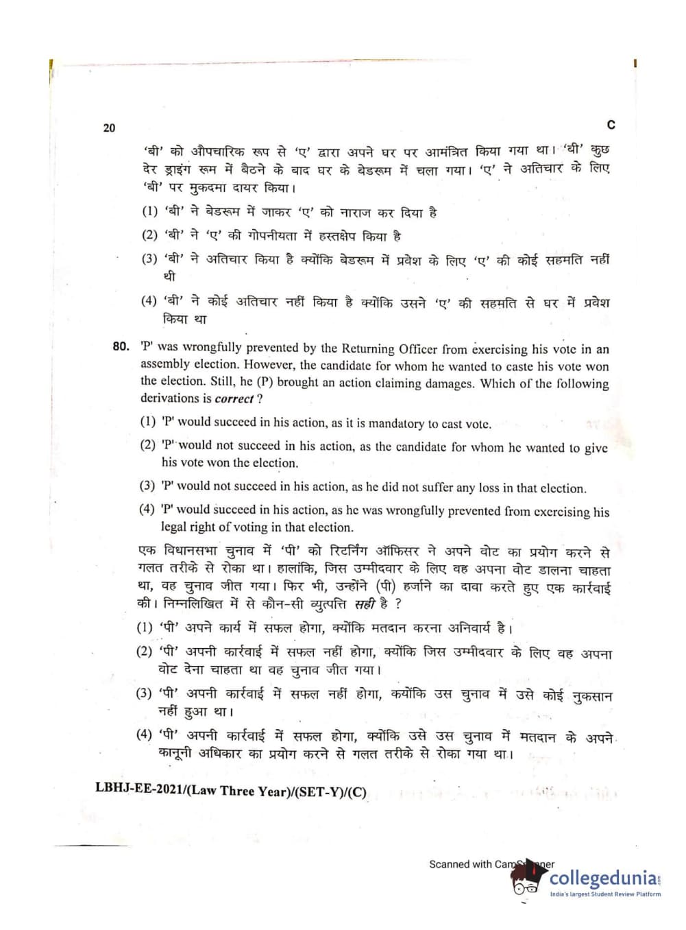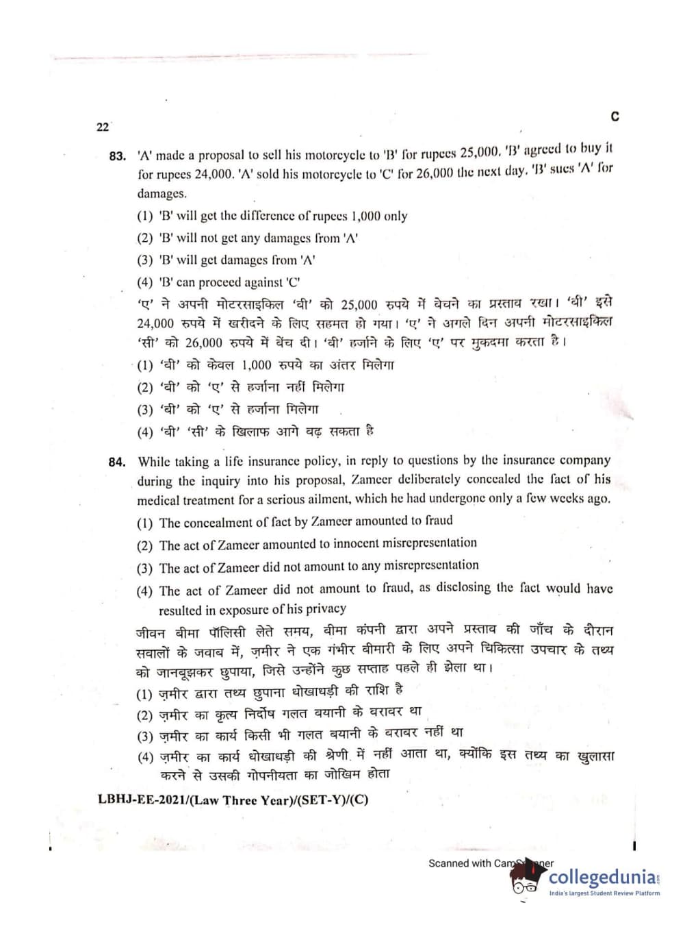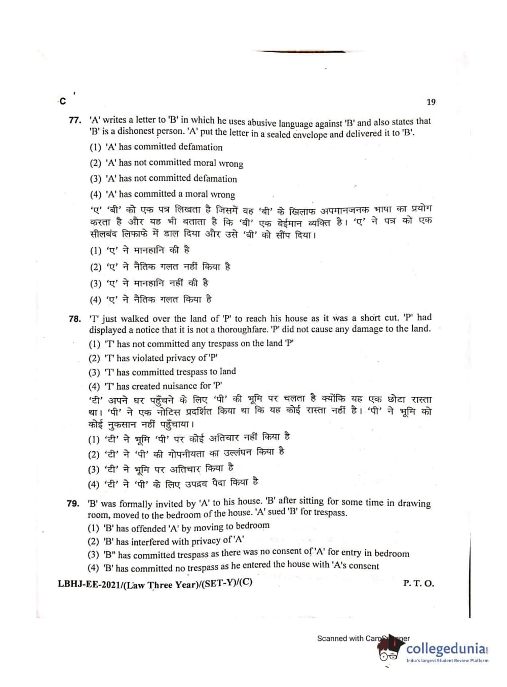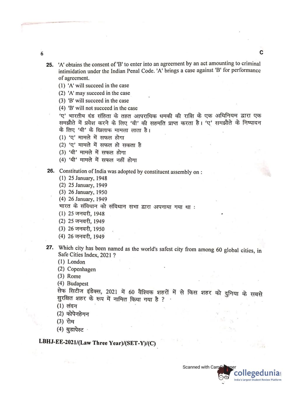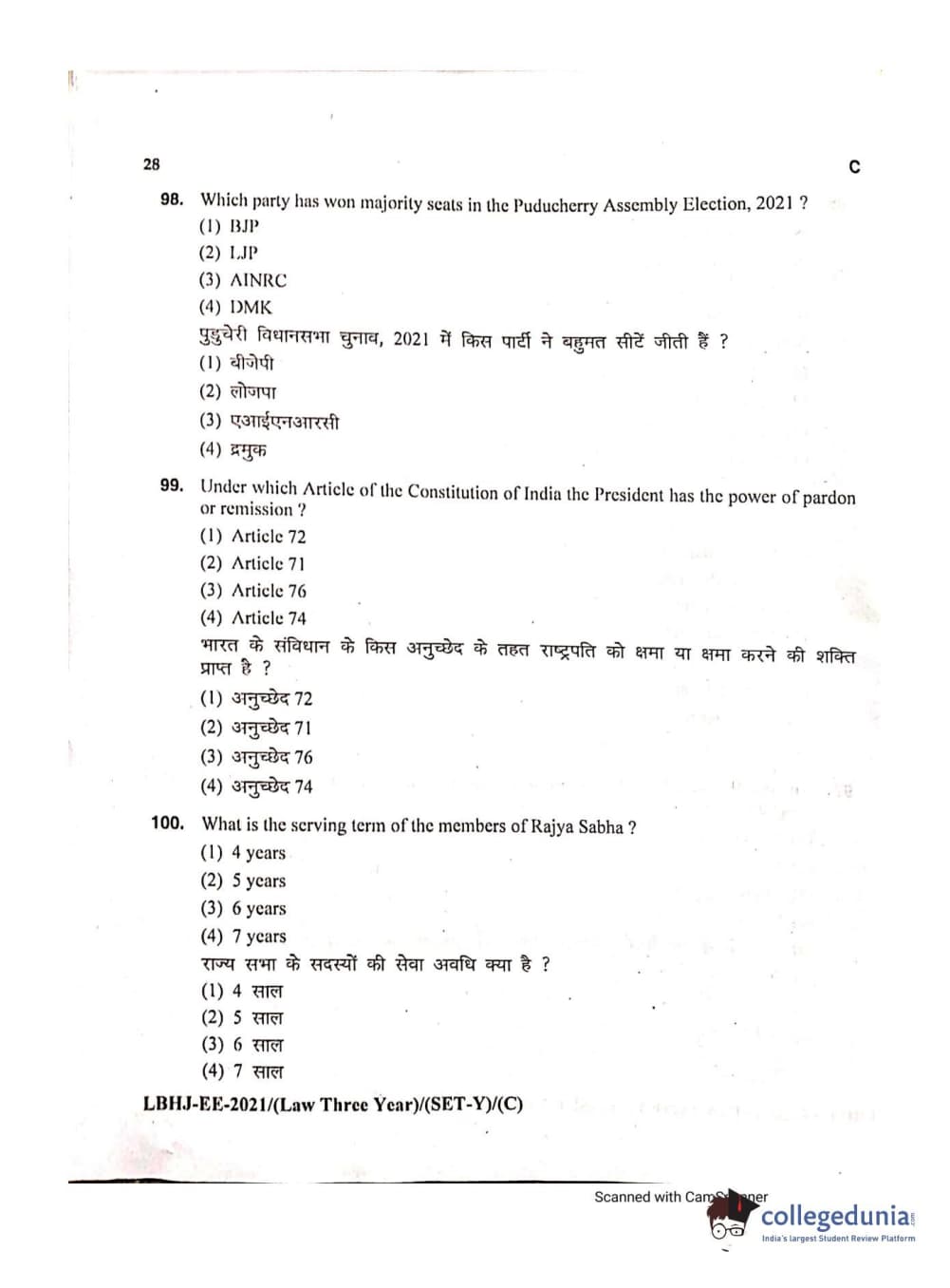 MDUCEE 2021 LL.B (Hons.)-3 Year course Set C Question Paper with Answer Key PDFs