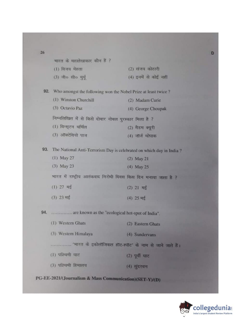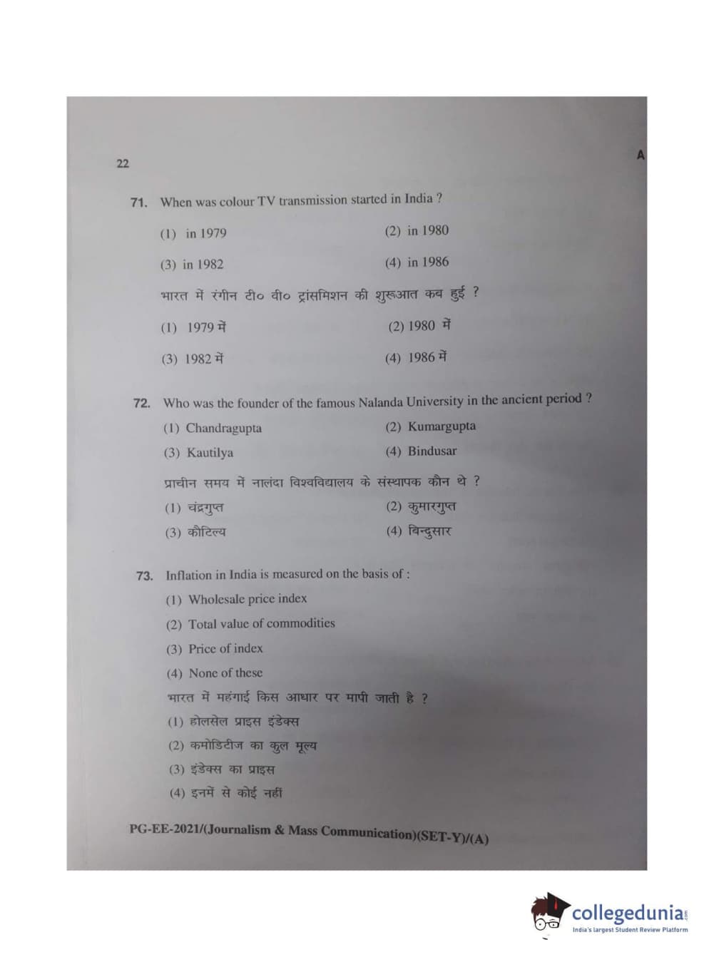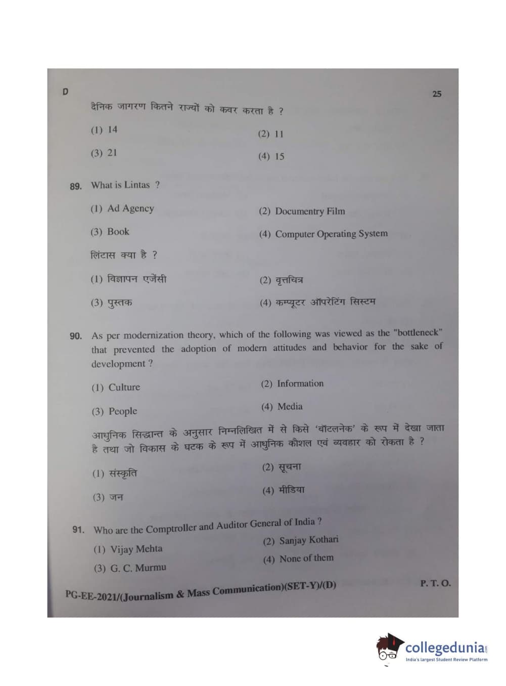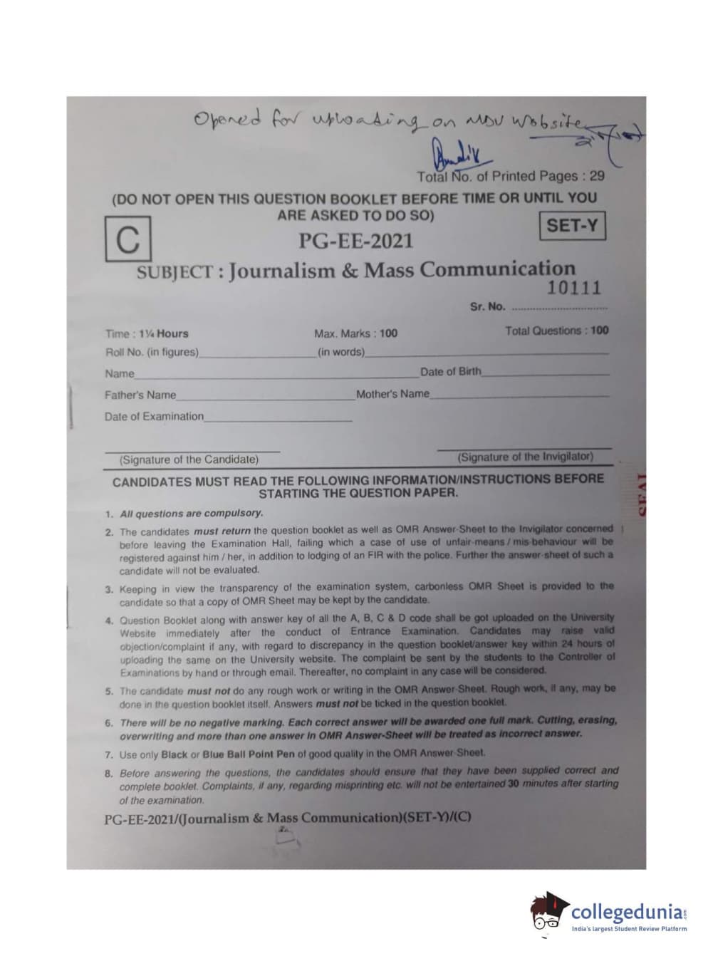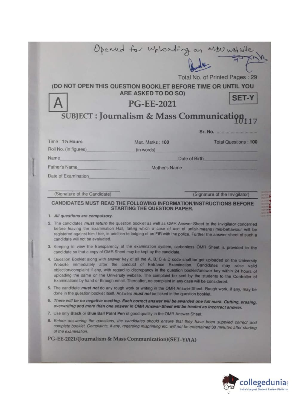 MDUCEE 2021 MA (JMC) Question paper with answer key pdf conducted on September 22, 2021 is available for download. The exam was successfully organized by Maharishi Dayanand University. The question paper comprised a total of 100 questions.