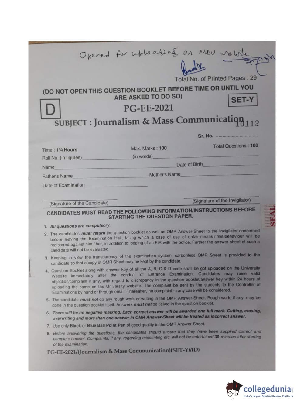 | MDUCEE 2021 M.A Journalism and Mass Communication Set D Question Paper PDF | MDUCEE 2021 M.A Journalism and Mass Communication Set D Answer Key PDF |