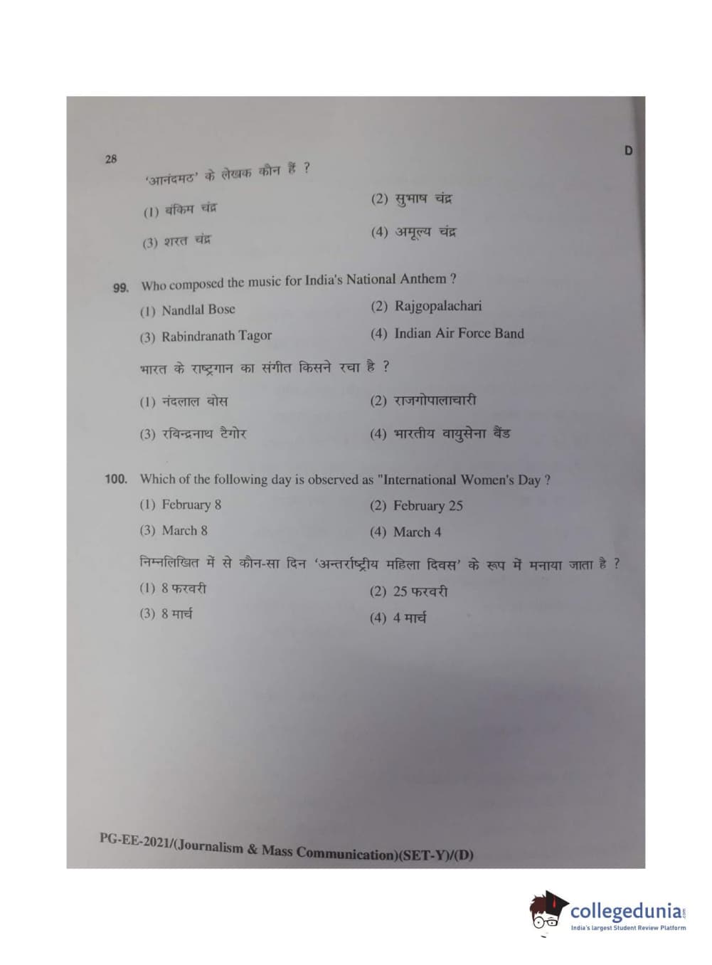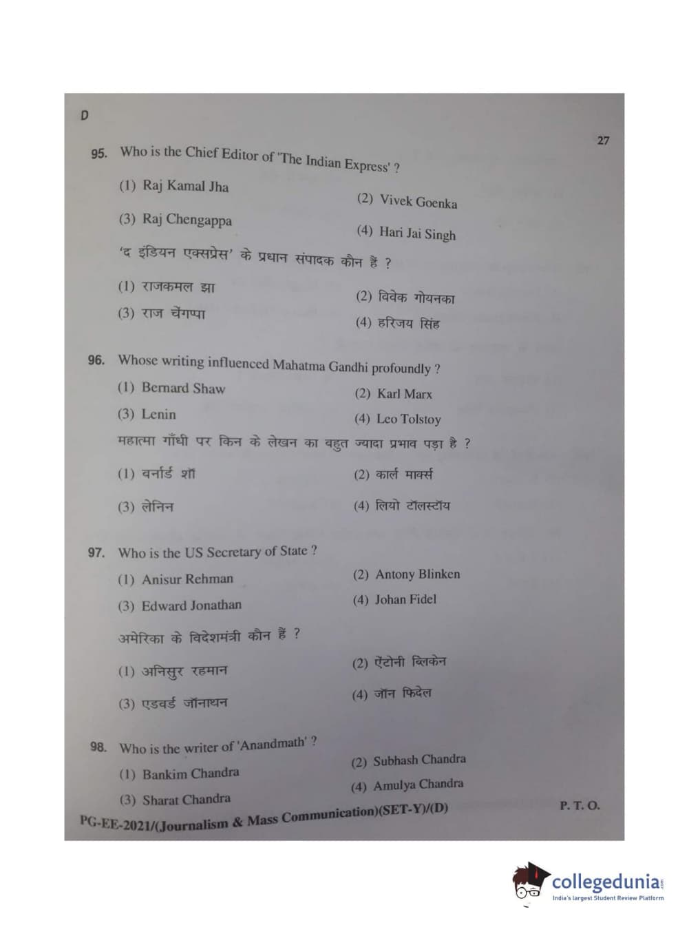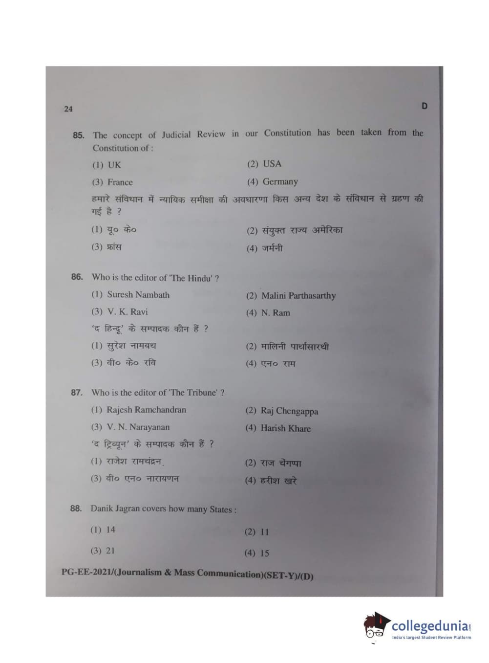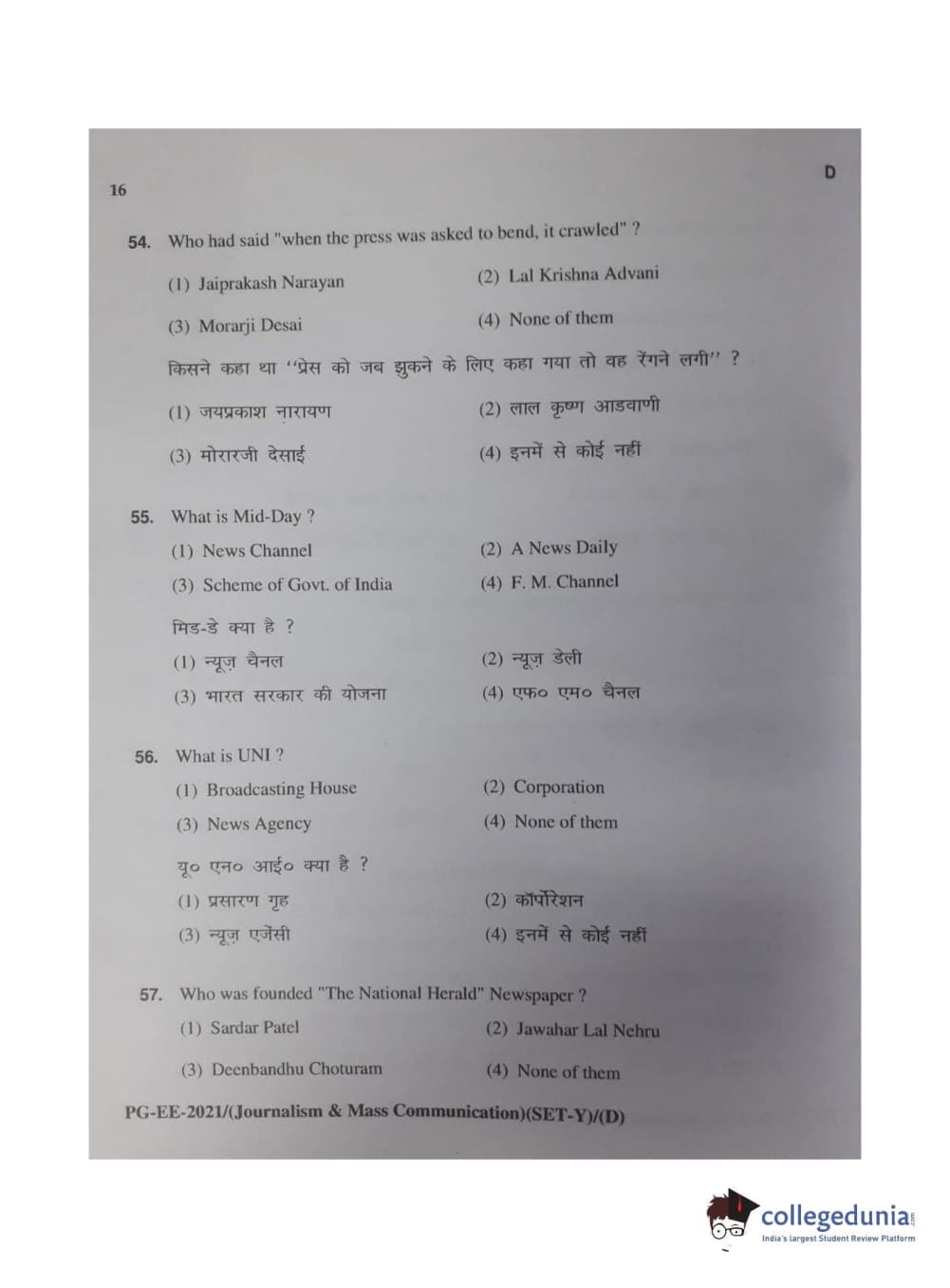 MDUCEE 2021 M.A Journalism and Mass Communication Set D Question Paper with Answer Key PDFs