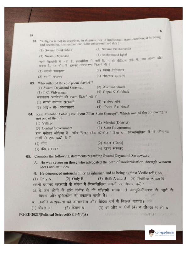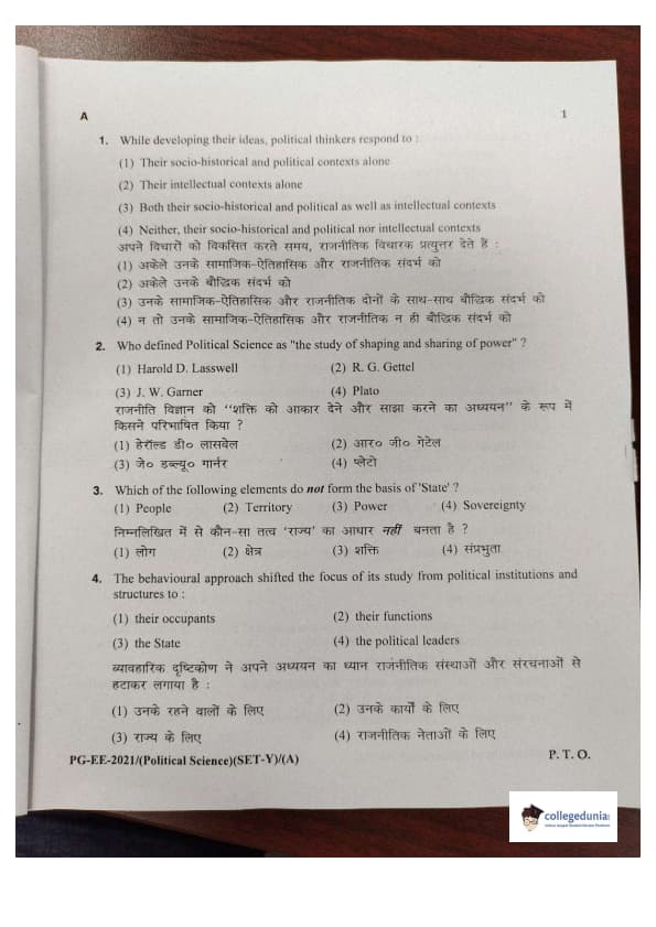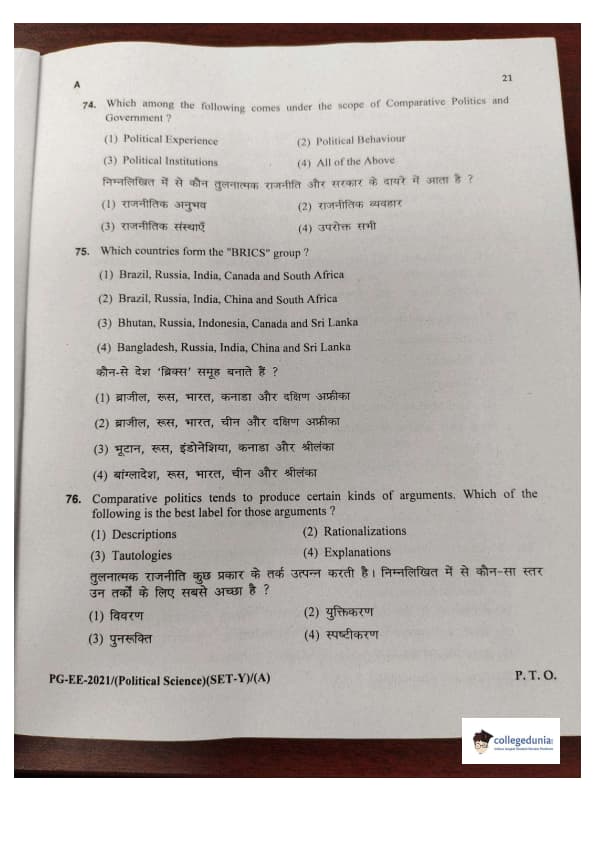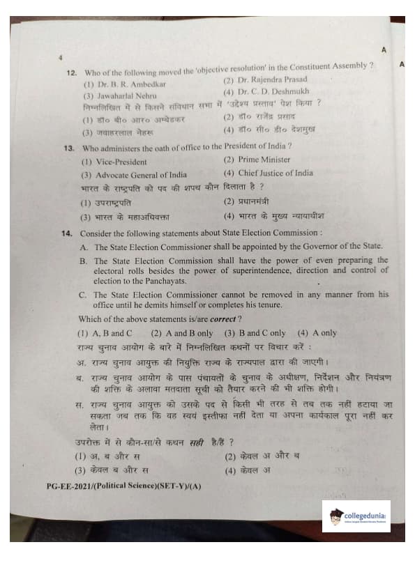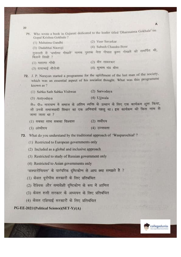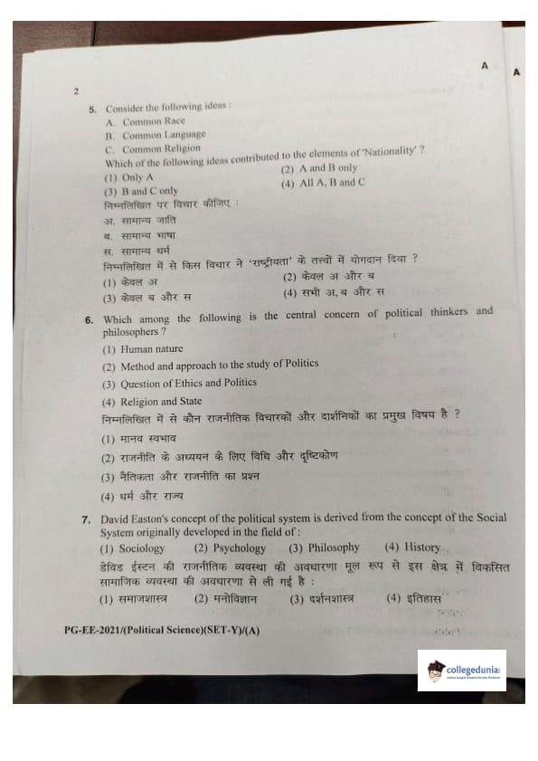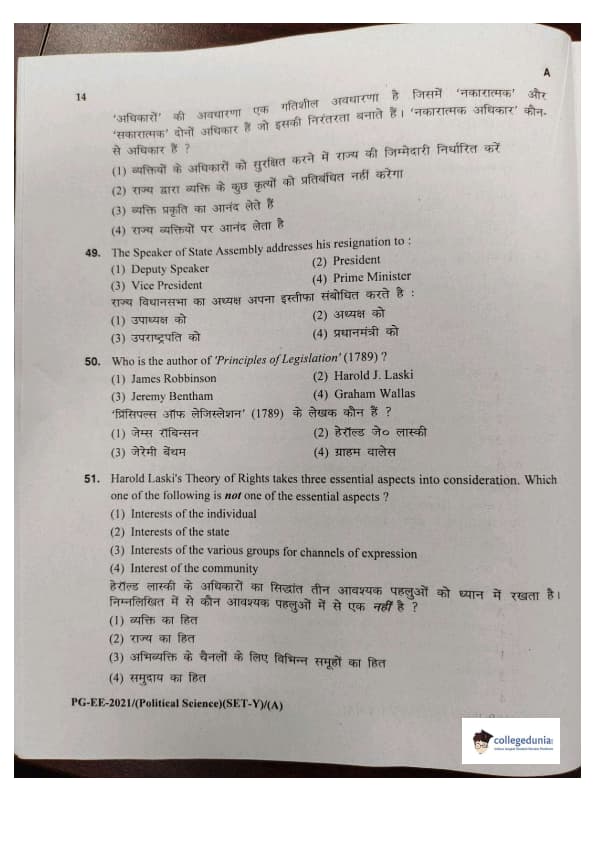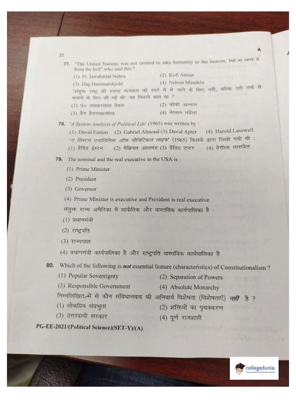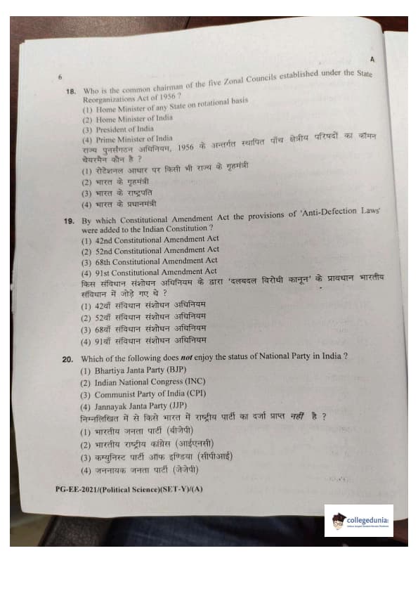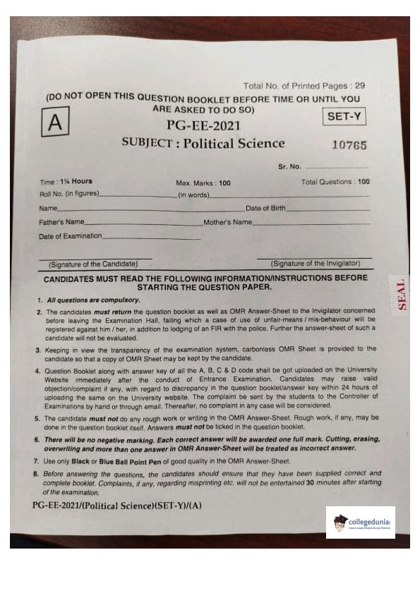MDUCEE 2021 M.A. Political Science Set A Question Paper with Answer Key PDFs