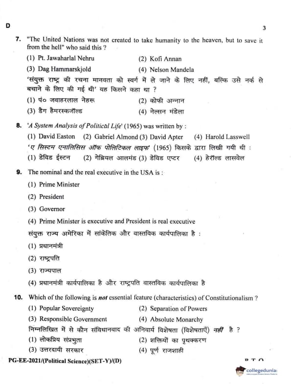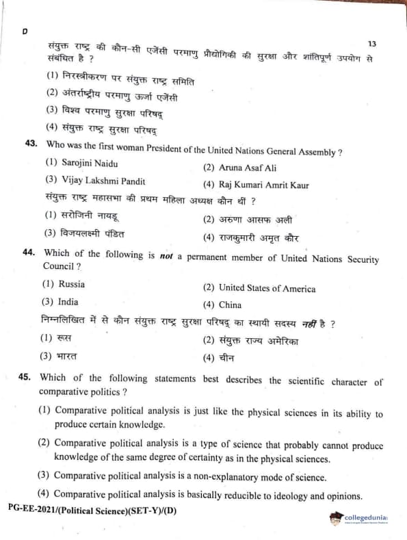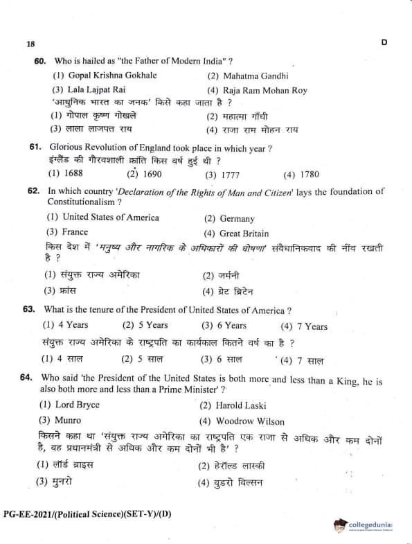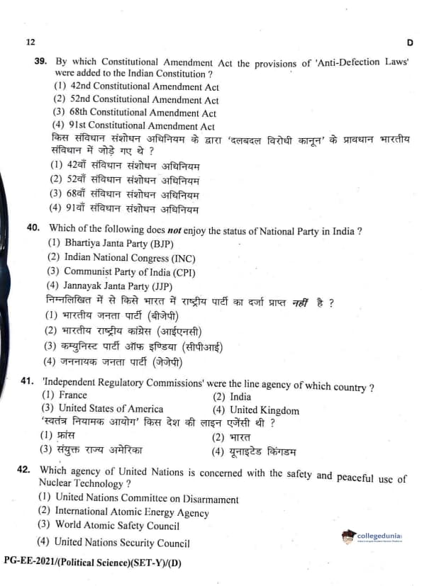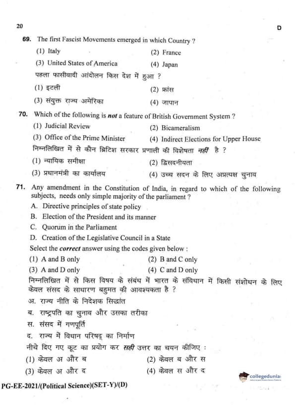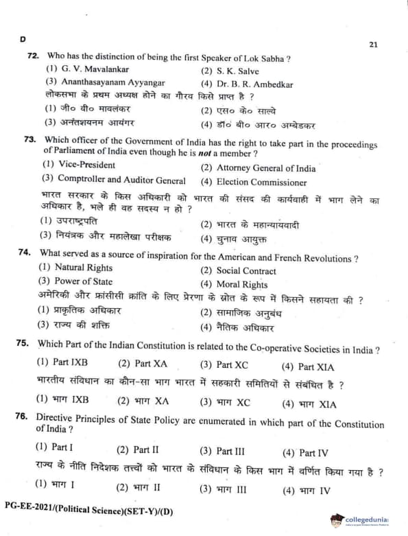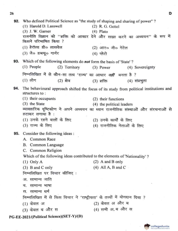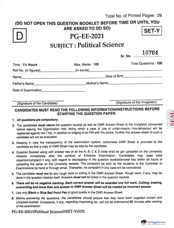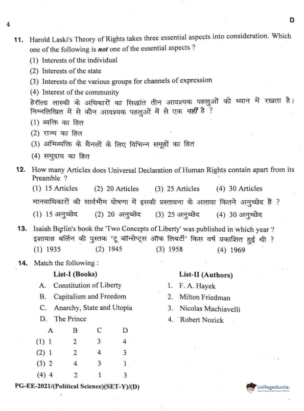 MDUCEE 2021 M.A. Political Science Set D Question Paper with Answer Key PDFs