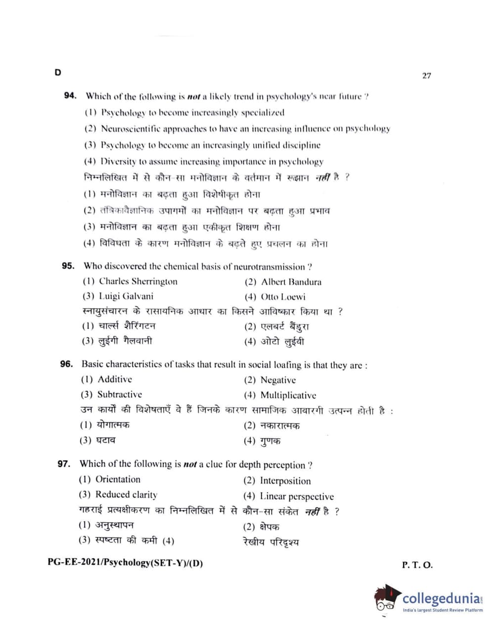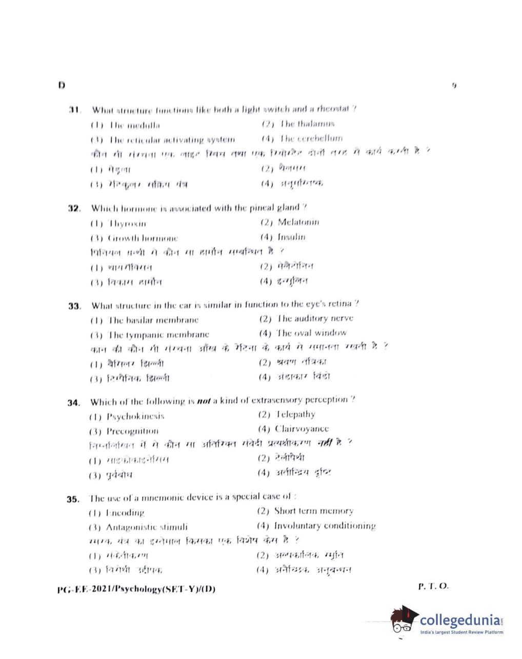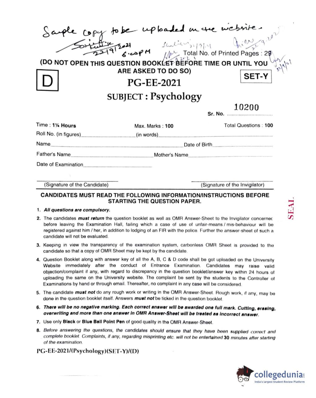 MDUCEE 2021 M.A Psychology Set D Question paper with answer key pdf conducted on September 22, 2021 is available for download. The exam was successfully organized by Maharishi Dayanand University. The question paper comprised a total of 100 questions.