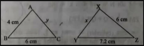 In the figure given above, \(\triangle ABC \sim \triangle XYZ\), then find the values of \(x\) and \(y\).
