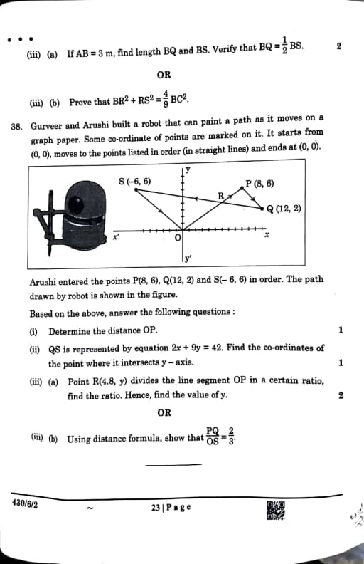 % Image description: Left: A picture of a small robot device. Right: A 2D Cartesian coordinate graph showing a path. Points O(0,0), S(-6,6), P(8,6), Q(12,2), R are marked. Arrows show path O -> S -> ... -> Q -> P -> R -> O. The text however says "Arushi entered the points P(8,6), Q(12,2) and S(-6,6) in order". The path from diagram seems O -> S -> point near (-2,4) -> Q -> P -> R -> O. The text mentions path only through P, Q, S.