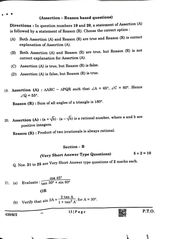 Directions : In question numbers 19 and 20, a statement of Assertion (A) is followed