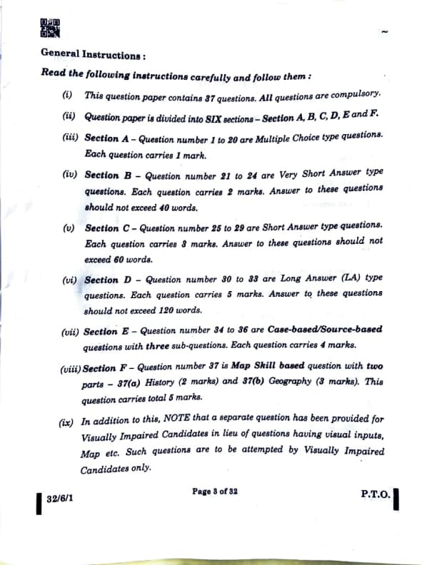 The exam is worth 80 marks, with an extra 20 Marks for internal assessment. The question paper contains MCQs, short and long answers that test students' knowledge of History, Geography, Political Science, and Economics concepts.