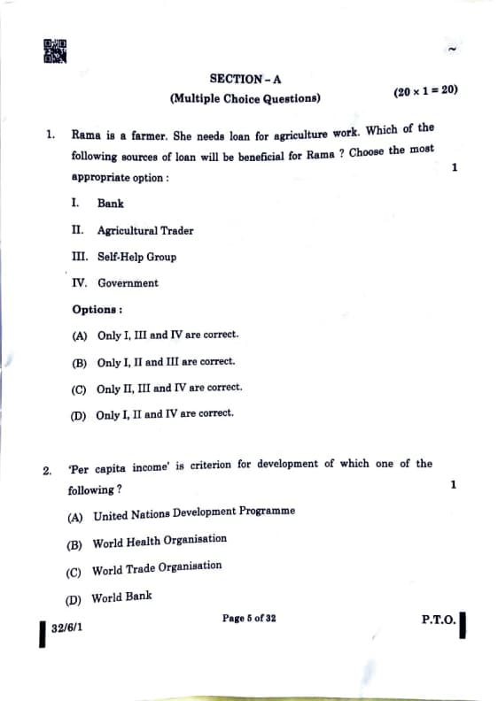 For agricultural loans, the most reliable and commonly used sources are formal institutions like Bank, Self-Help Groups (SHGs), and the Government through various schemes. These institutions provide regulated credit facilities with structured repayment plans. In contrast, Agricultural Traders are informal sources and may charge high interest, making them less beneficial. Therefore, options I (Bank), III (Self-Help Group), and IV (Government) are beneficial loan sources for Rama.