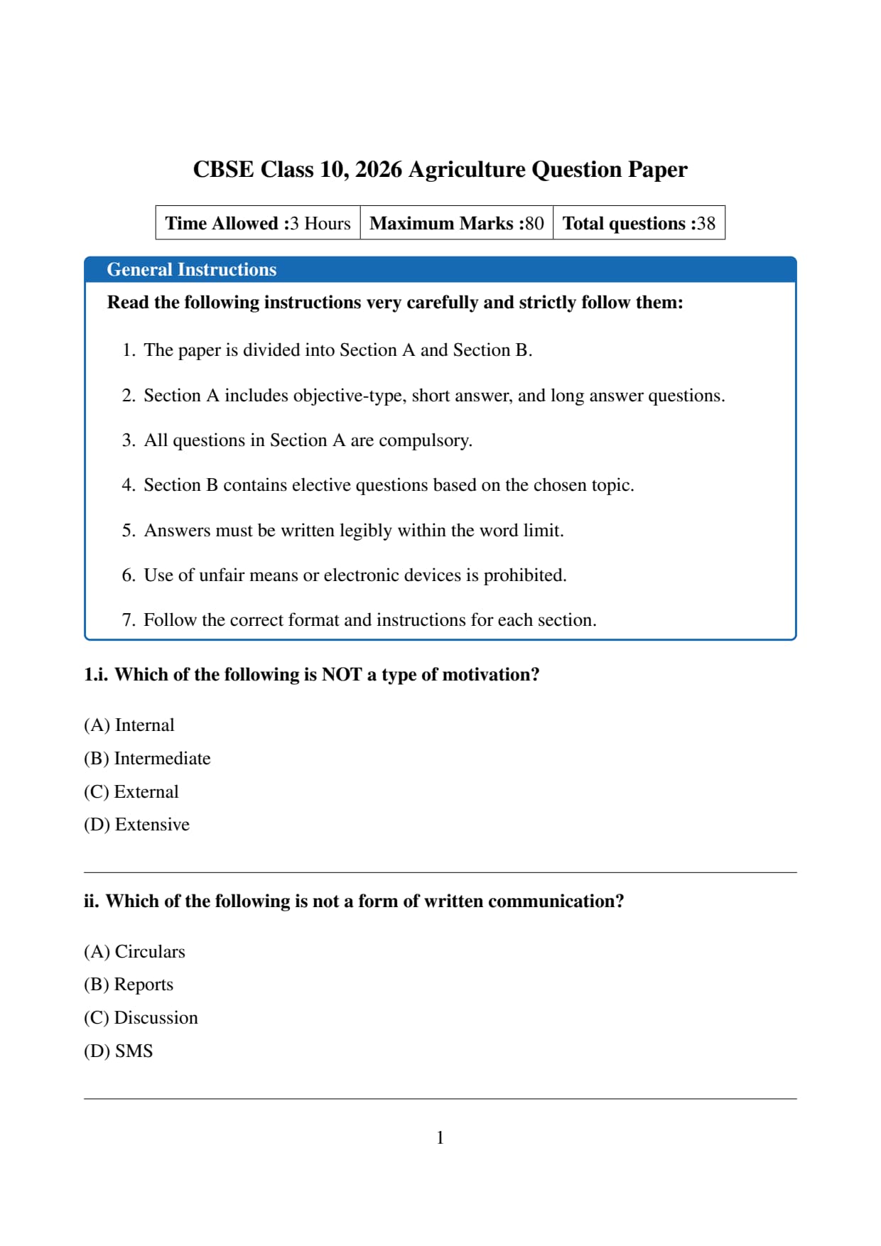 The official question paper of CBSE Class 10 Agriculture Board Exam 2026 is provided below. Students can download the official paper in PDF format for reference.