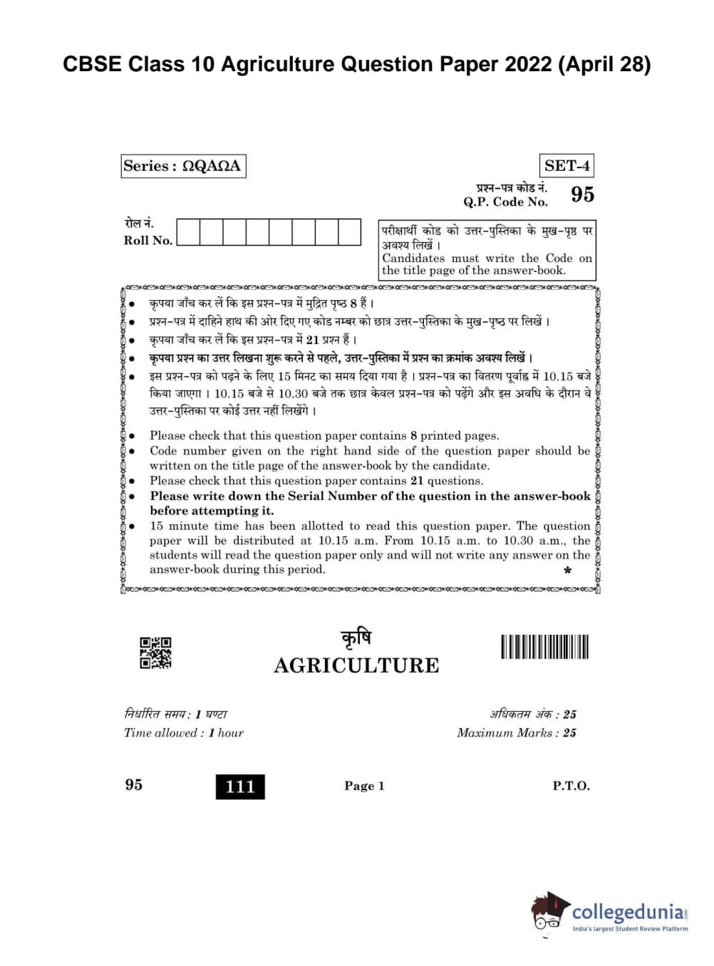 CBSE Class 10 Agriculture Question Paper 2022 with Answer Key (April 28)