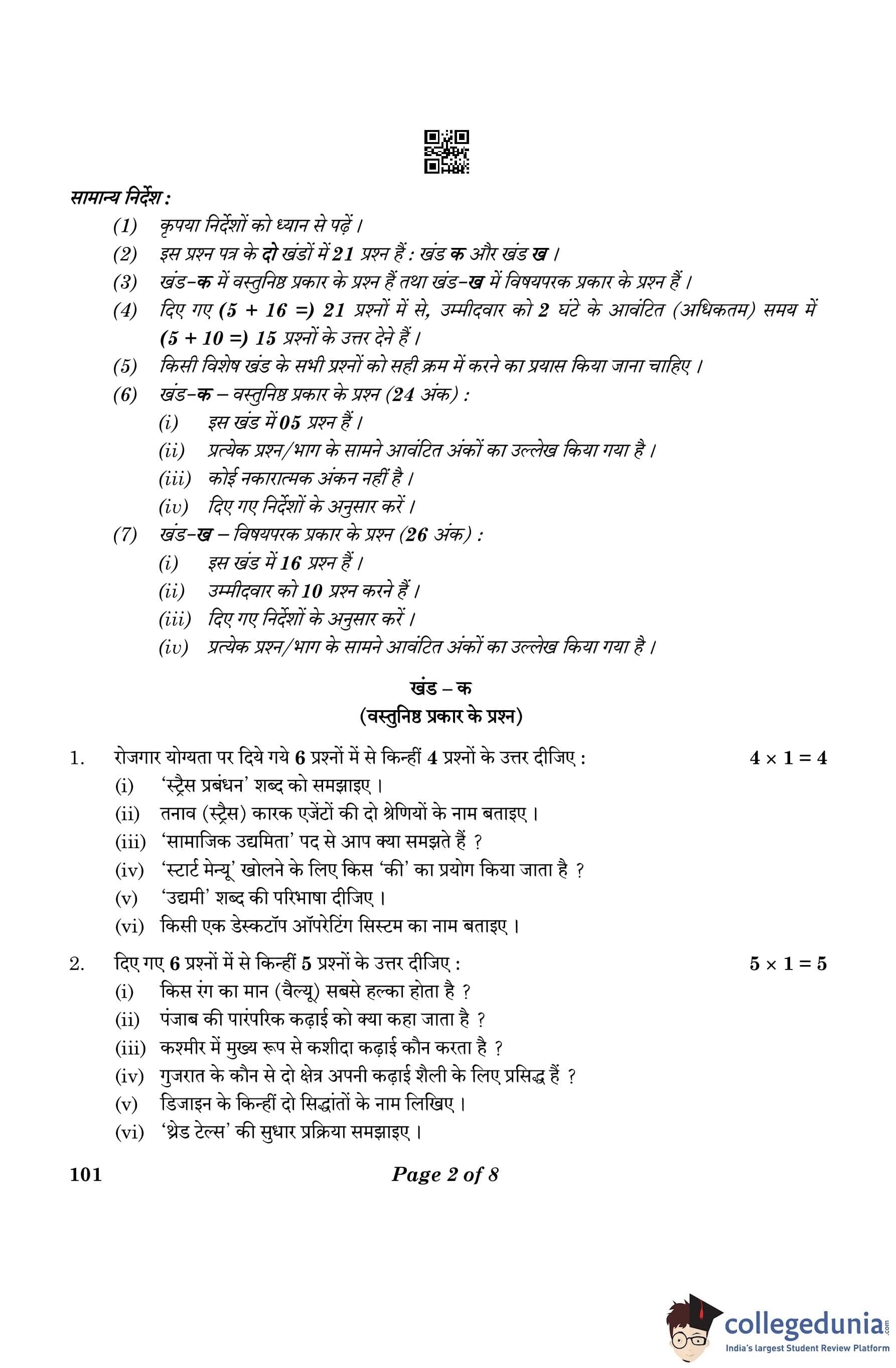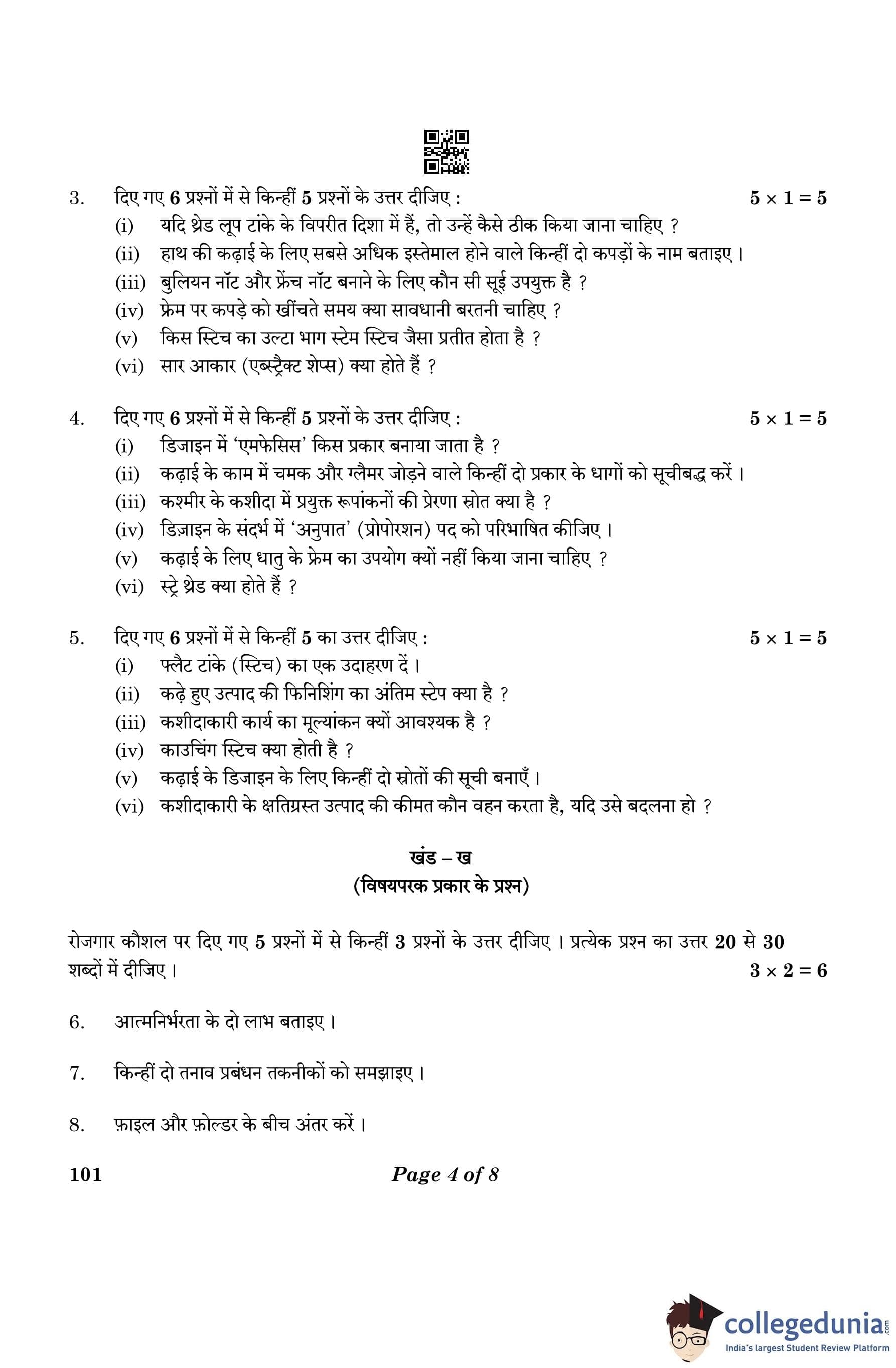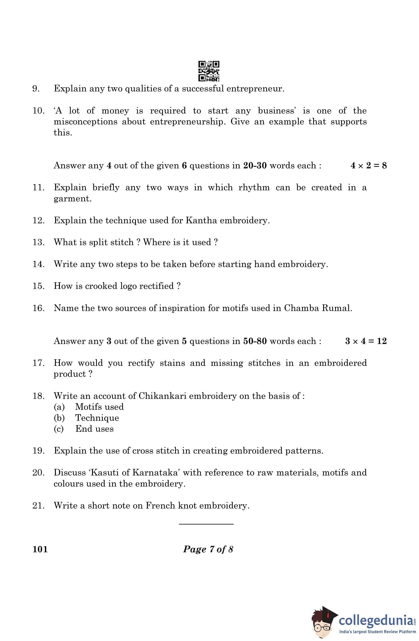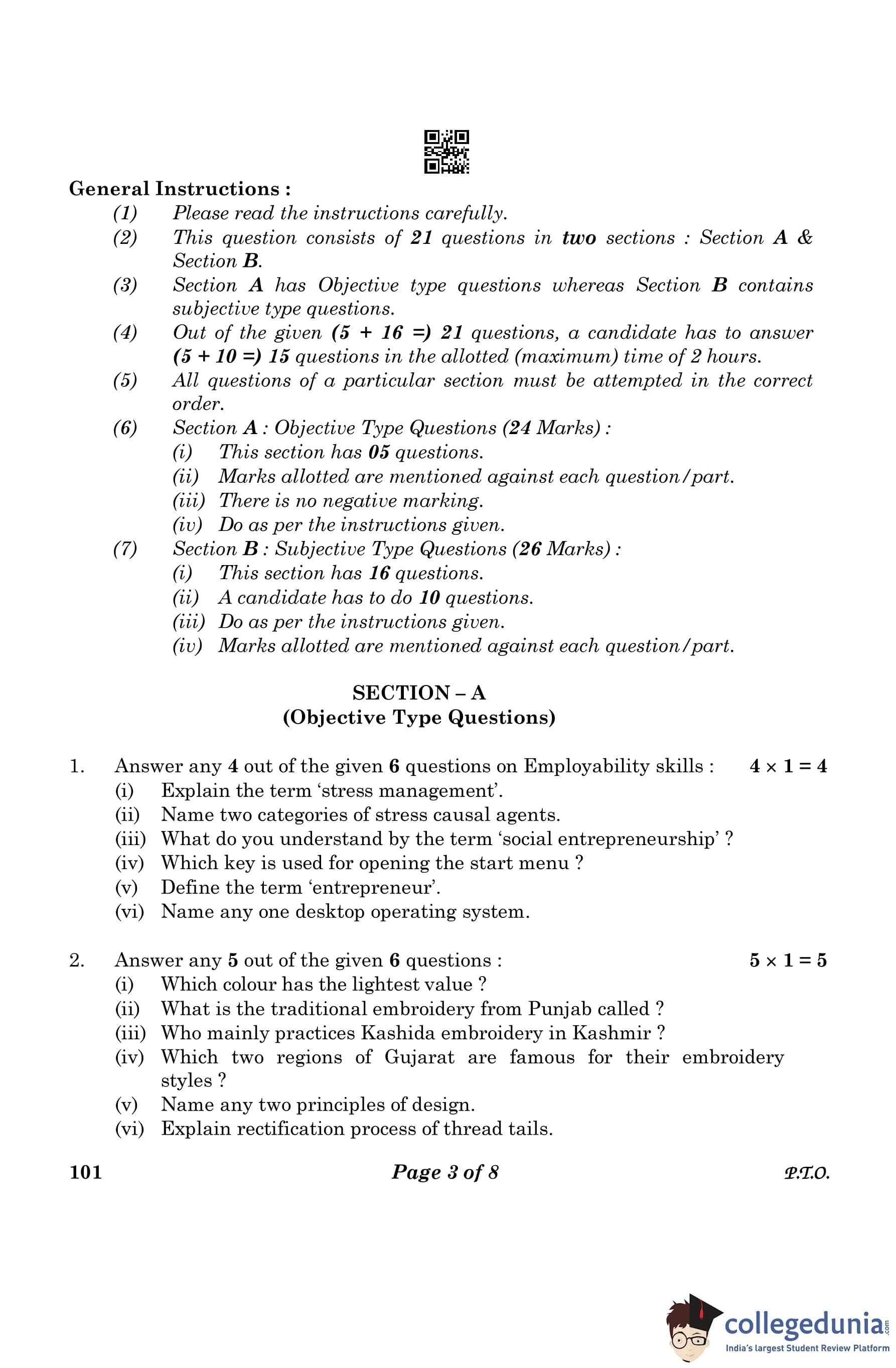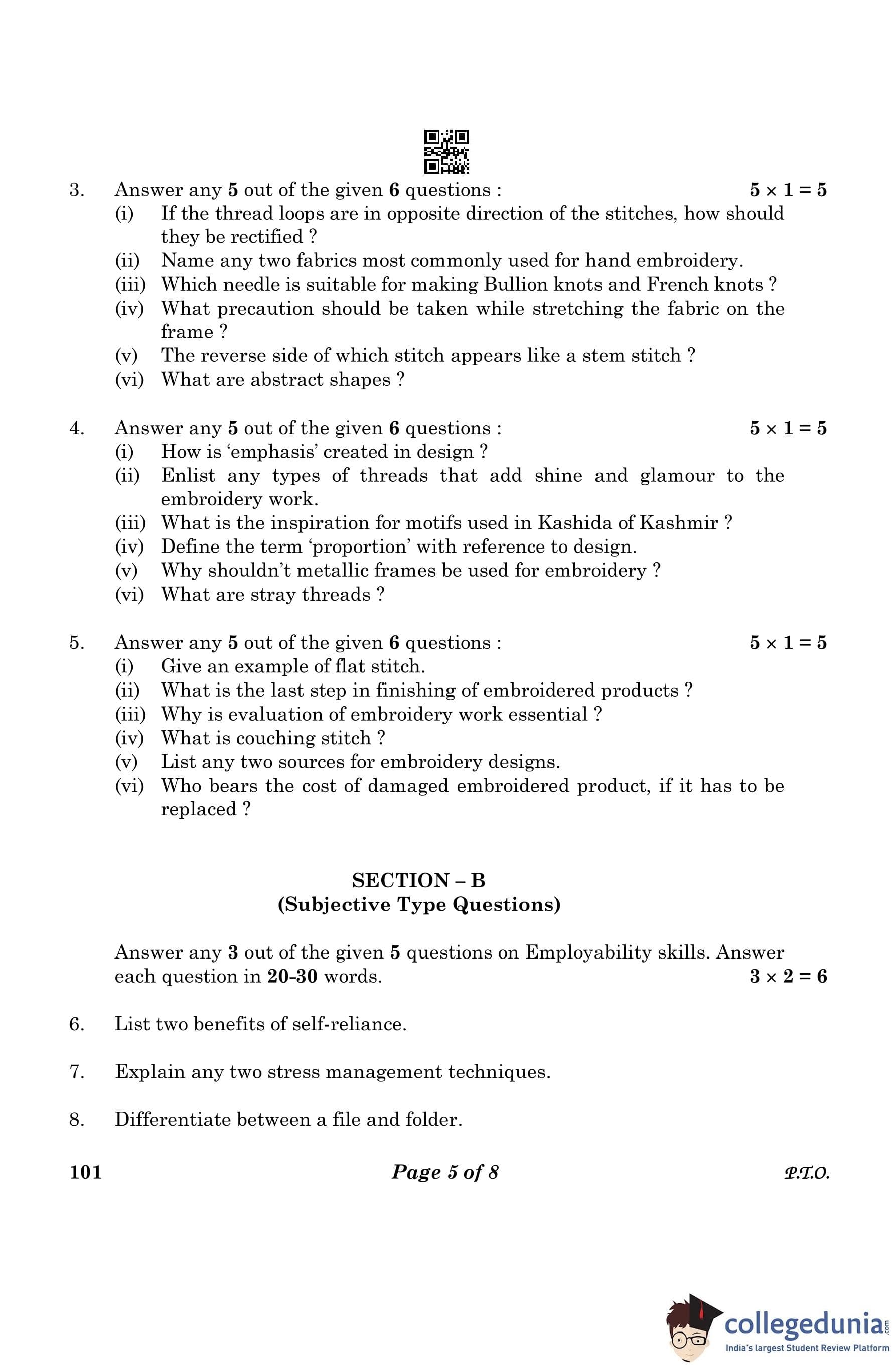 CBSE Class 10 Apparel Question Paper 2023 (Set 4- 101) with Answer Key pdf is available for download here. The exam was conducted by Central Board of Secondary Education on February 16, 2023. The question paper comprised a total of 21 questions divided among 2 sections.