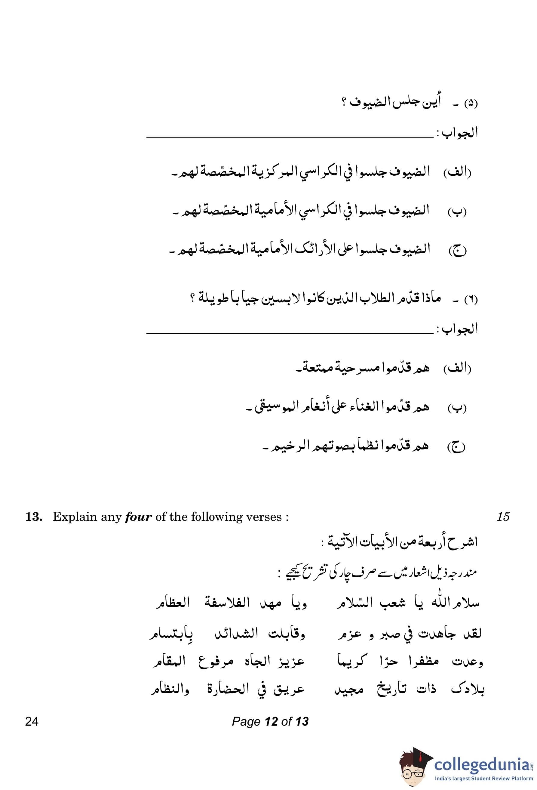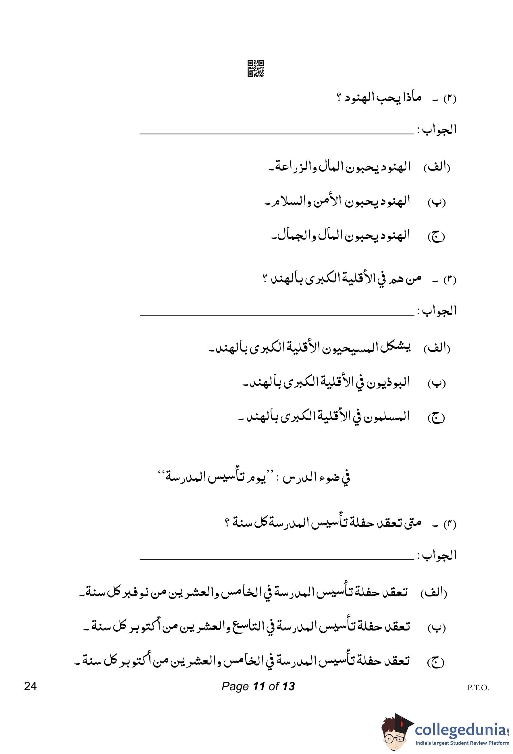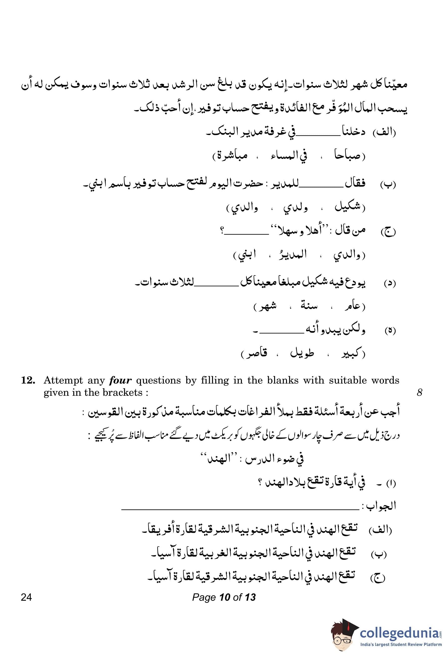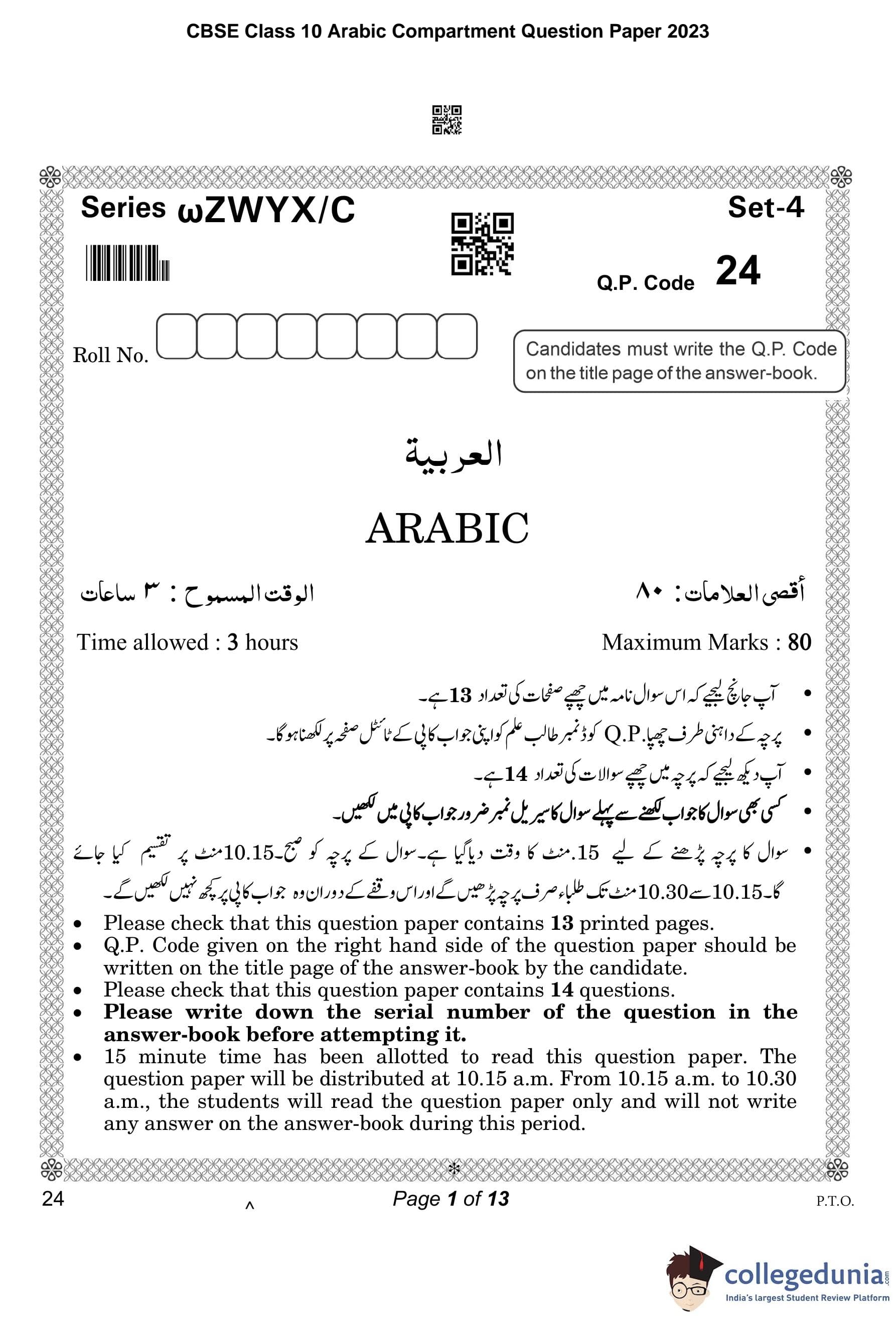 CBSE Class 10 Arabic Compartment Question Paper 2023 with Answer Key