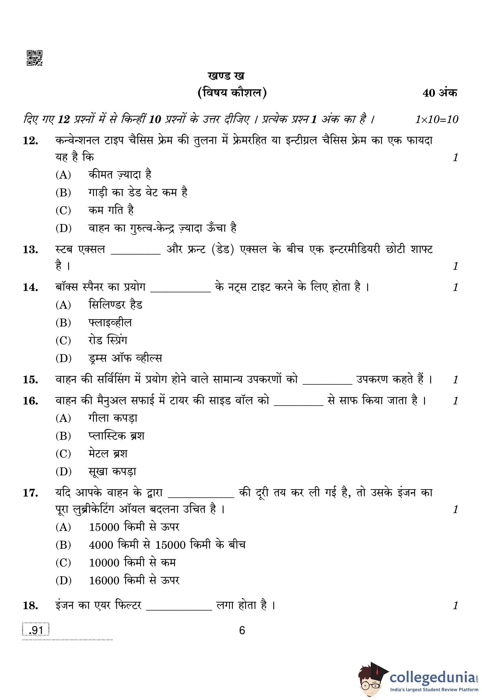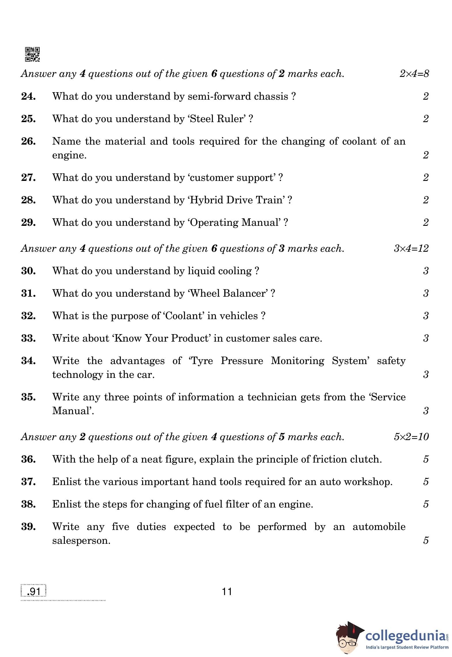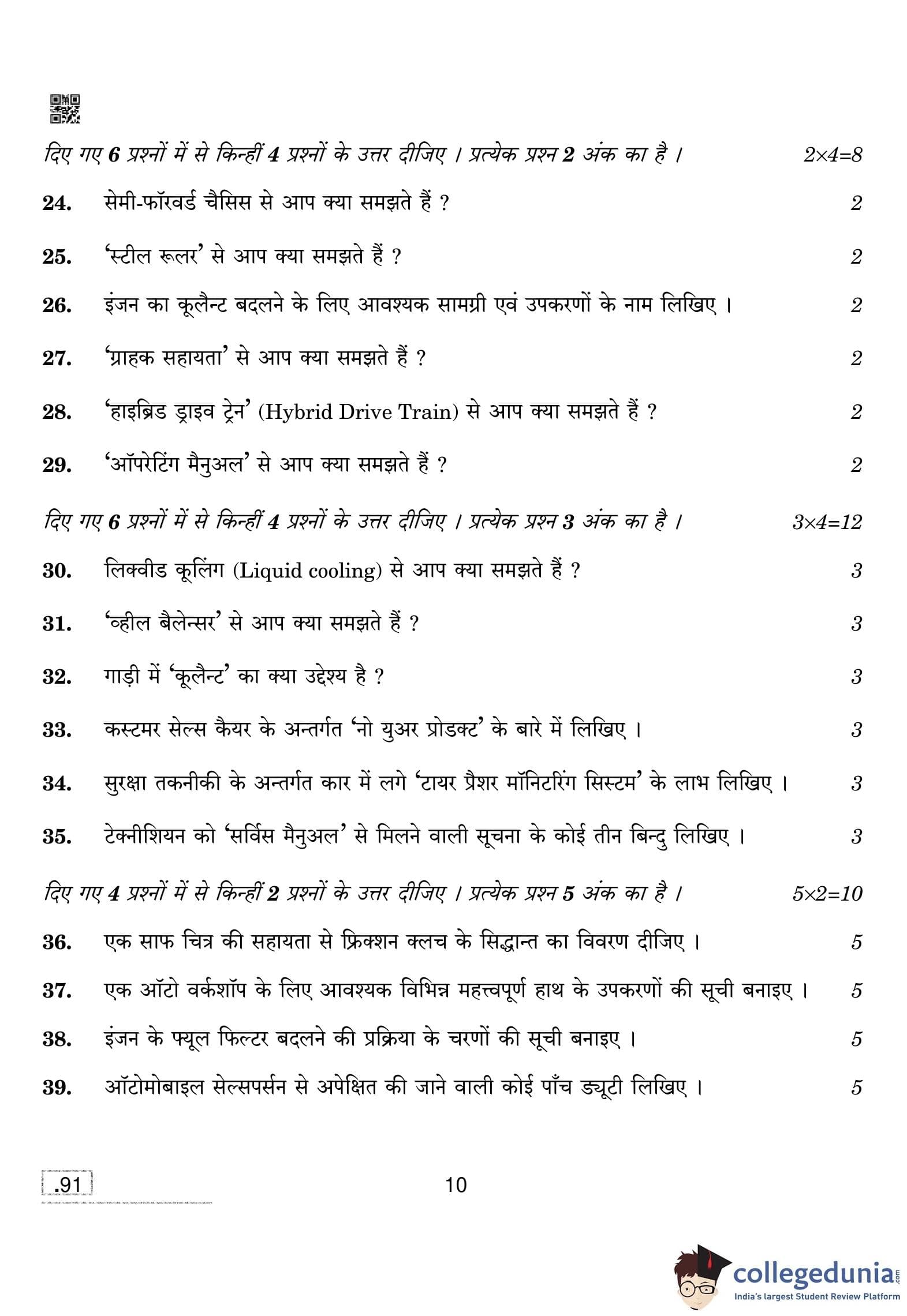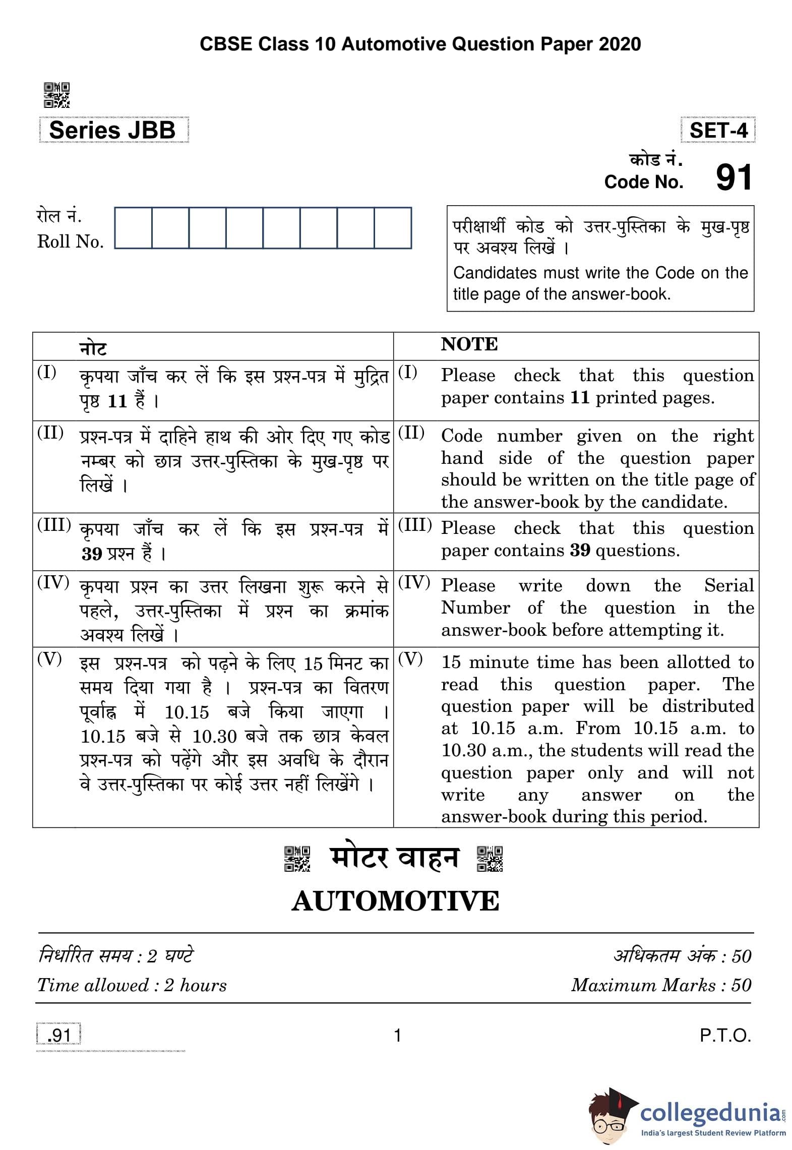 CBSE Class 10 Automotive Question Paper 2020 with Answer Key (February 15)