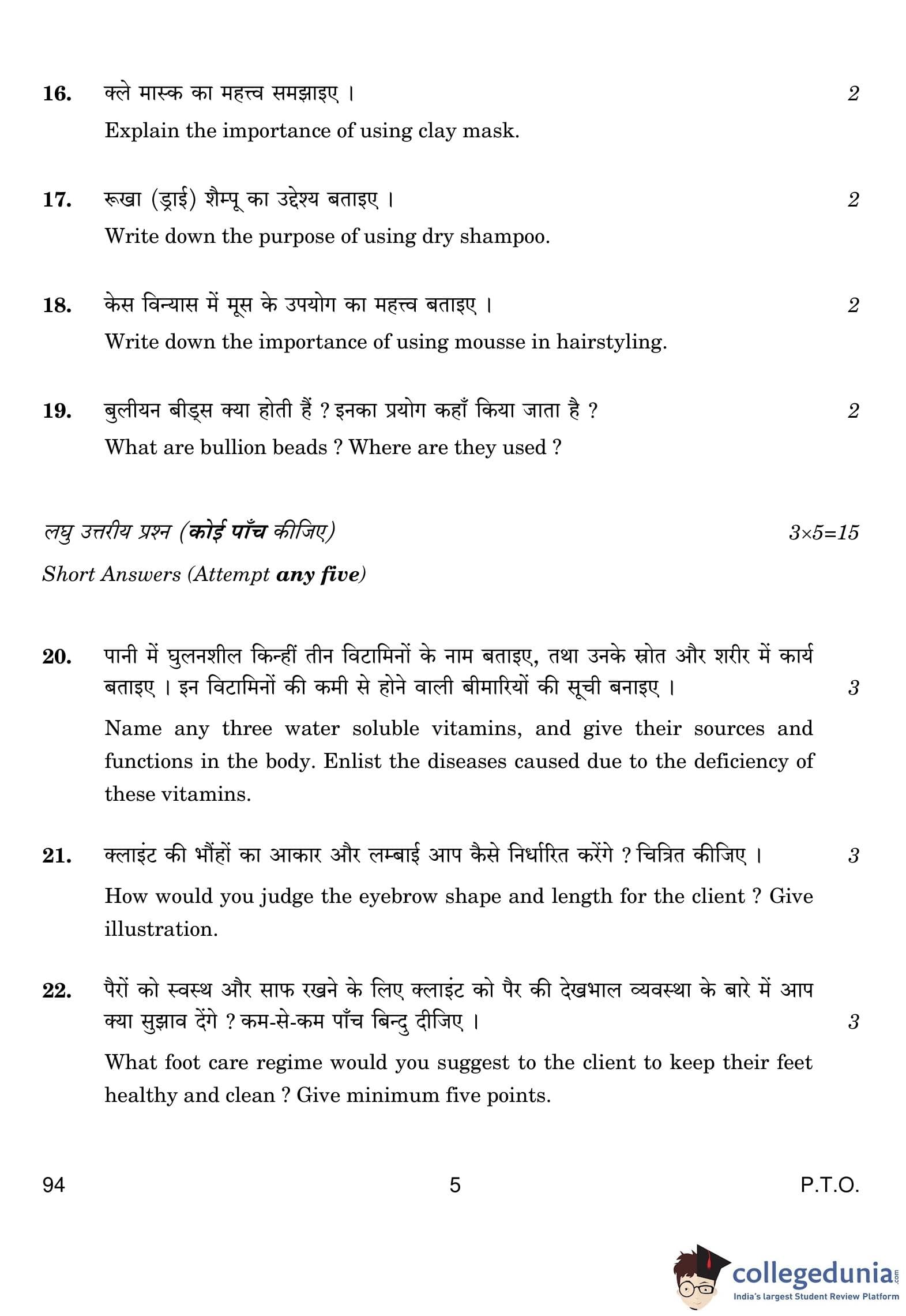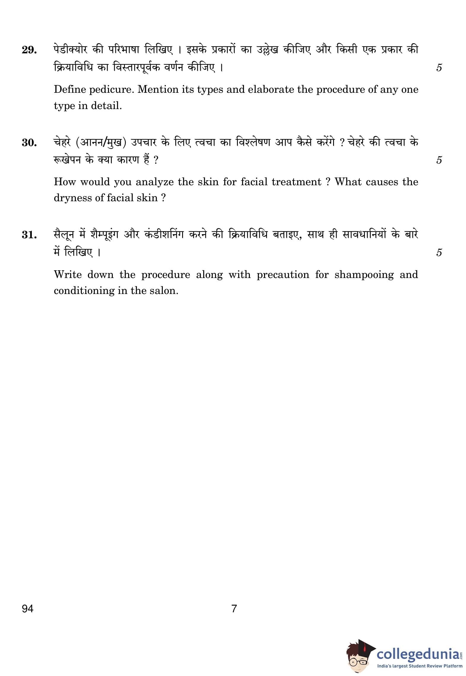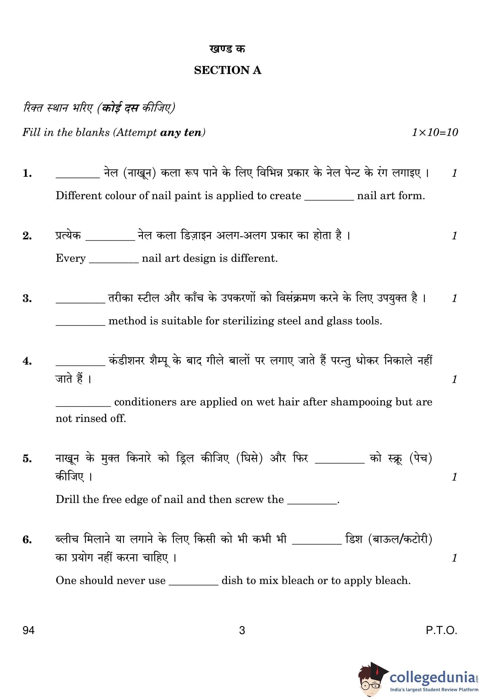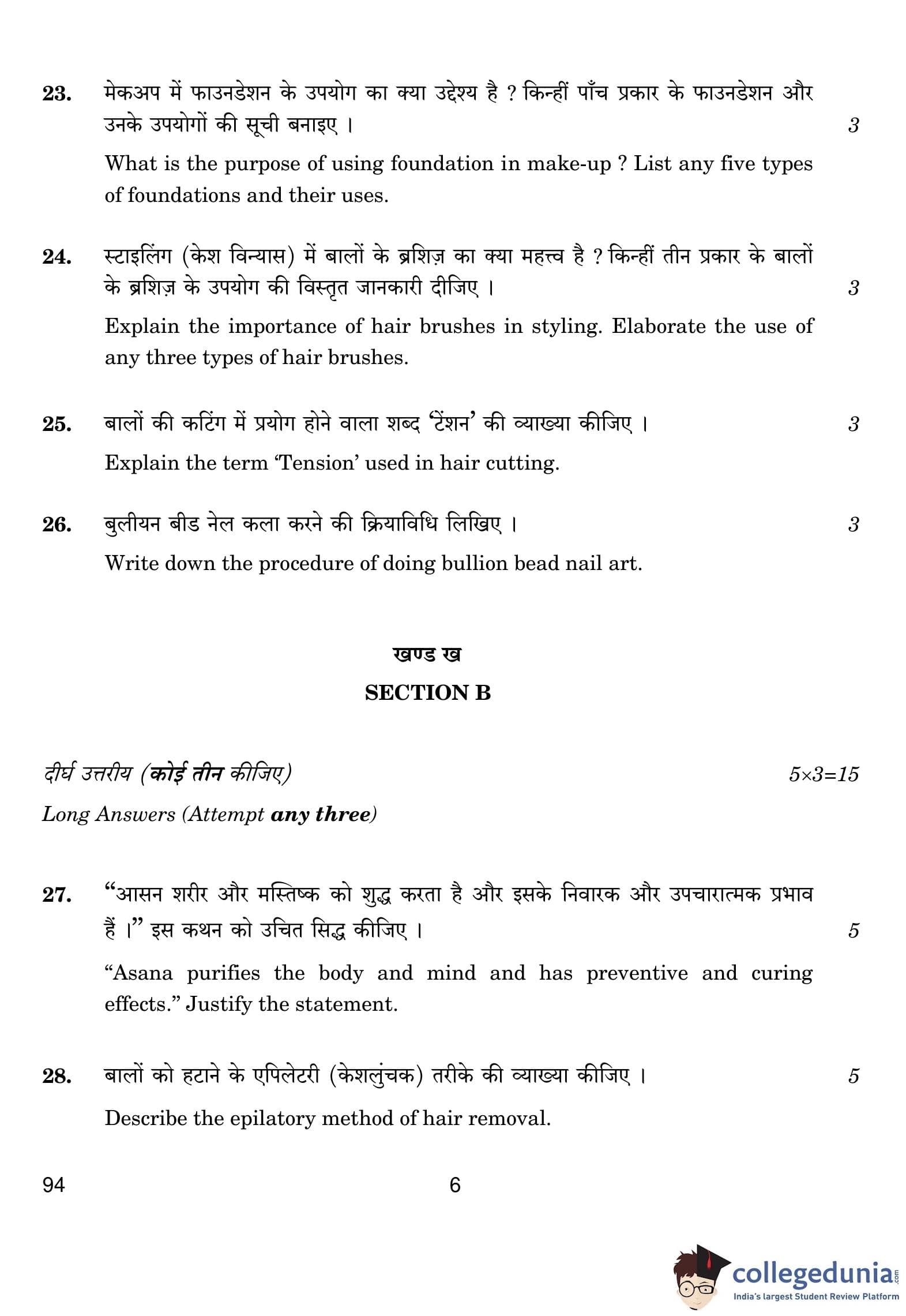 CBSE Class 10 Beauty And Wellness Question Paper 2019 with Answer Key is available for download. The exam was conducted by the Central Board of Secondary Education on February 27, 2019 in the Morning Session 10:30 AM to 12:30 PM. The medium of paper was English and Hindi. The question paper comprised a total of 31 questions divided among 2 sections.