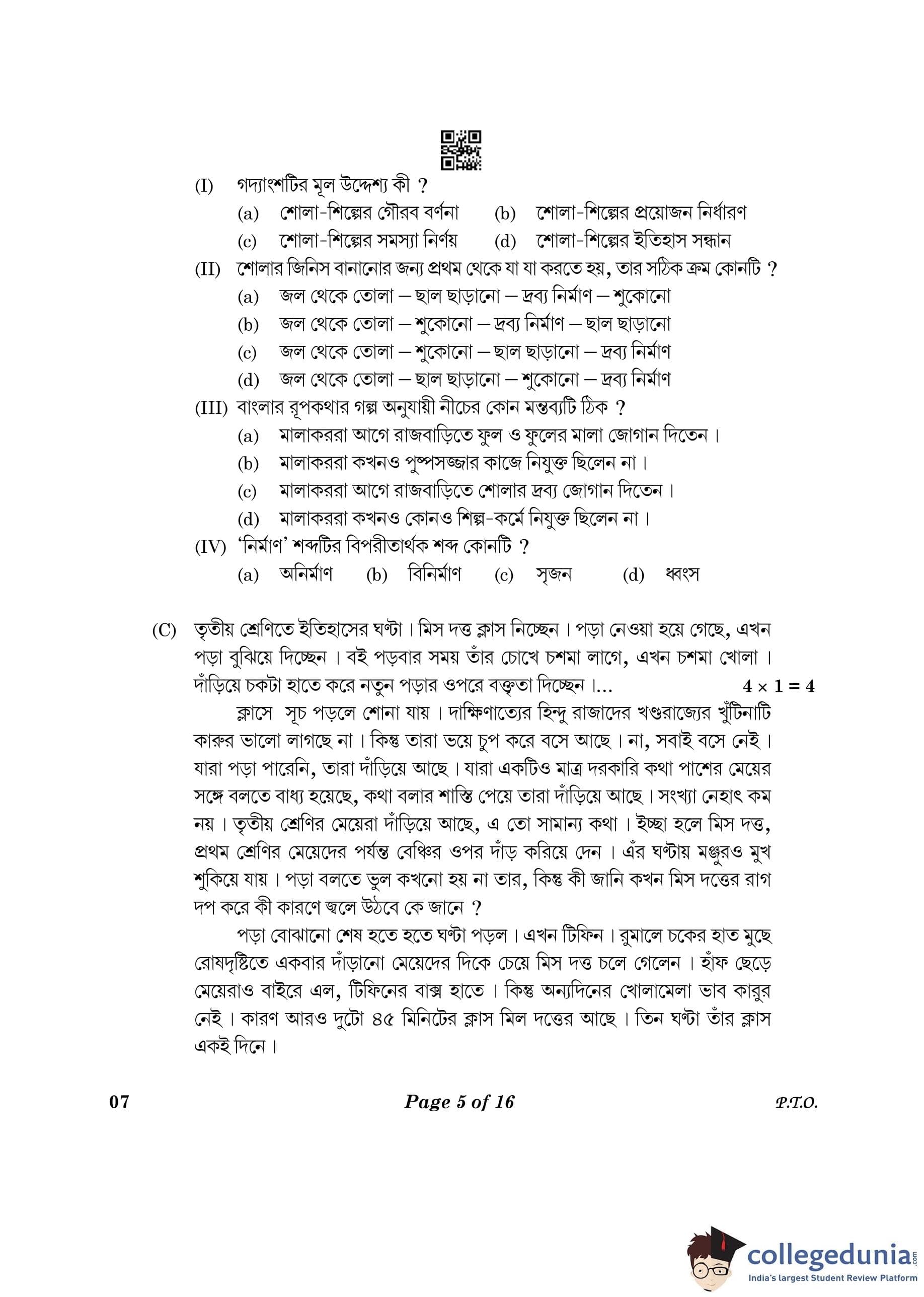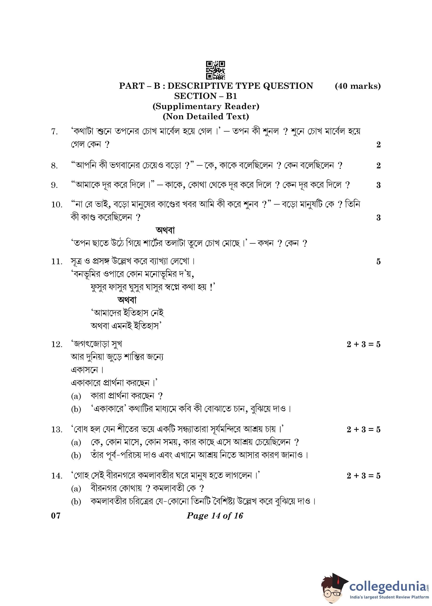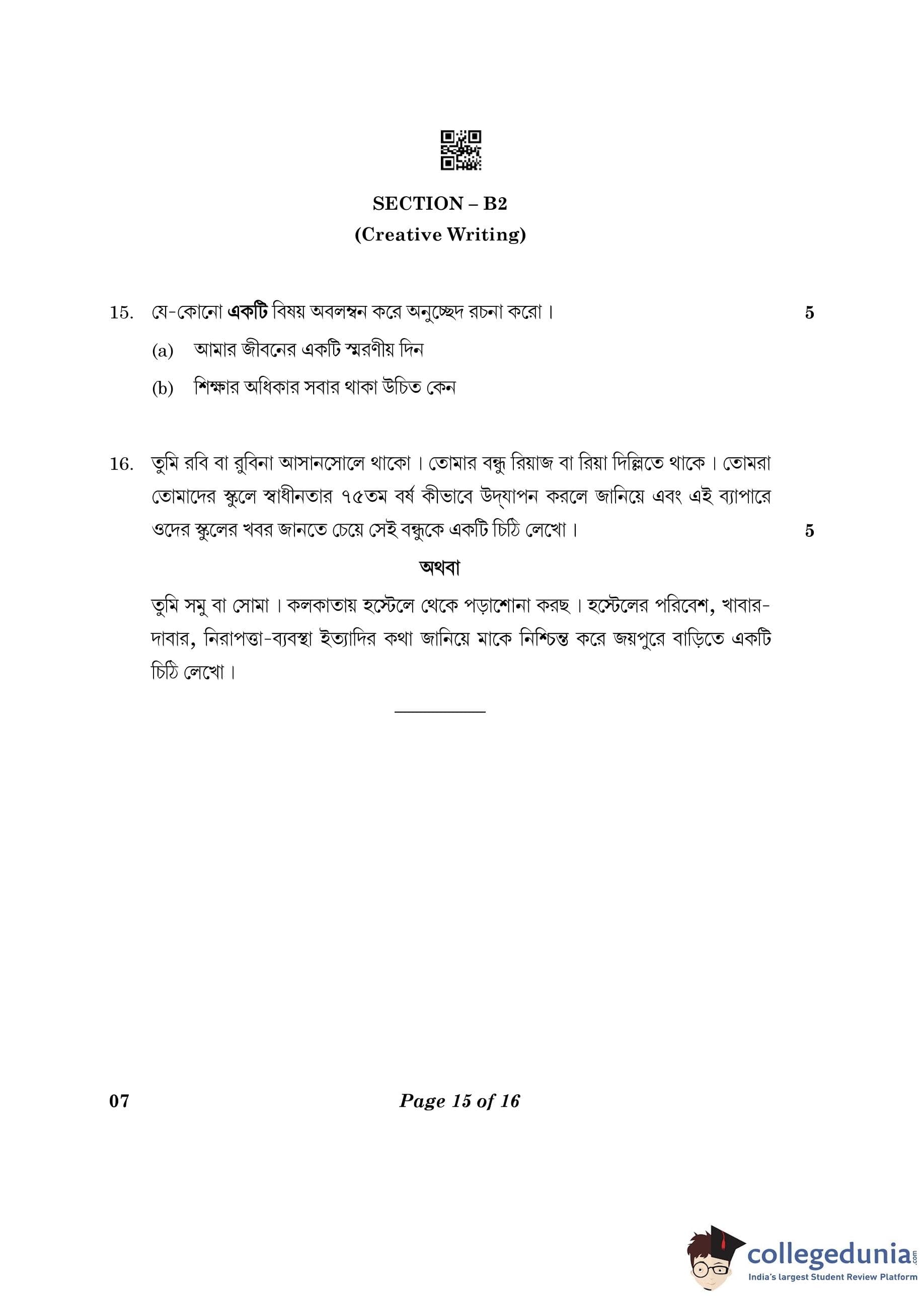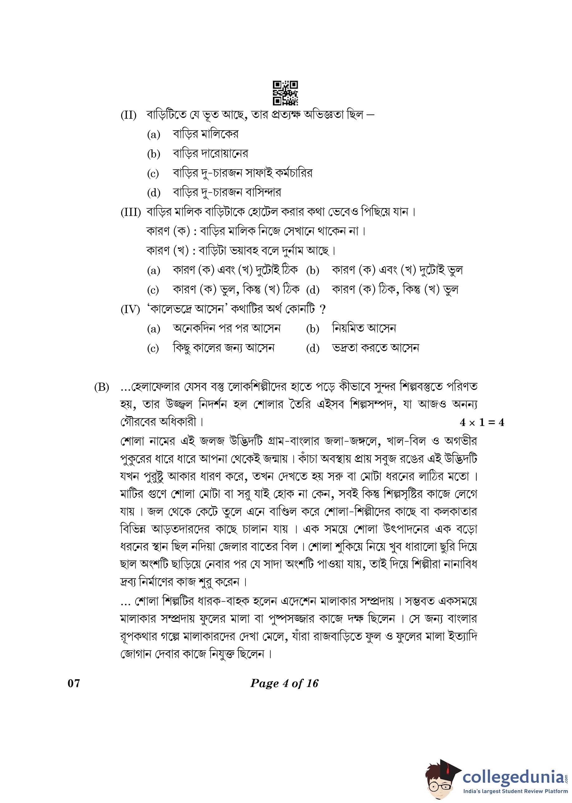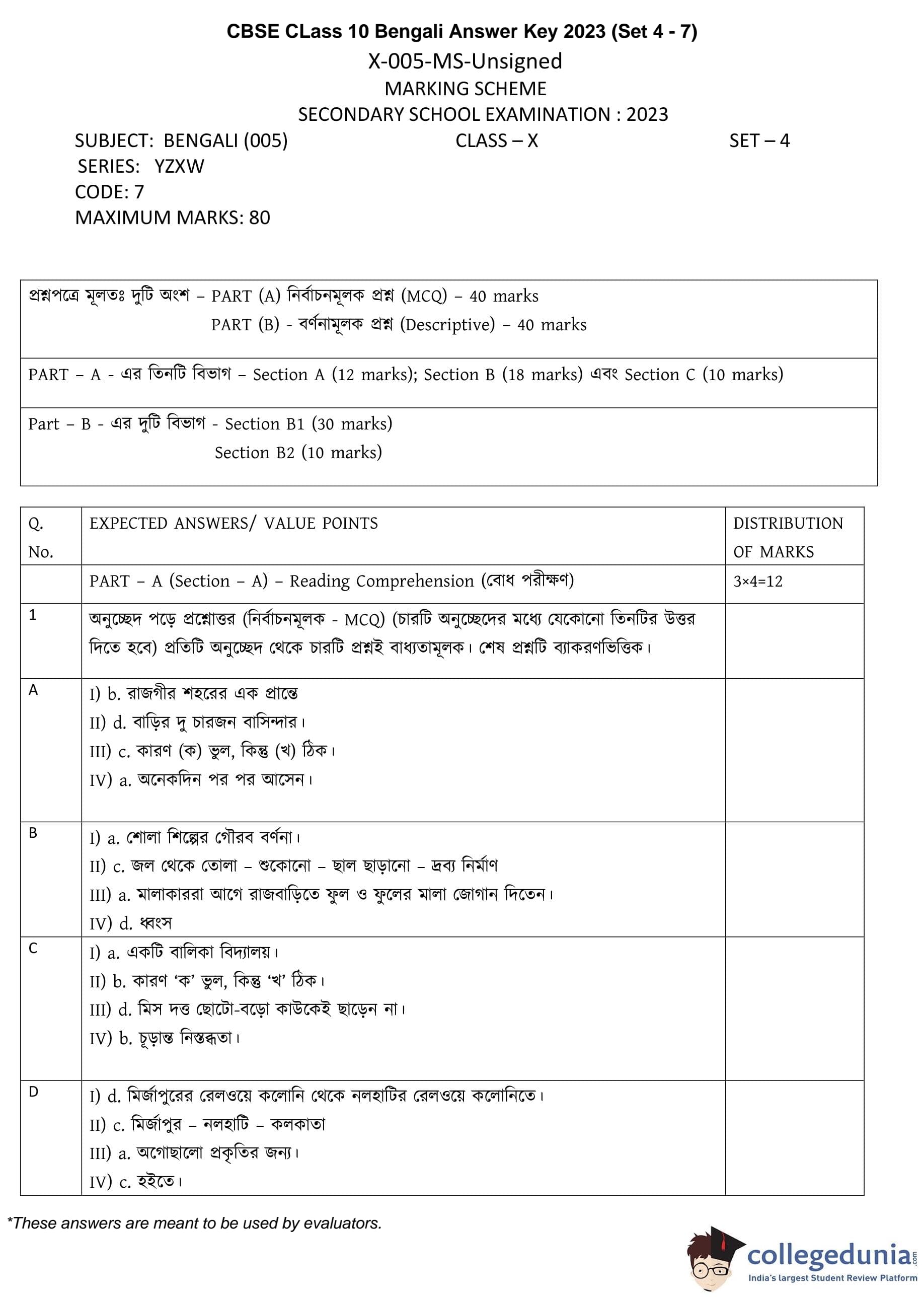 CBSE Class 10 Bengali Question Paper 2023 (Set 4- 7) with Answer Key pdf is available for download here. The exam was conducted by Central Board of Secondary Education on February 24, 2023. The question paper comprised a total of 16 questions divided among 2 sections.