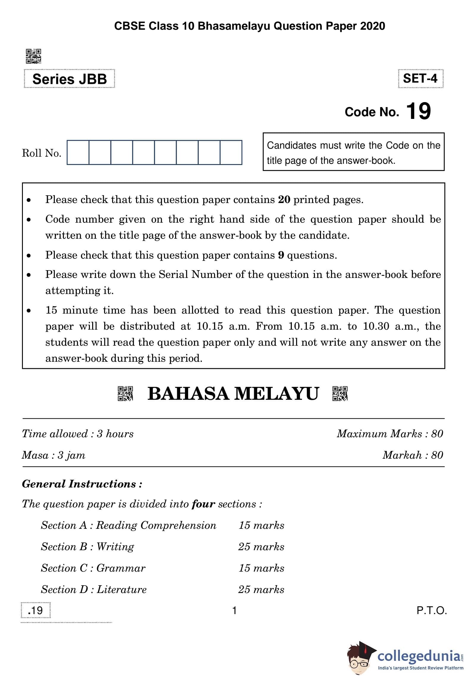 CBSE Class 10 Bhasamelayu Question Paper 2020 with Answer Key Set 4 is available for download. The exam was conducted by the Central Board of Secondary Education on February 24, 2020 in the Morning Session 10:30 AM to 1:30 PM. The medium of paper was Bhasamelayu. The question paper comprised a total of 9 questions divided among 4 sections.