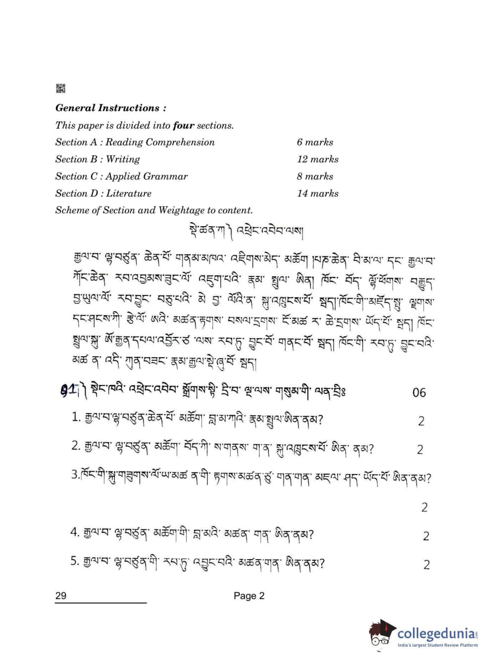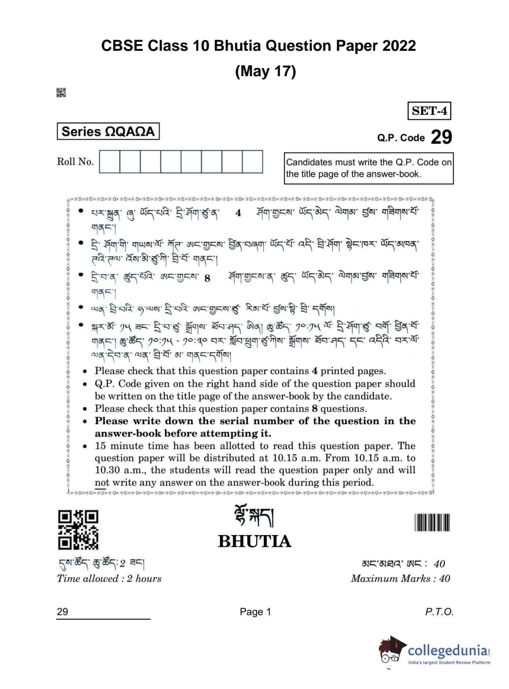 CBSE Class 10 Bhutia Question Paper 2022 with Answer Key (May 17)
