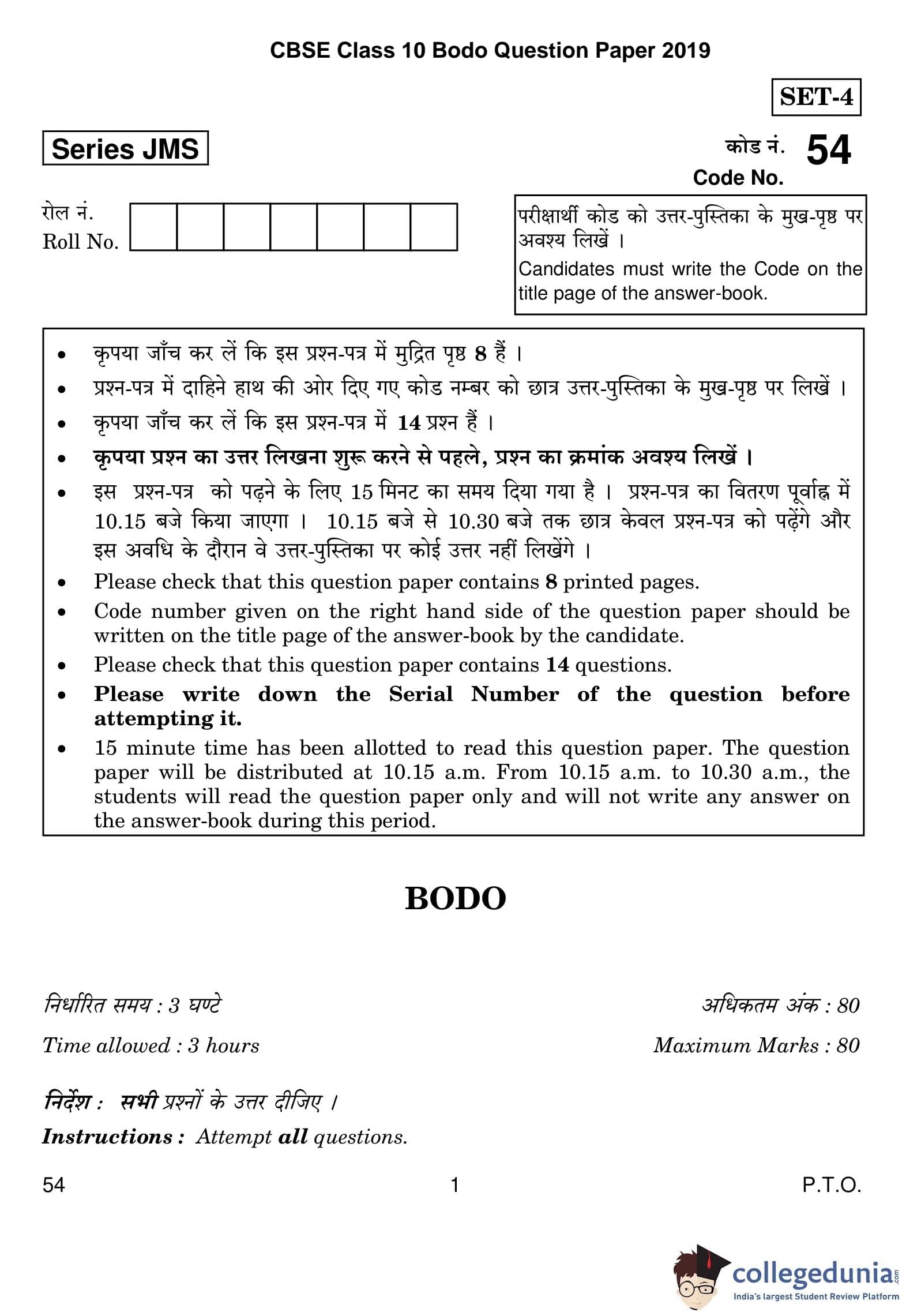 | CBSE Class 10 Bodo Question Paper 2019 PDF | CBSE Class 10 Bodo Answer Key 2019 PDF |