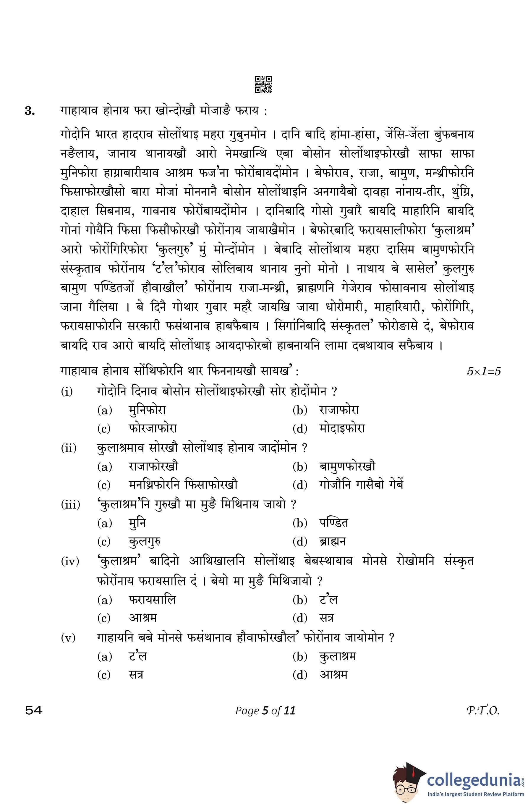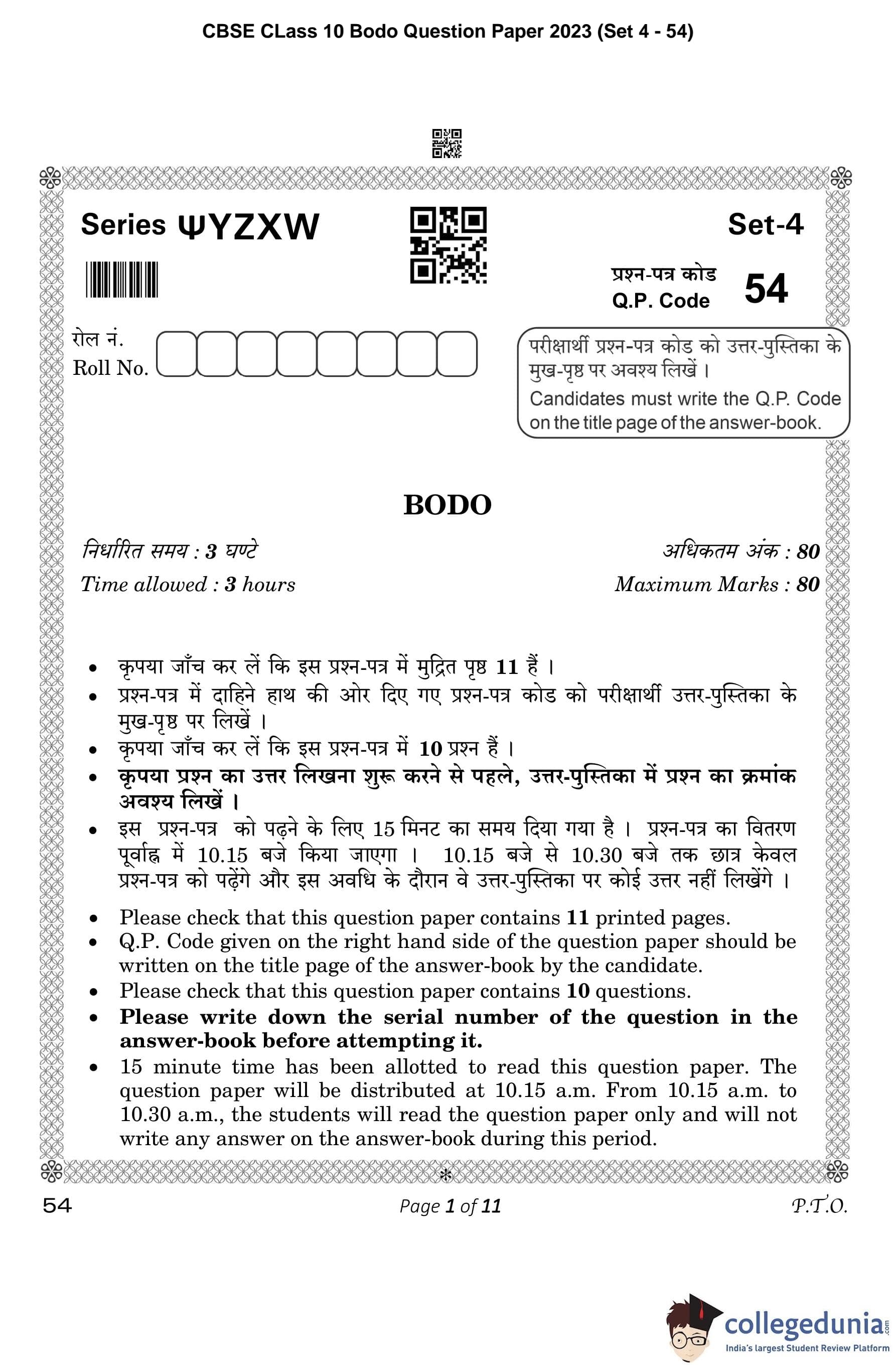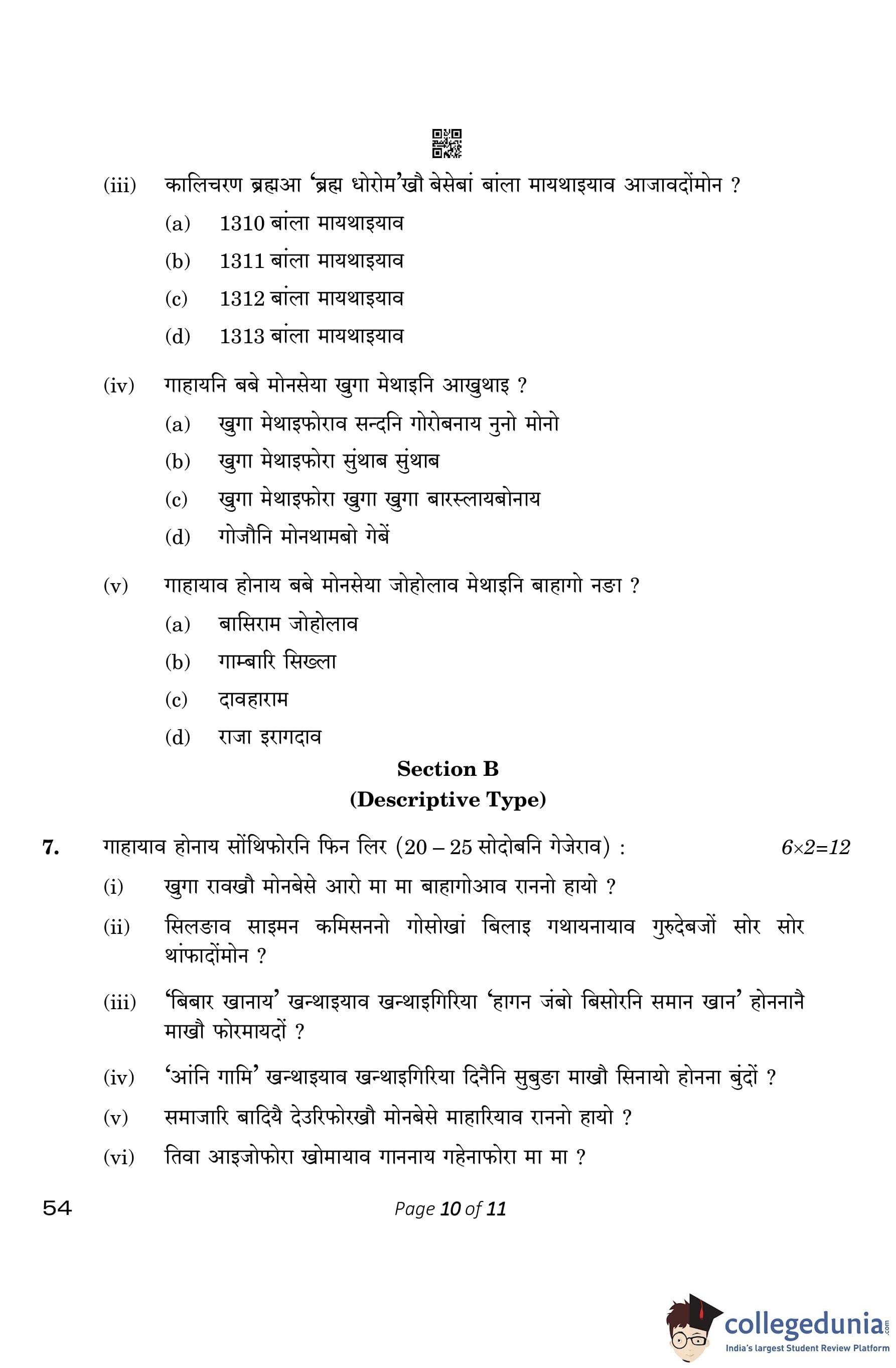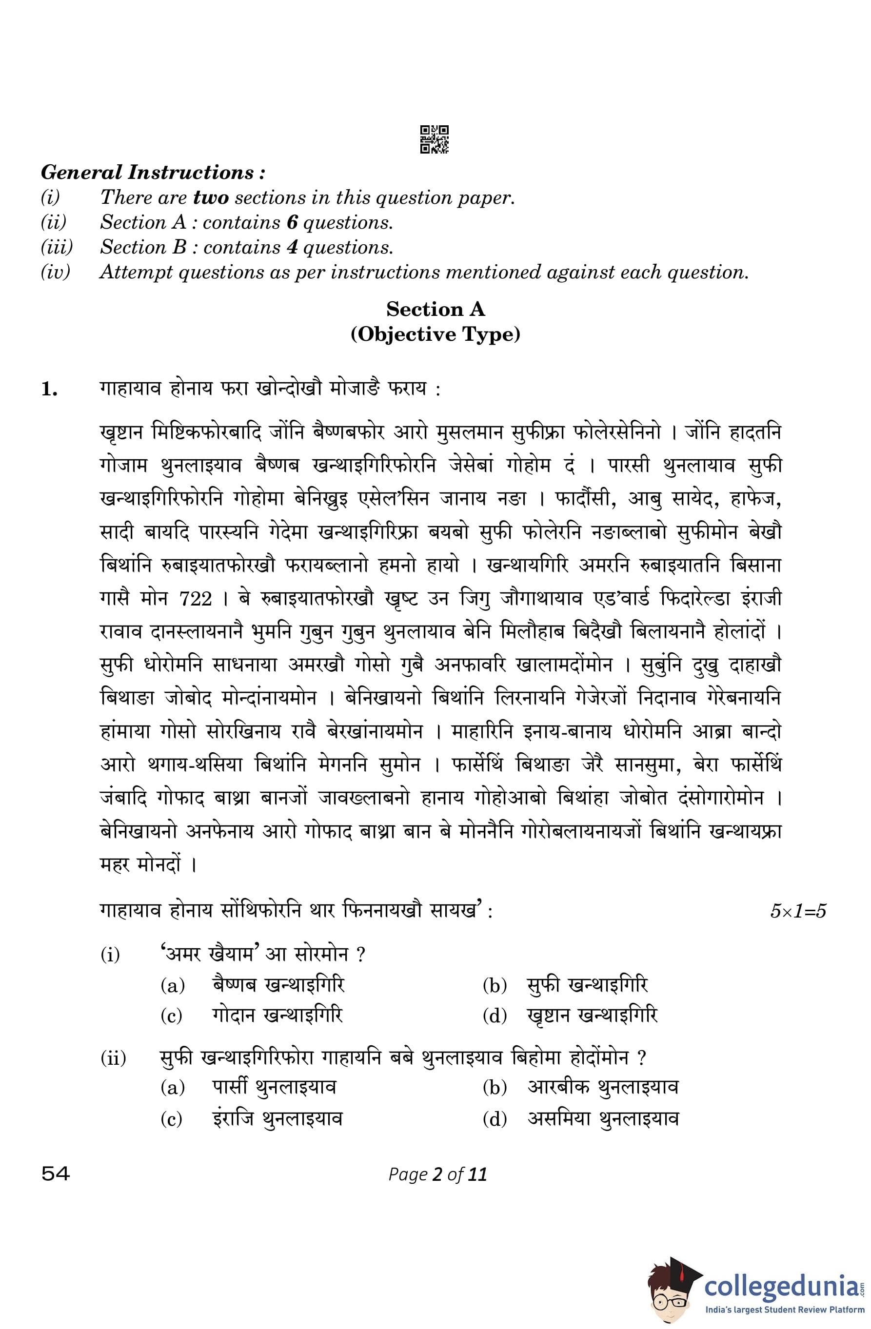 CBSE Class 10 Bodo Question Paper 2023 (Set 4- 54) with Answer Key pdf is available for download here. The exam was conducted by Central Board of Secondary Education on March 2, 2023. The question paper comprised a total of 10 questions divided among 2 sections.