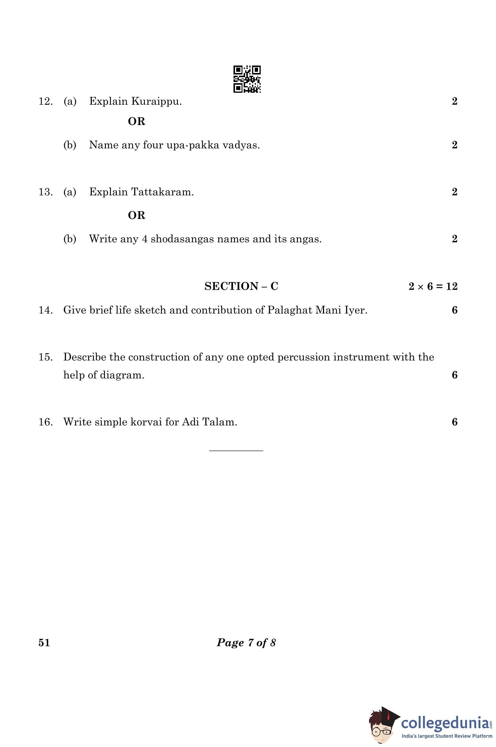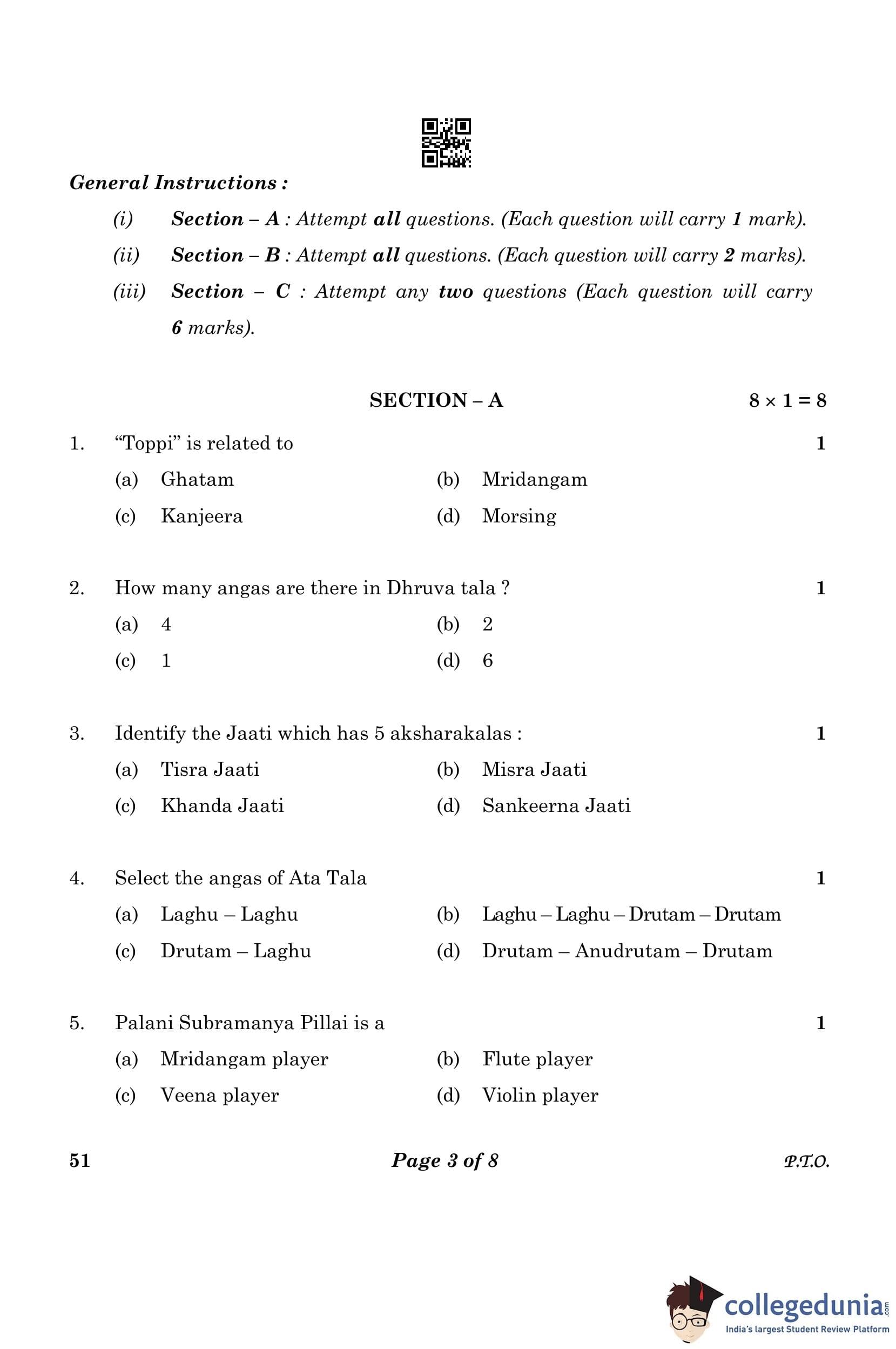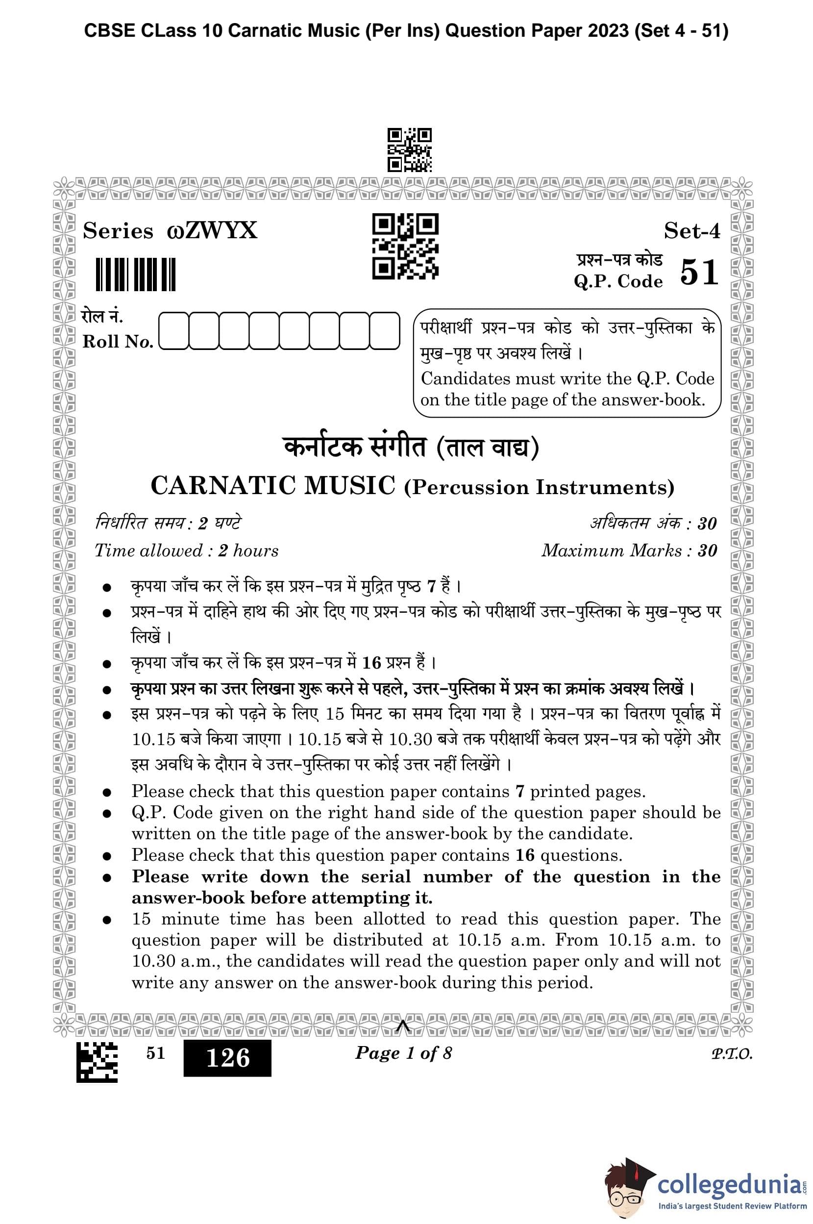 CBSE Class 10 Carnatic Music (Per Ins) Question Paper 2023 (Set 4- 51) with Answer Key pdf is available for download here. The exam was conducted by Central Board of Secondary Education on February 20, 2023. The question paper comprised a total of 16 questions divided among 3 sections.