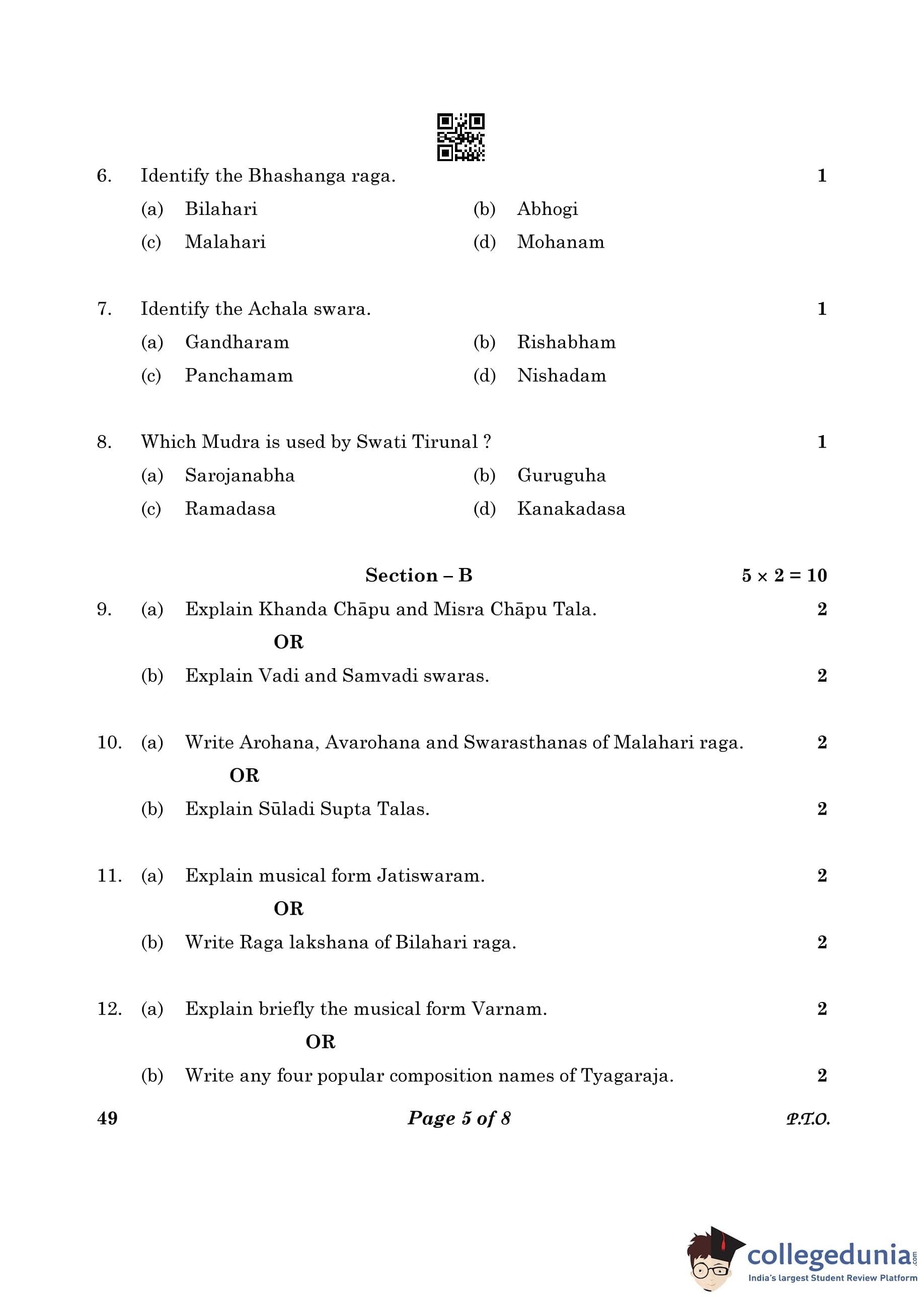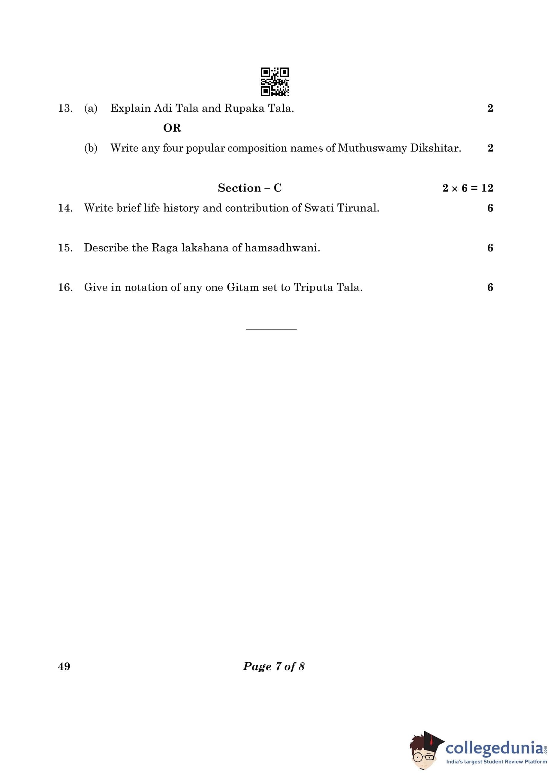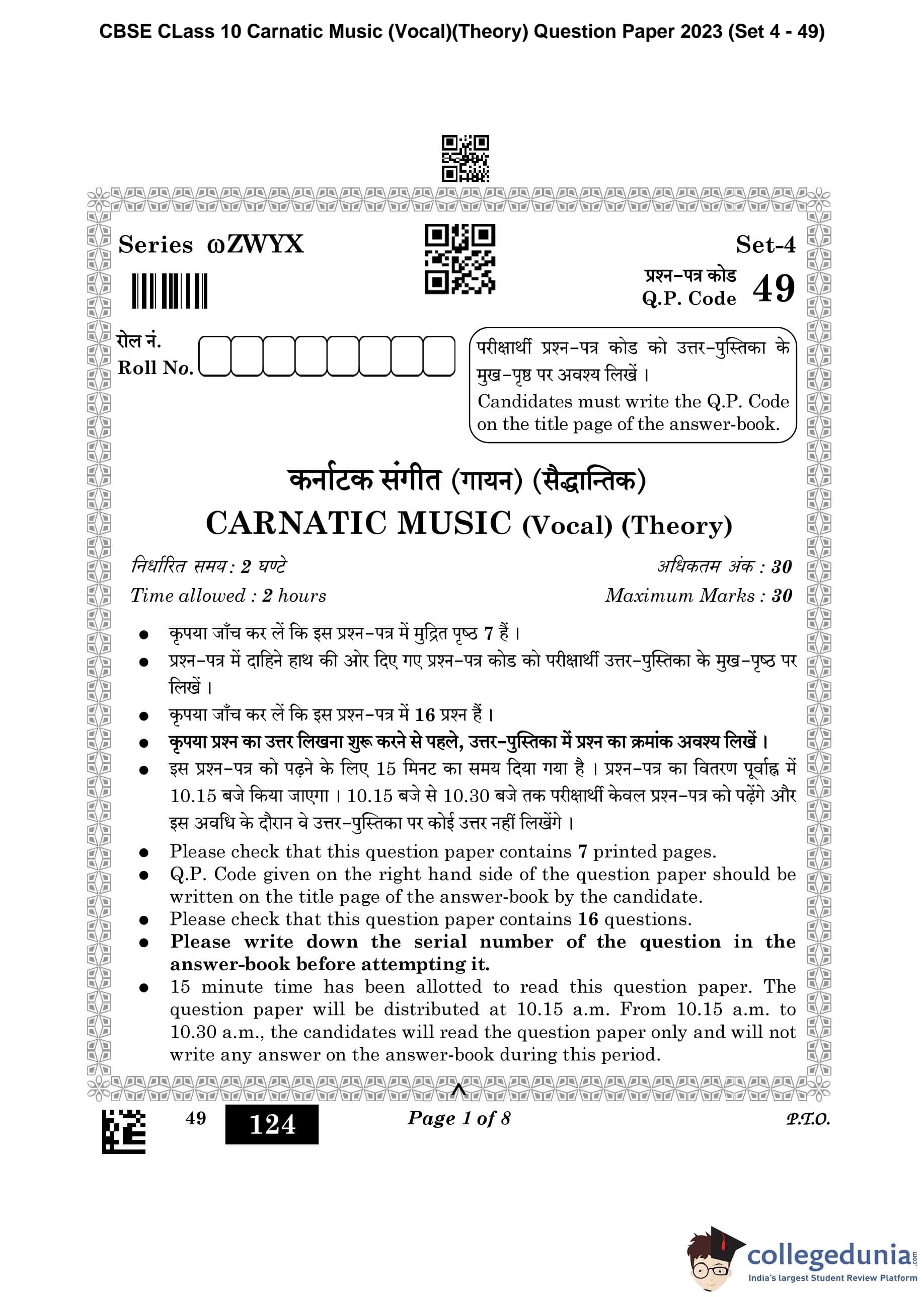 CBSE Class 10 Carnatic Music (Vocal) (Theory) Question Paper 2023 (Set 4- 49) with Answer Key pdf is available for download here. The exam was conducted by Central Board of Secondary Education on February 20, 2023. The question paper comprised a total of 16 questions divided among 3 sections.