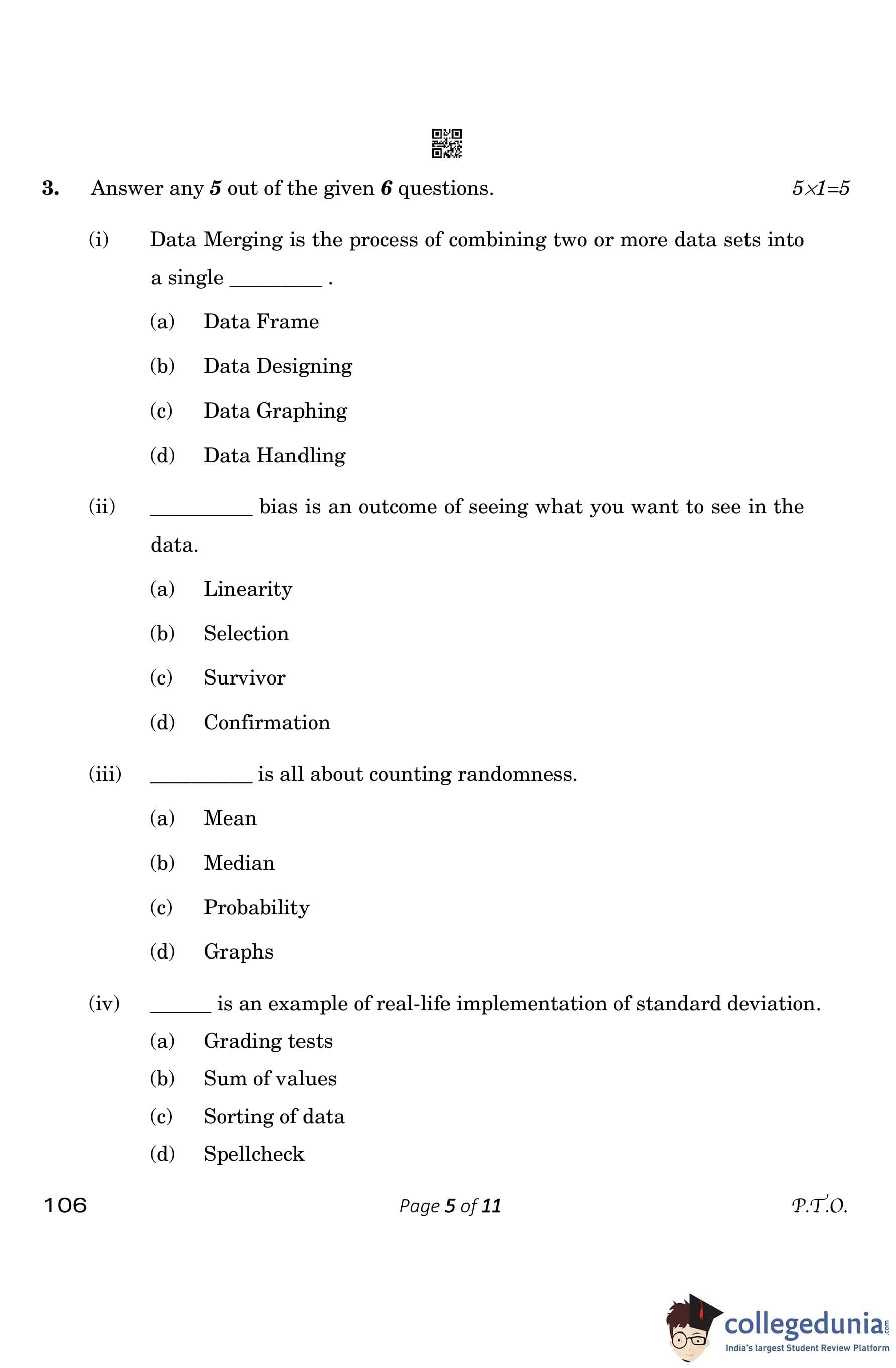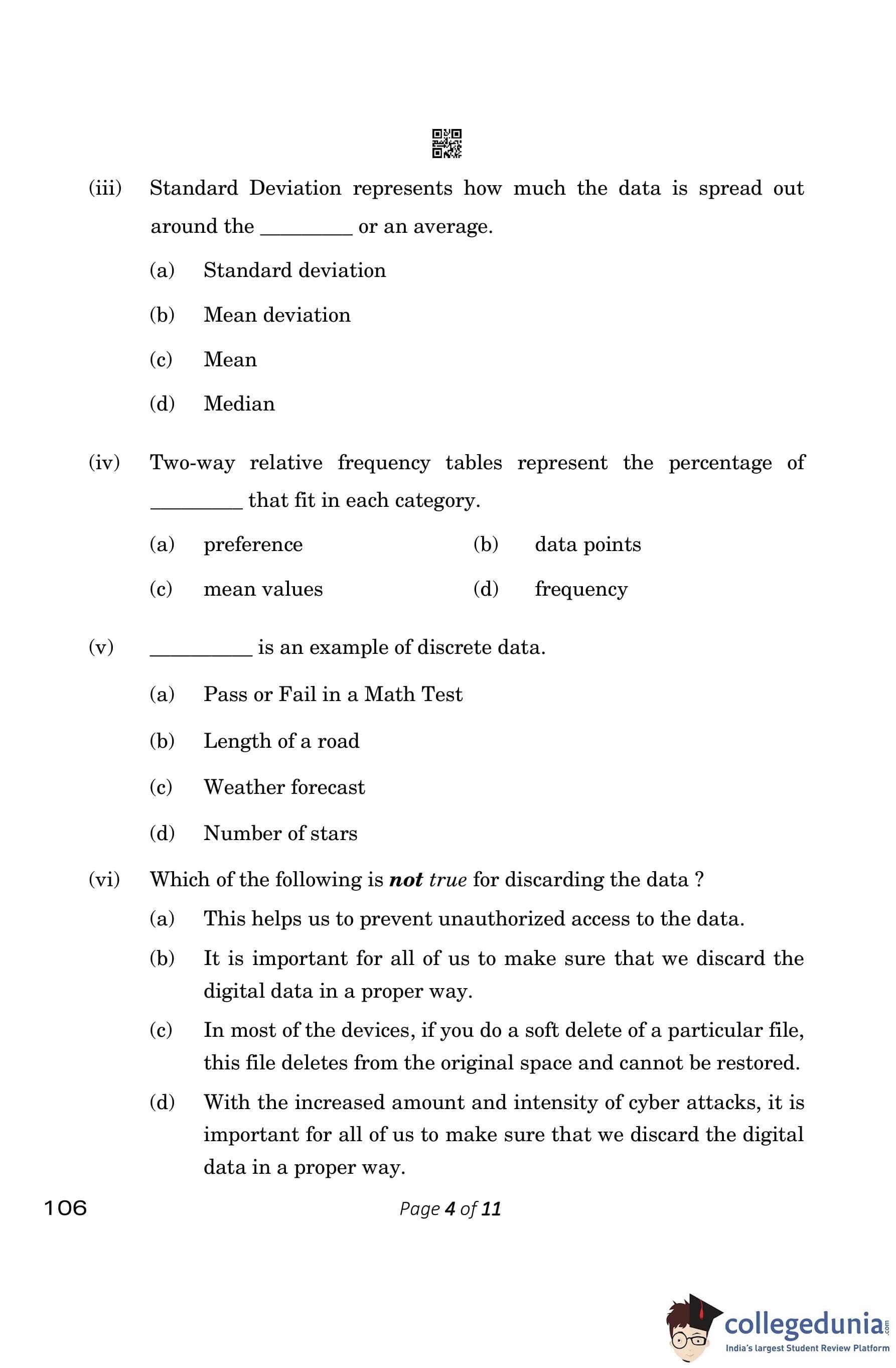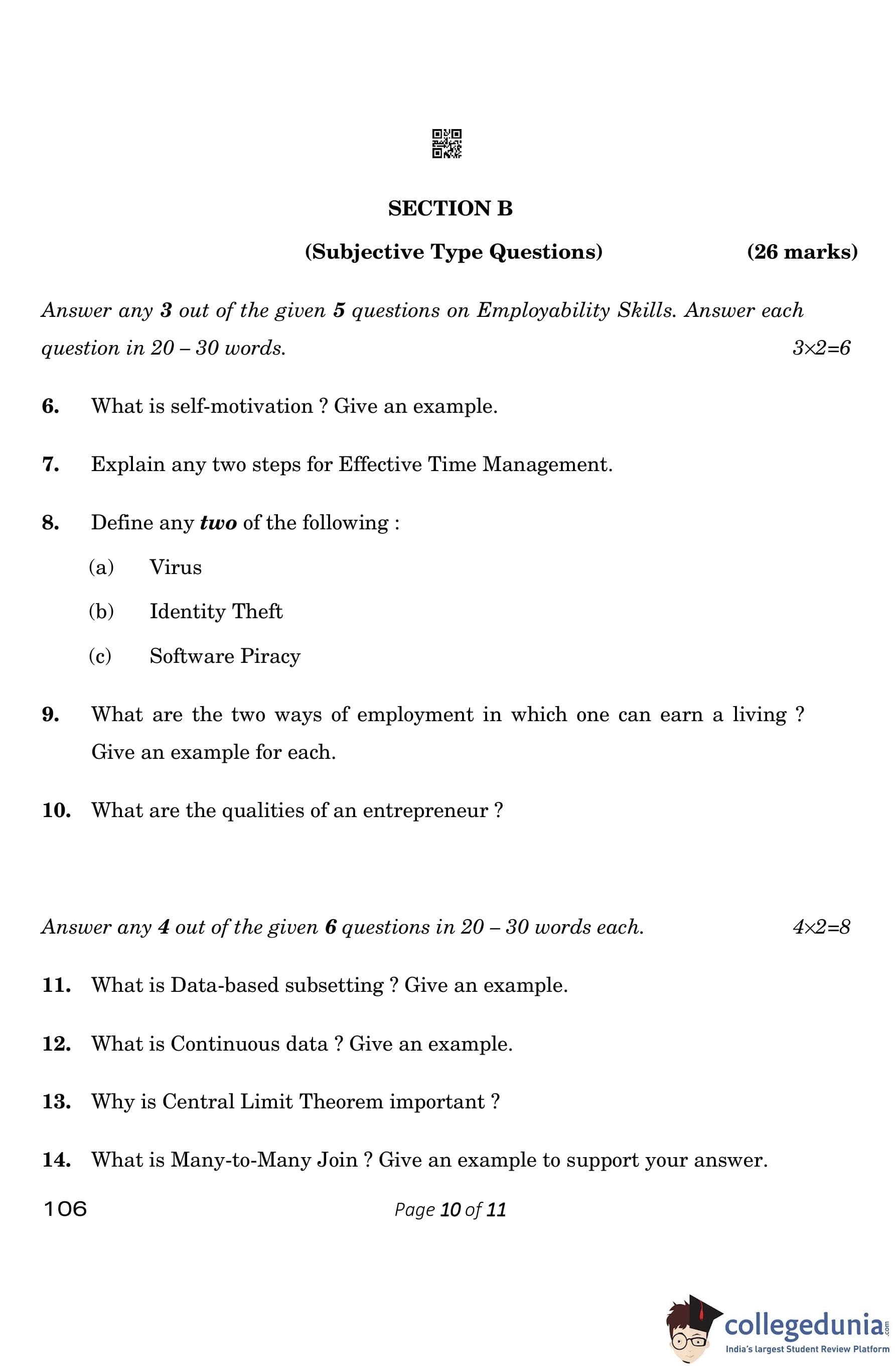 CBSE Class 10 Data Science Question Paper 2023 (Set 4- 106) with Answer Key pdf is available for download here. The exam was conducted by Central Board of Secondary Education on February 16, 2023. The question paper comprised a total of 21 questions divided among 2 sections.