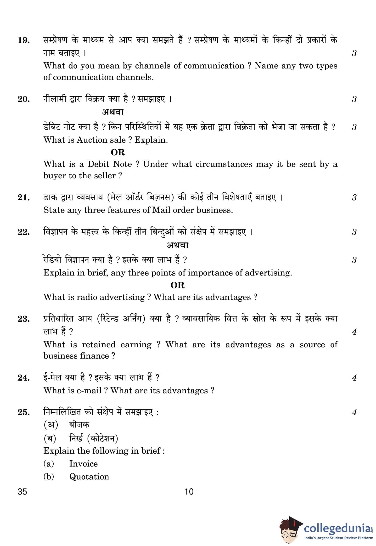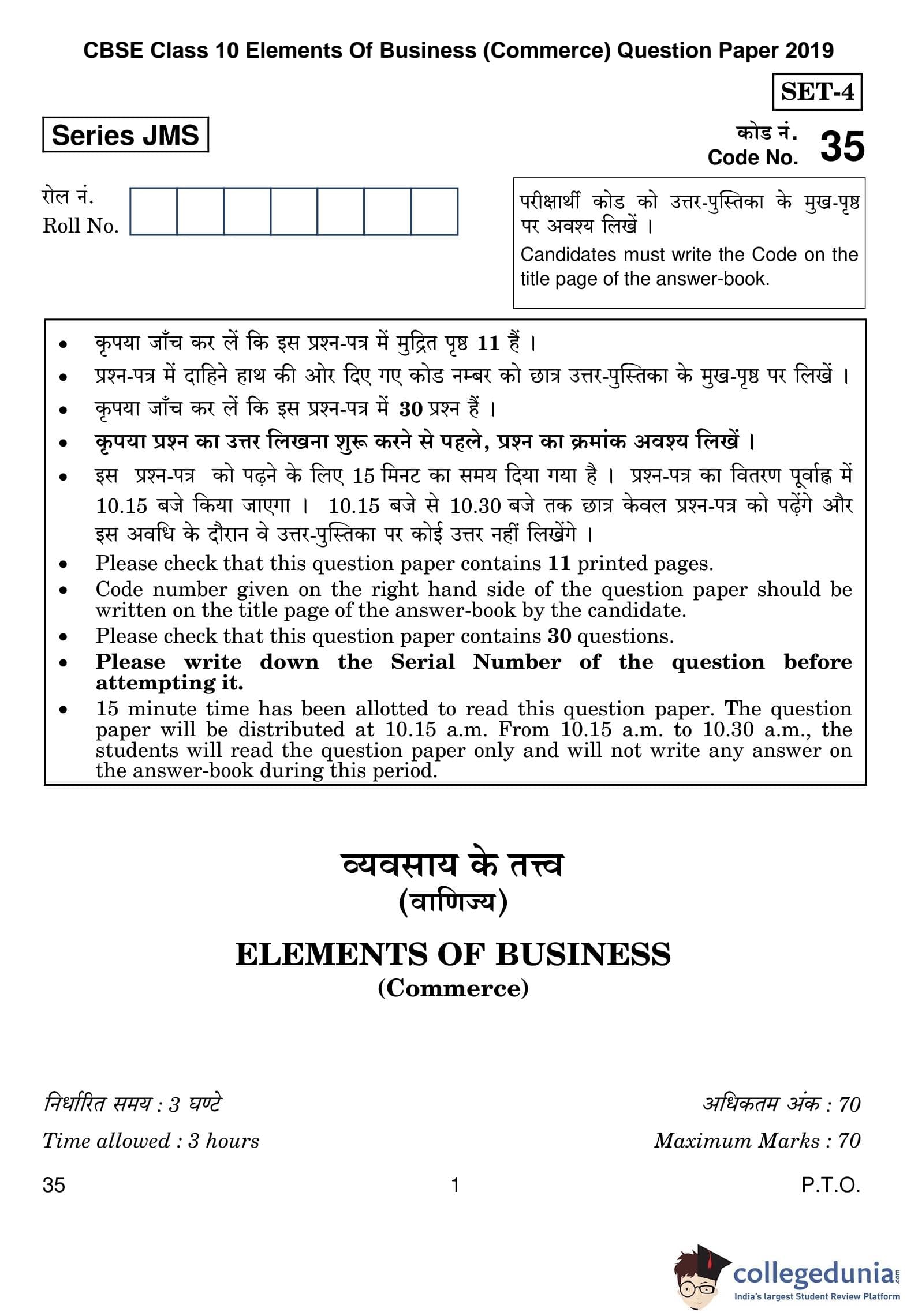 CBSE Class 10 Elements Of Business (Commerce) Question Paper 2019 with Answer Key is available for download. The exam was conducted by the Central Board of Secondary Education on February 27, 2019 in the Morning Session 10:30 AM to 1:30 PM. The medium of paper was English and Hindi. The question paper comprised a total of 30 questions.