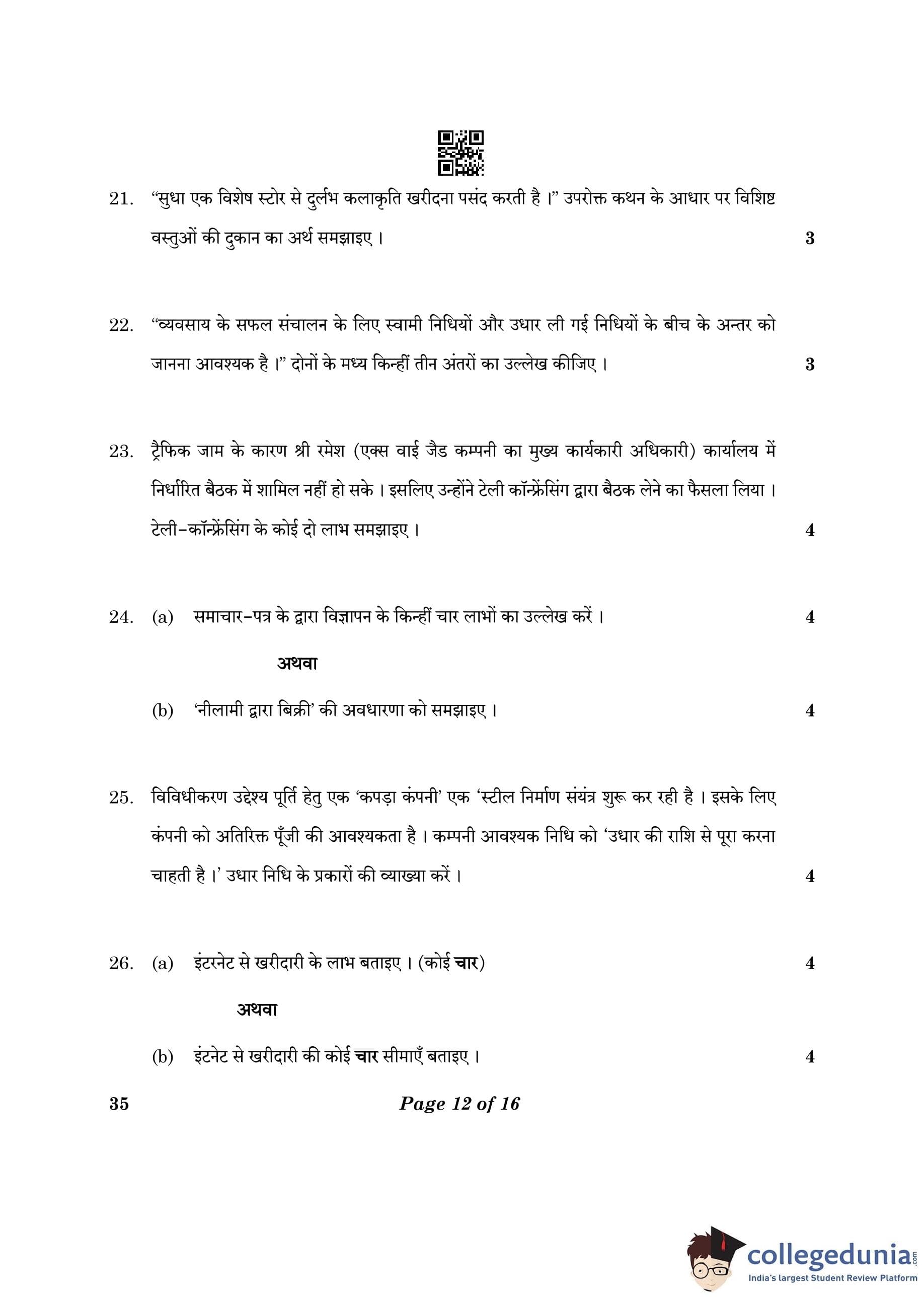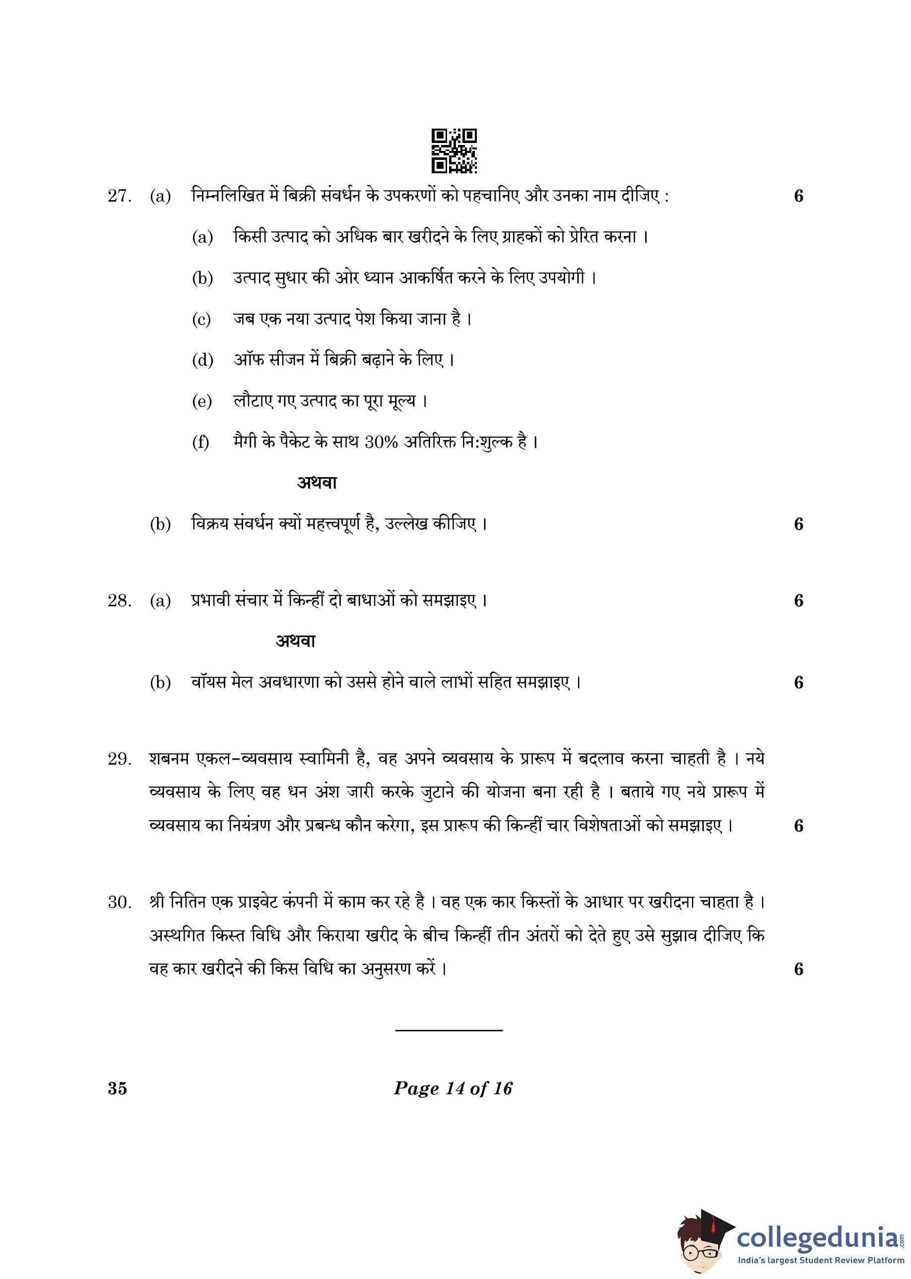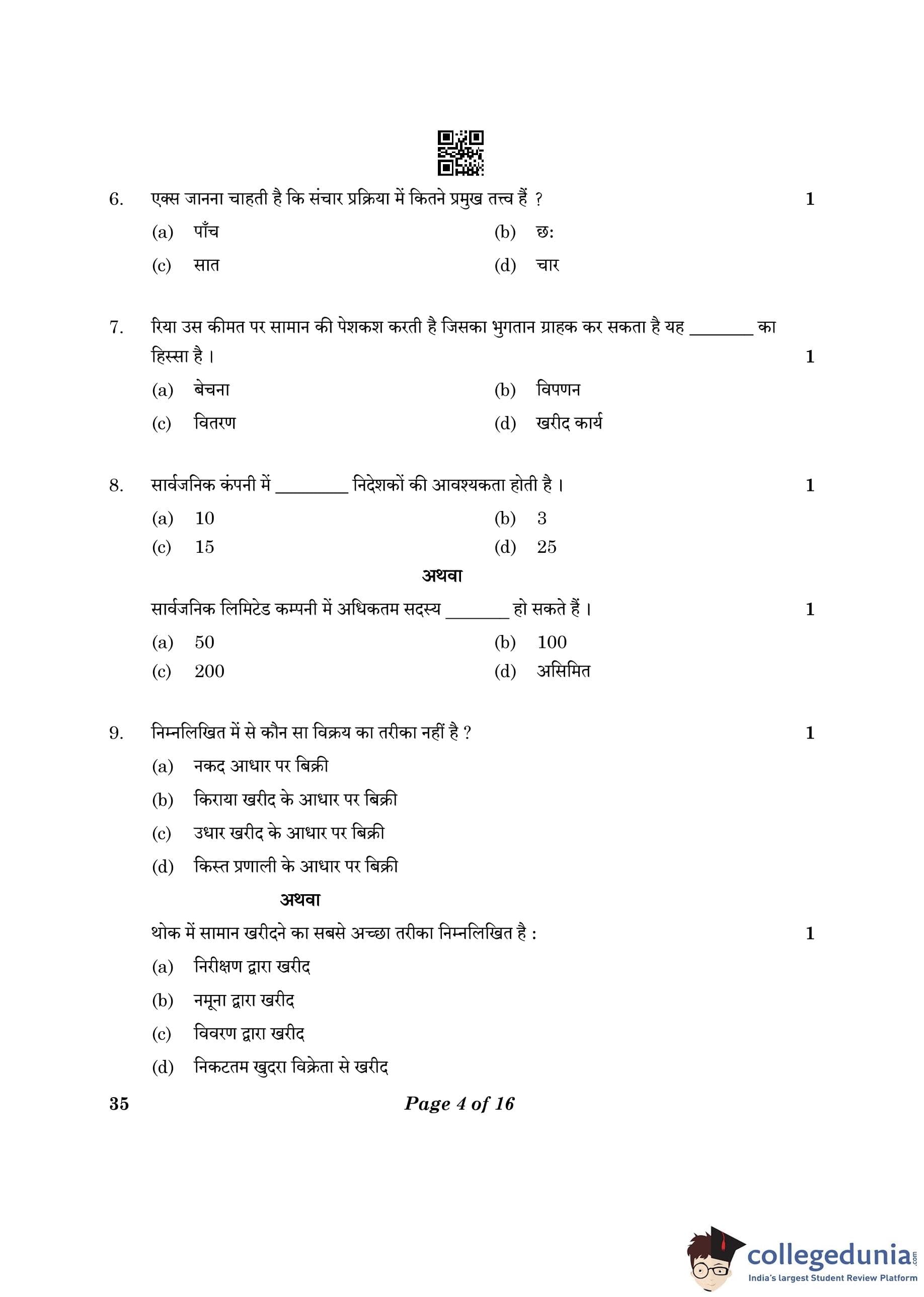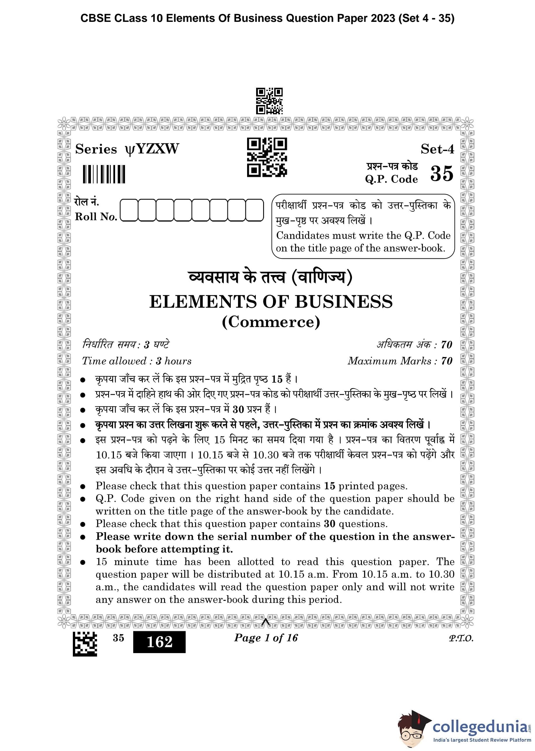 CBSE Class 10 Elements Of Business Question Paper 2023 (Set 4- 35) with Answer Key pdf is available for download here. The exam was conducted by Central Board of Secondary Education on March 9, 2023. The question paper comprised a total of 30 questions.