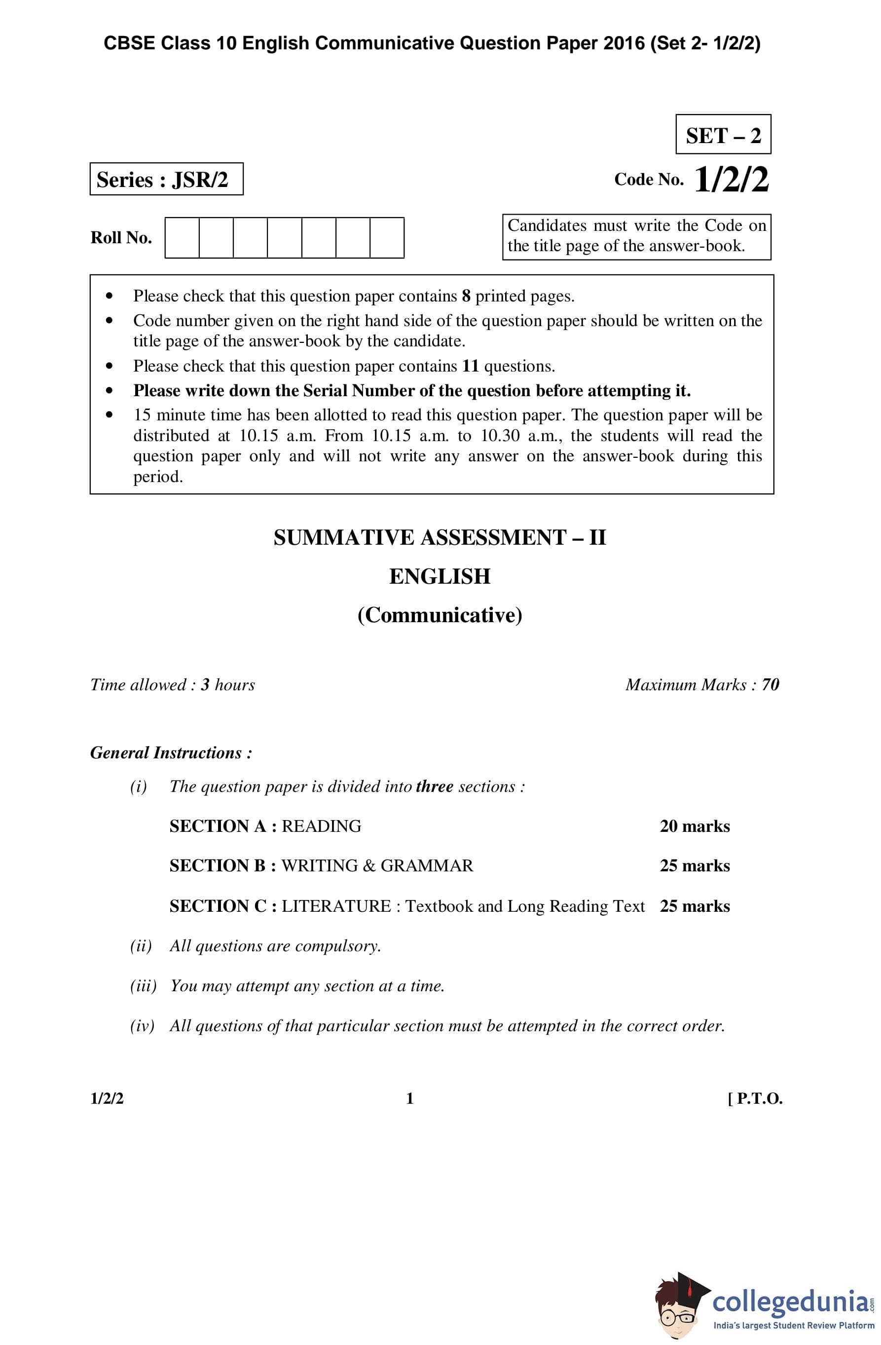 CBSE Class 10 English Communicative Question Paper 2016 with Answer Key Set 2- 1/2/2 is available for download. The exam was conducted by the Central Board of Secondary Education on March 15, 2016 in the Morning Session 10:30 AM to 1:30 PM. The medium of paper was English. The question paper comprised a total of 11 questions divided among 3 sections.