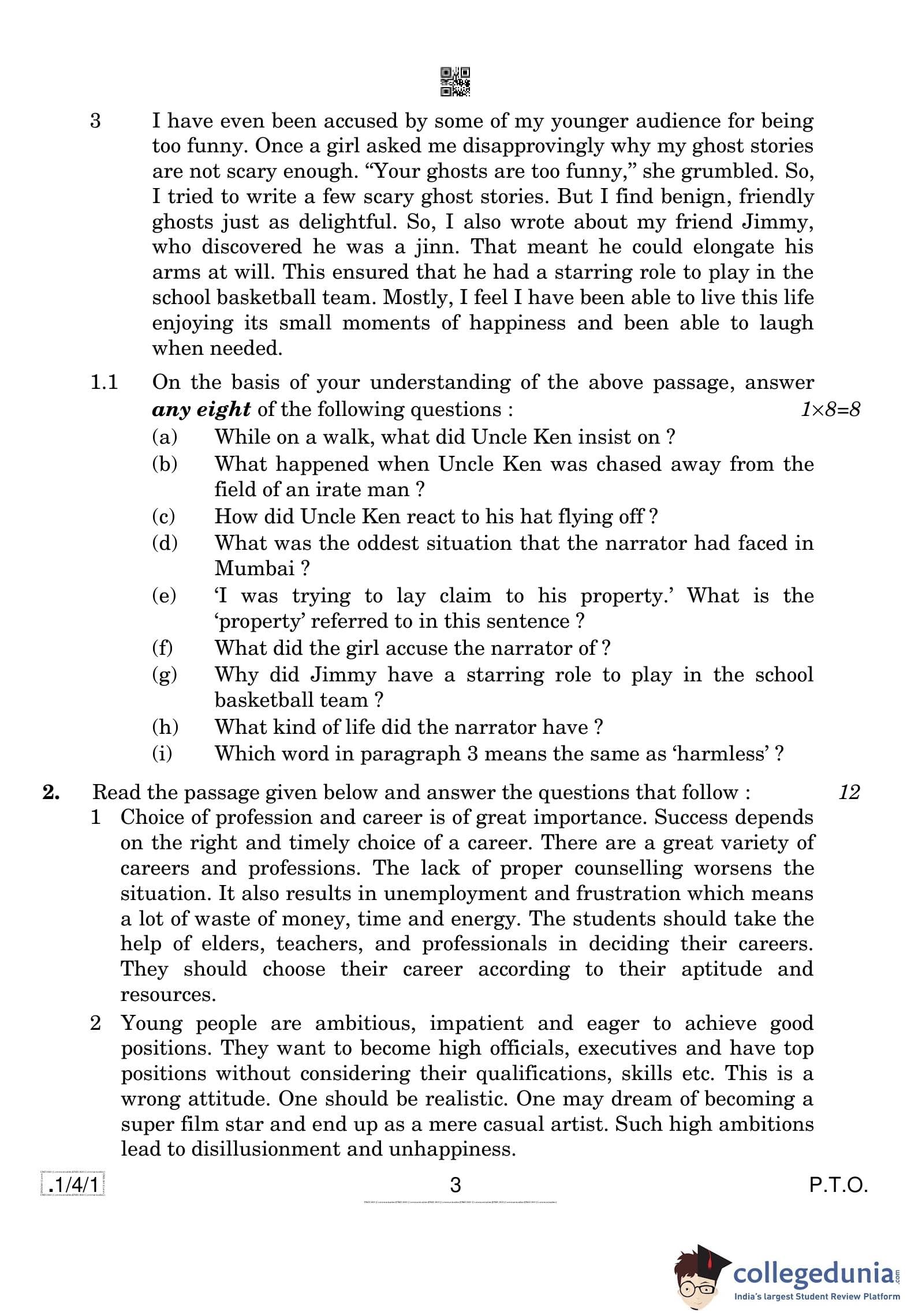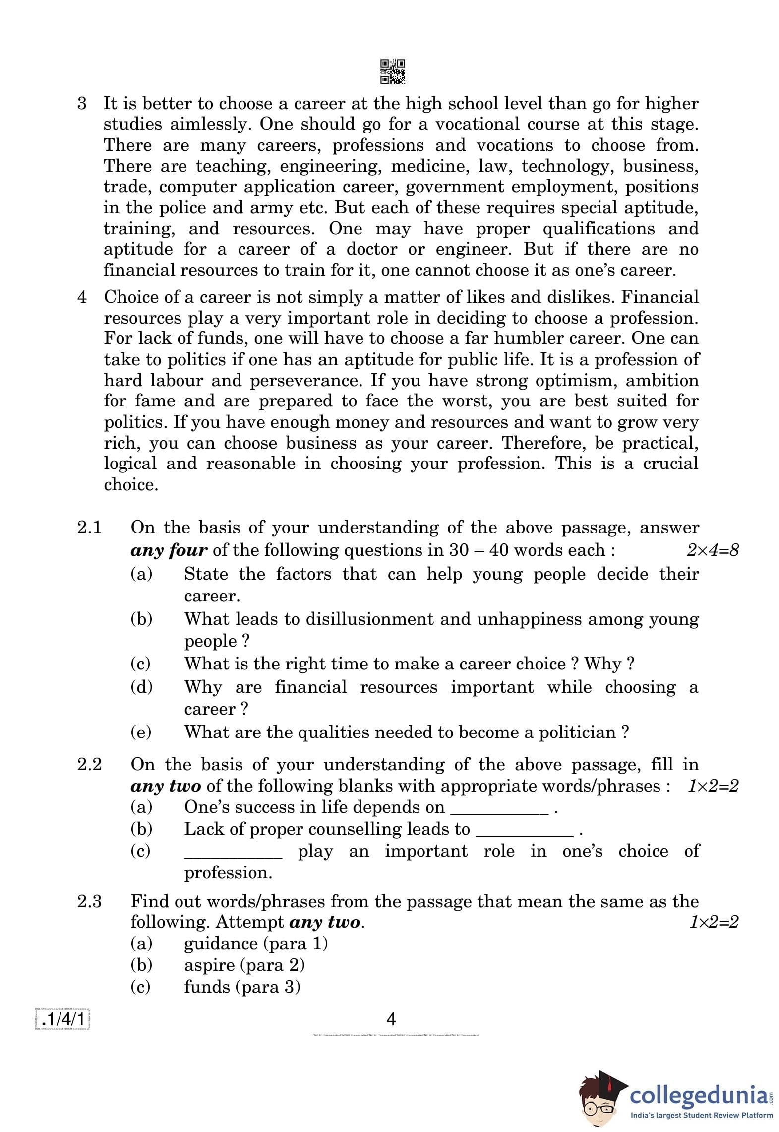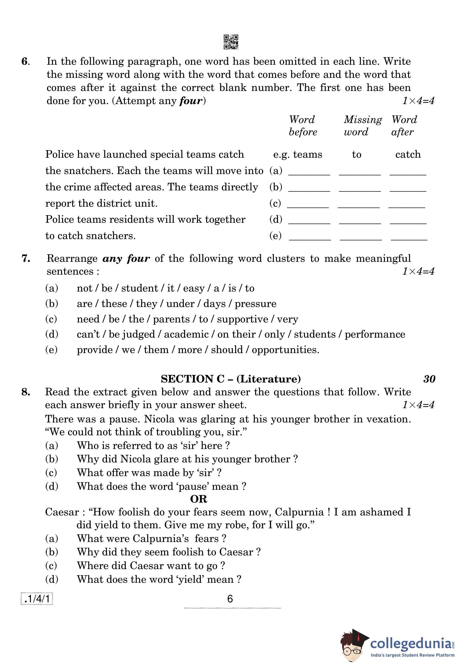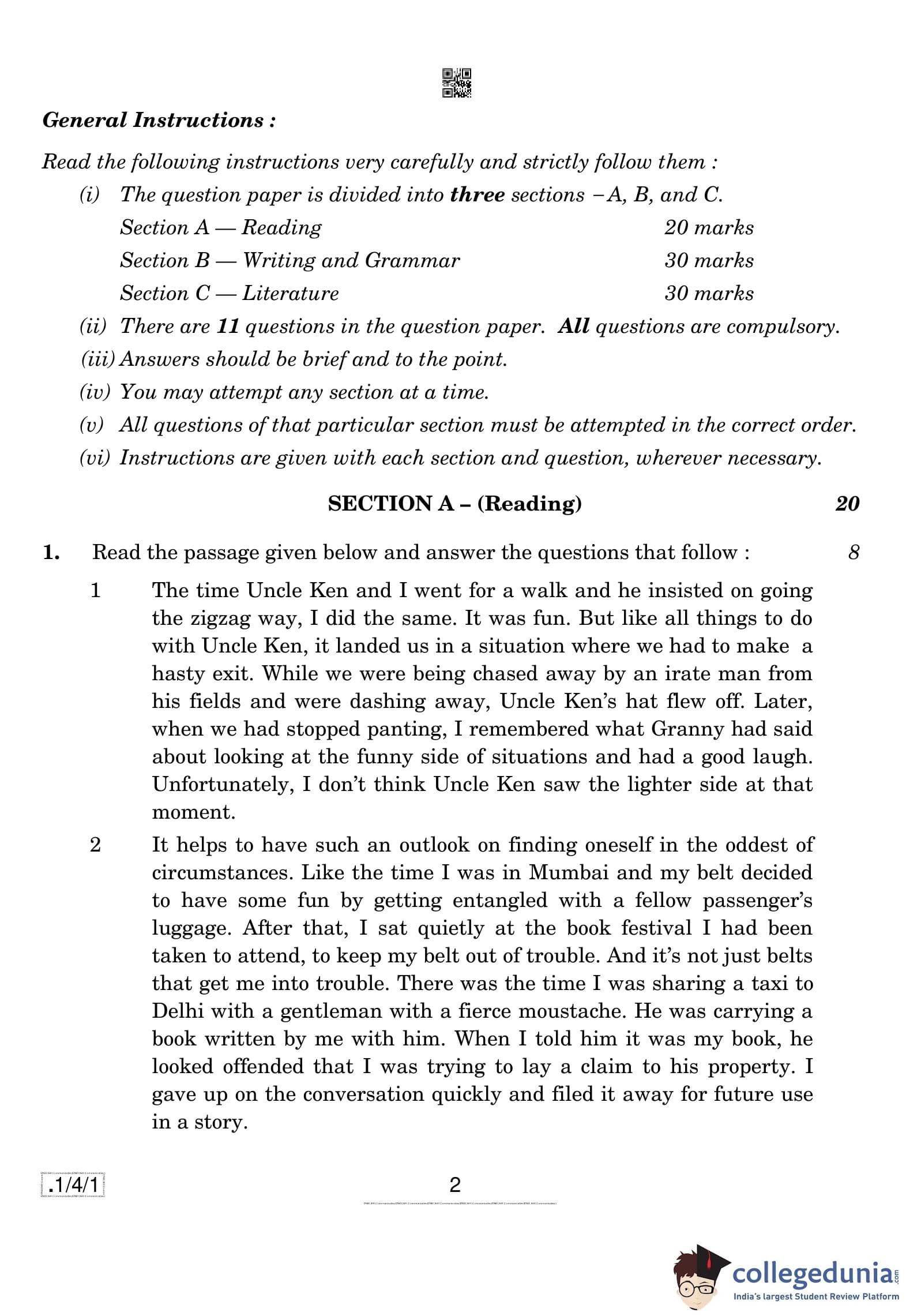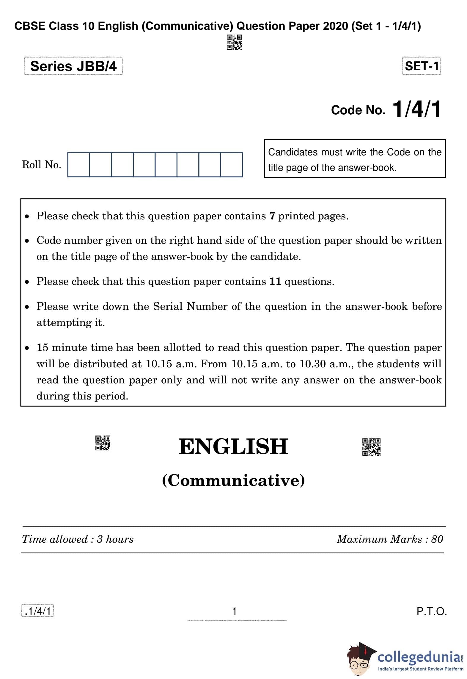 CBSE Class 10 English (Communicative) Question Paper 2020 with Answer Key Set 1 - 1/4/1 is available for download. The exam was conducted by the Central Board of Secondary Education on February 26, 2020 in the Morning Session 10:30 AM to 1:30 PM. The medium of paper was English. The question paper comprised a total of 11 questions divided among 3 sections.