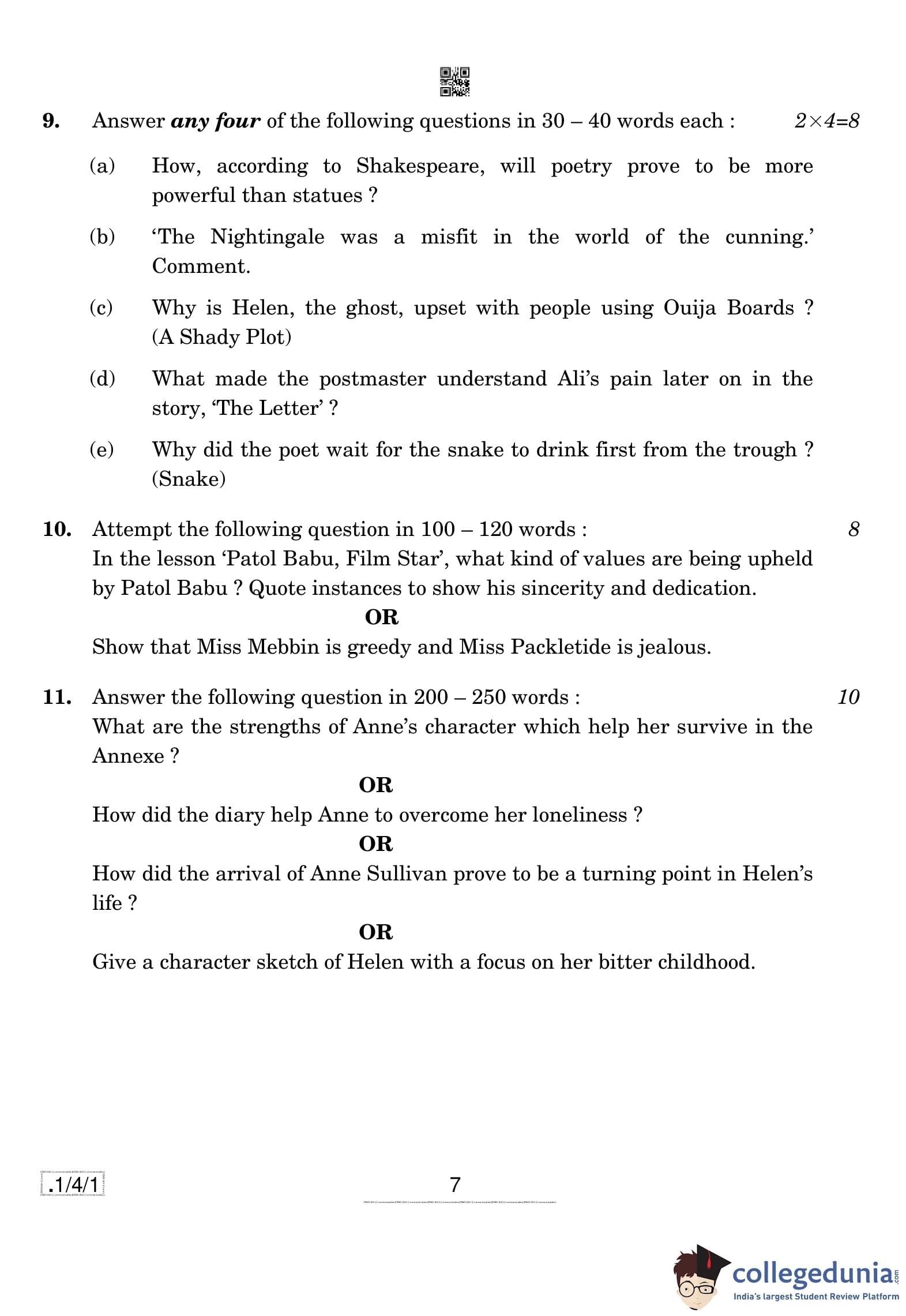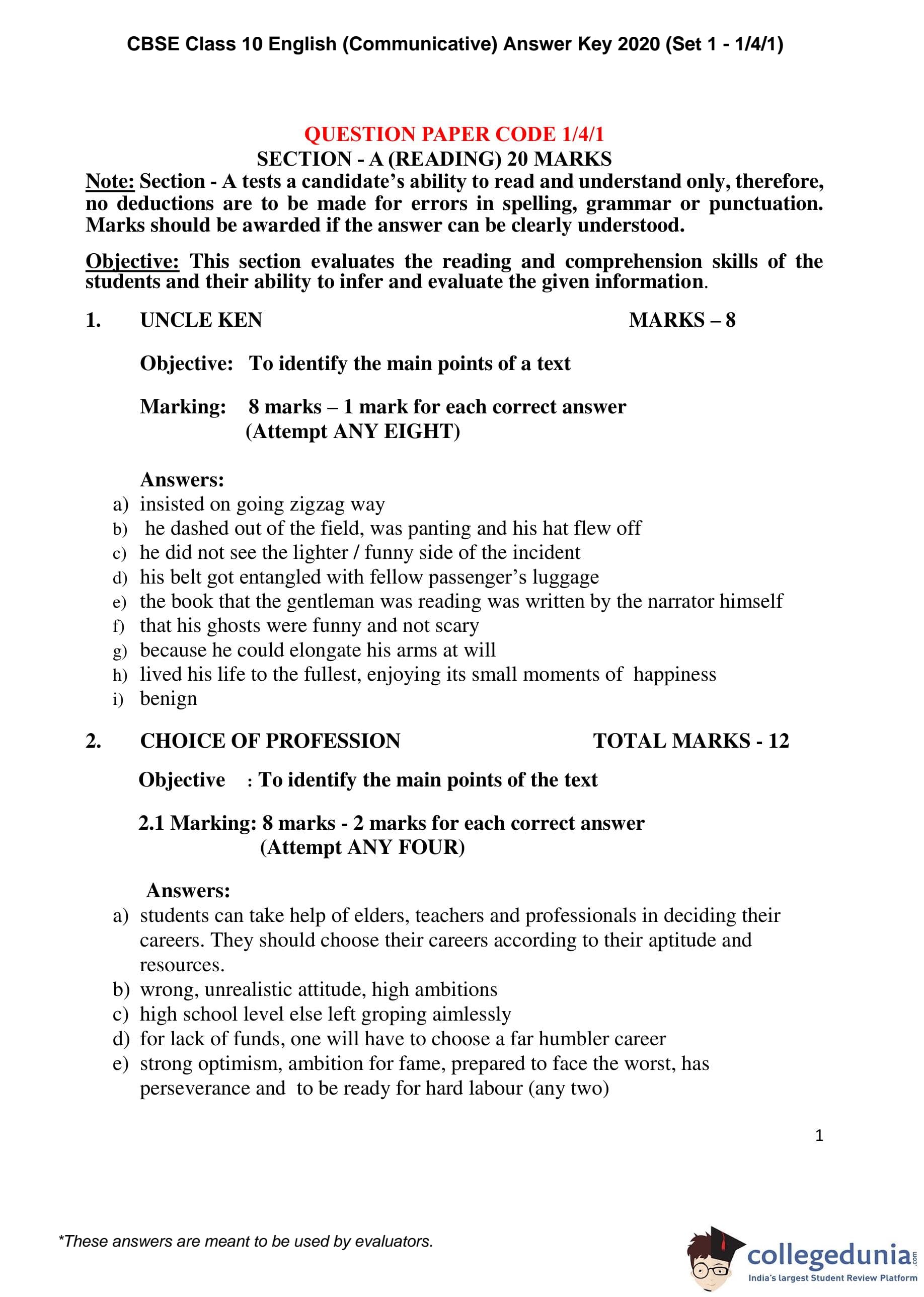CBSE Class 10 English (Communicative) Set 1 - 1/4/1 Question Paper 2020 with Answer Key (February 26)