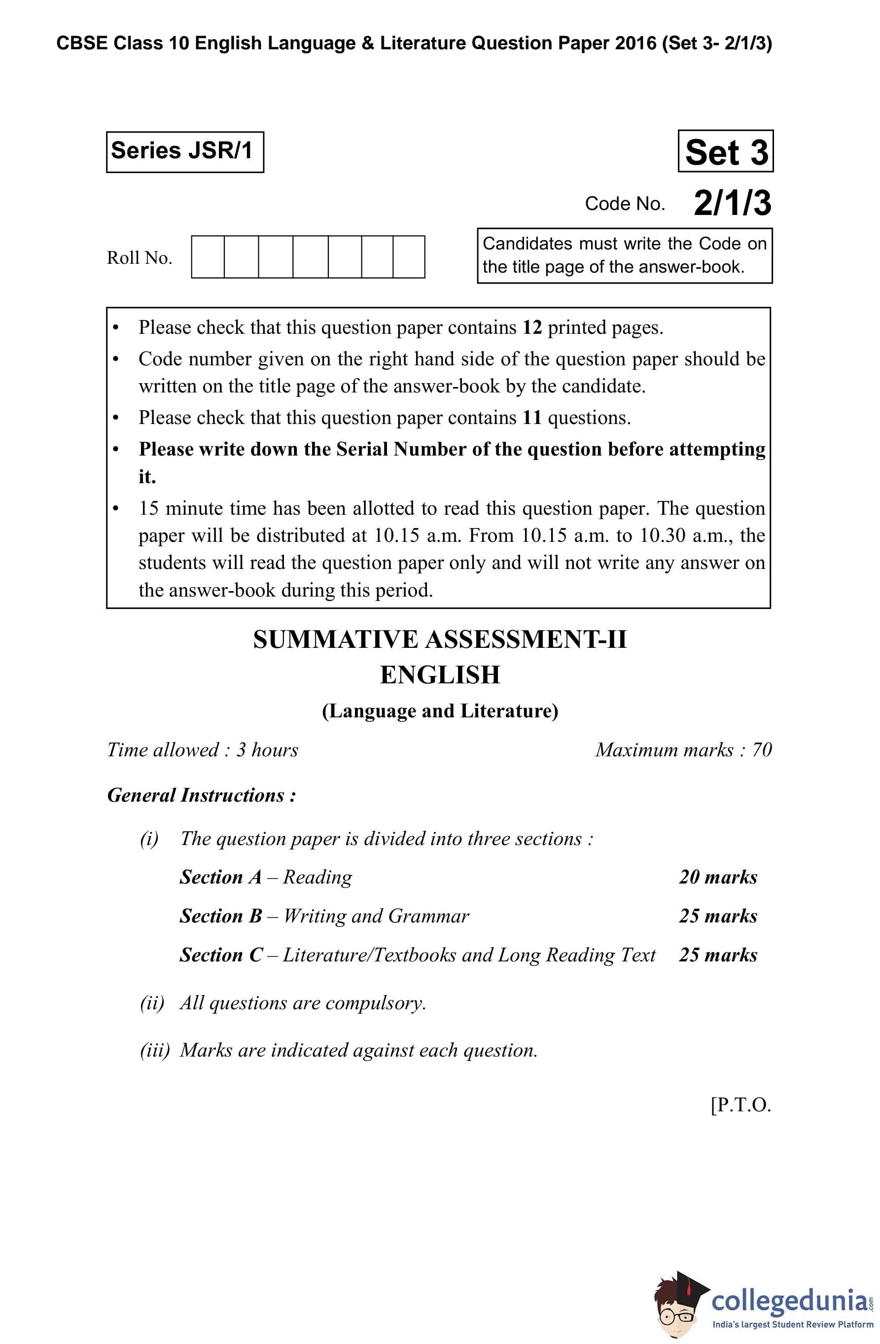 CBSE Class 10 English Language & Literature Question Paper 2016 with Answer Key Set 3- 2/1/3 is available for download. The exam was conducted by the Central Board of Secondary Education on March 15, 2016 in the Morning Session 10:30 AM to 1:30 PM. The medium of paper was English. The question paper comprised a total of 11 questions divided among 3 sections.