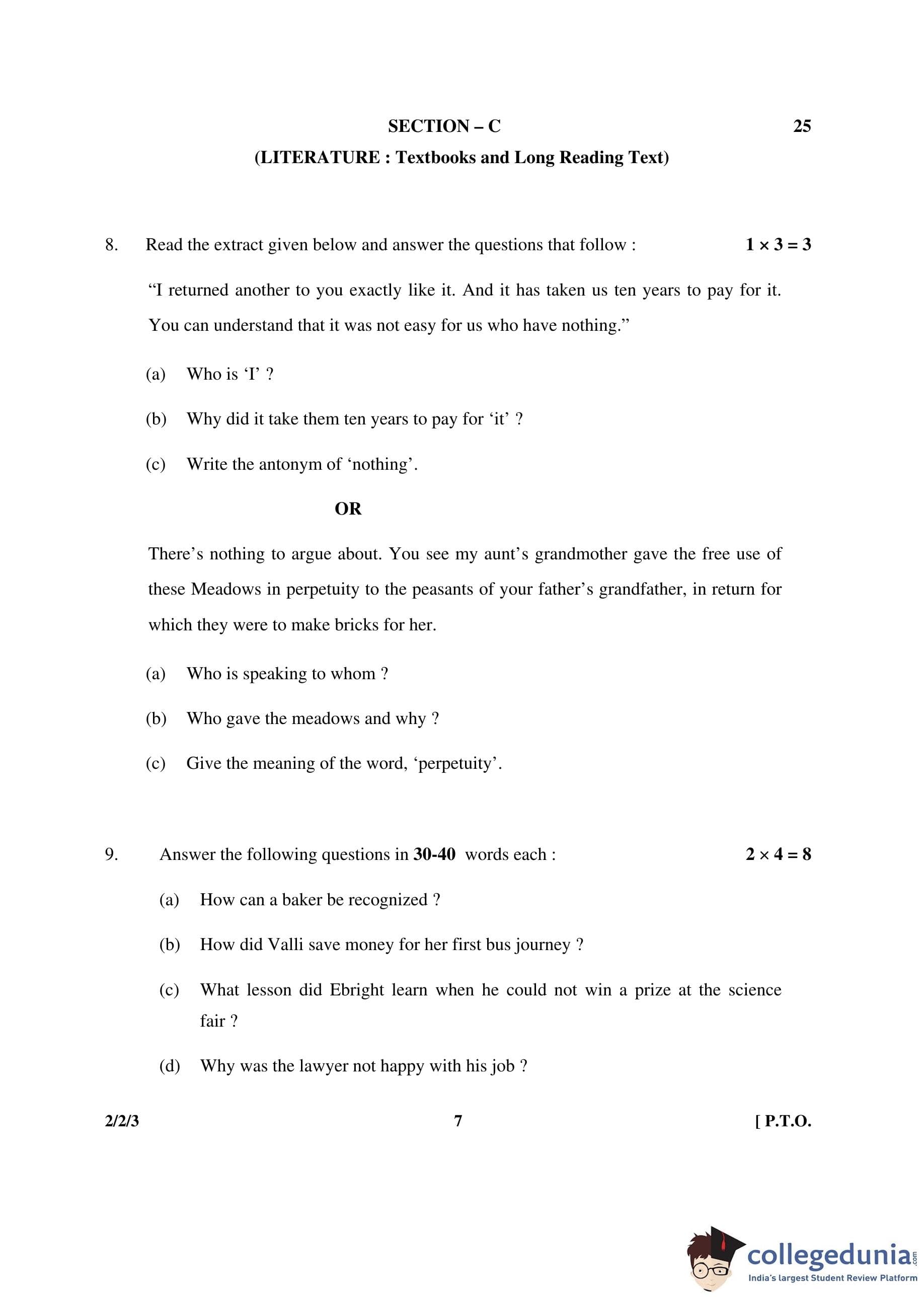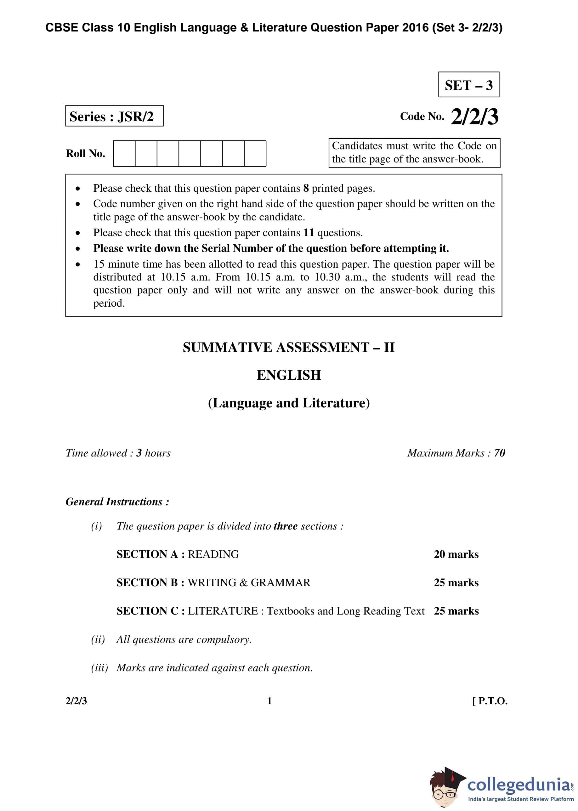 CBSE Class 10 English Language & Literature Question Paper 2016 with Answer Key Set 3- 2/2/3 is available for download. The exam was conducted by the Central Board of Secondary Education on March 15, 2016 in the Morning Session 10:30 AM to 1:30 PM. The medium of paper was English. The question paper comprised a total of 11 questions divided among 3 sections.