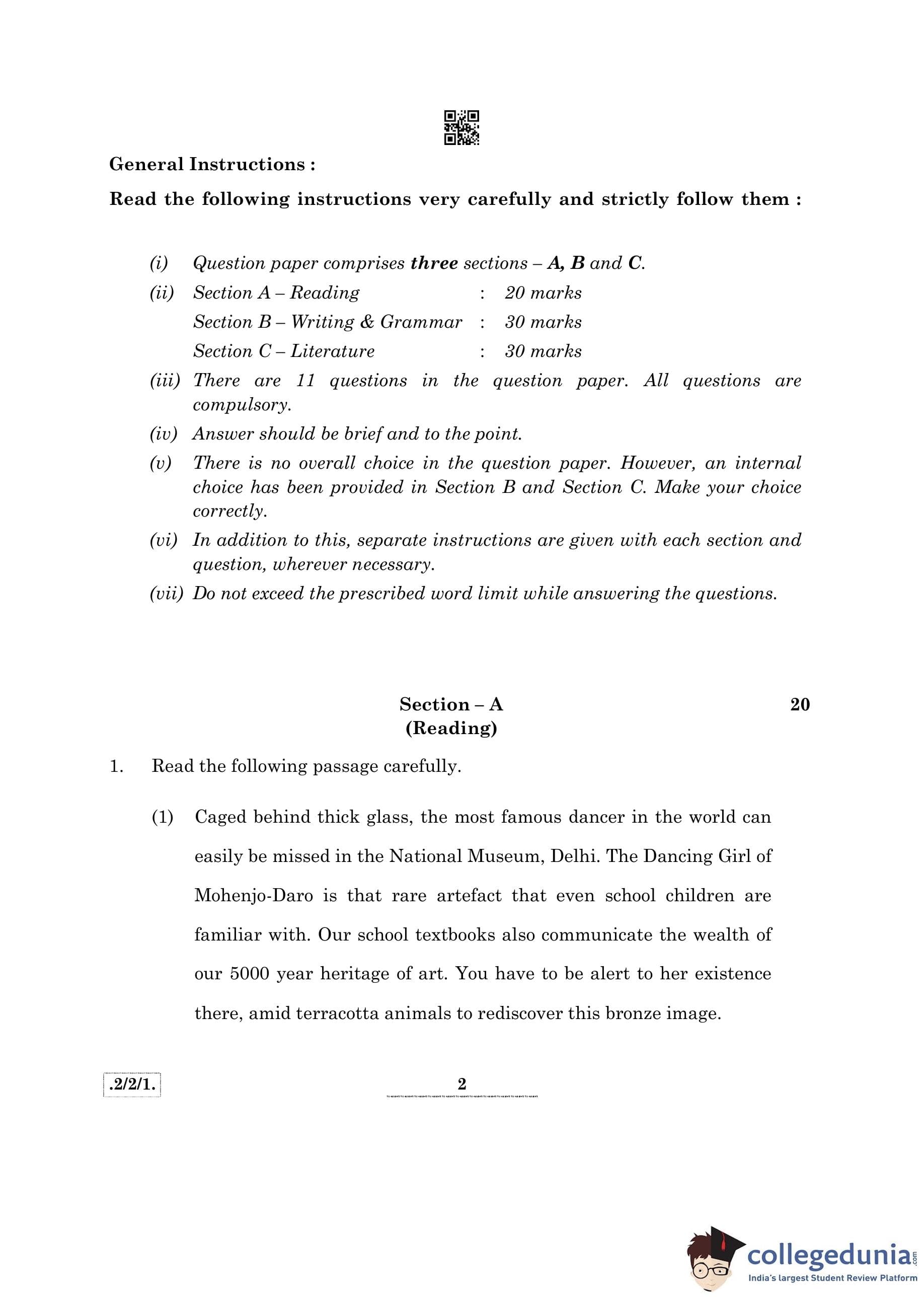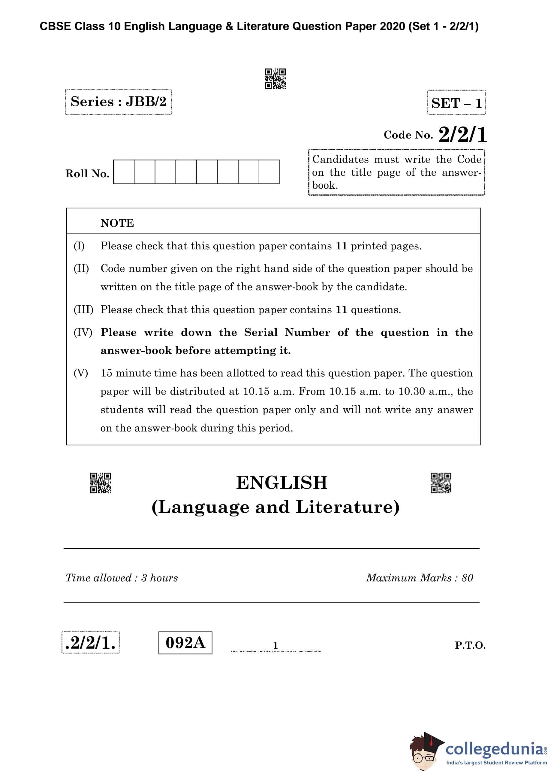 CBSE Class 10 English Language & Literature Question Paper 2020 with Answer Key Set 1 - 2/2/1 is available for download. The exam was conducted by the Central Board of Secondary Education on February 26, 2020 in the Morning Session 10:30 AM to 1:30 PM. The medium of paper was English. The question paper comprised a total of 11 questions divided among 3 sections.