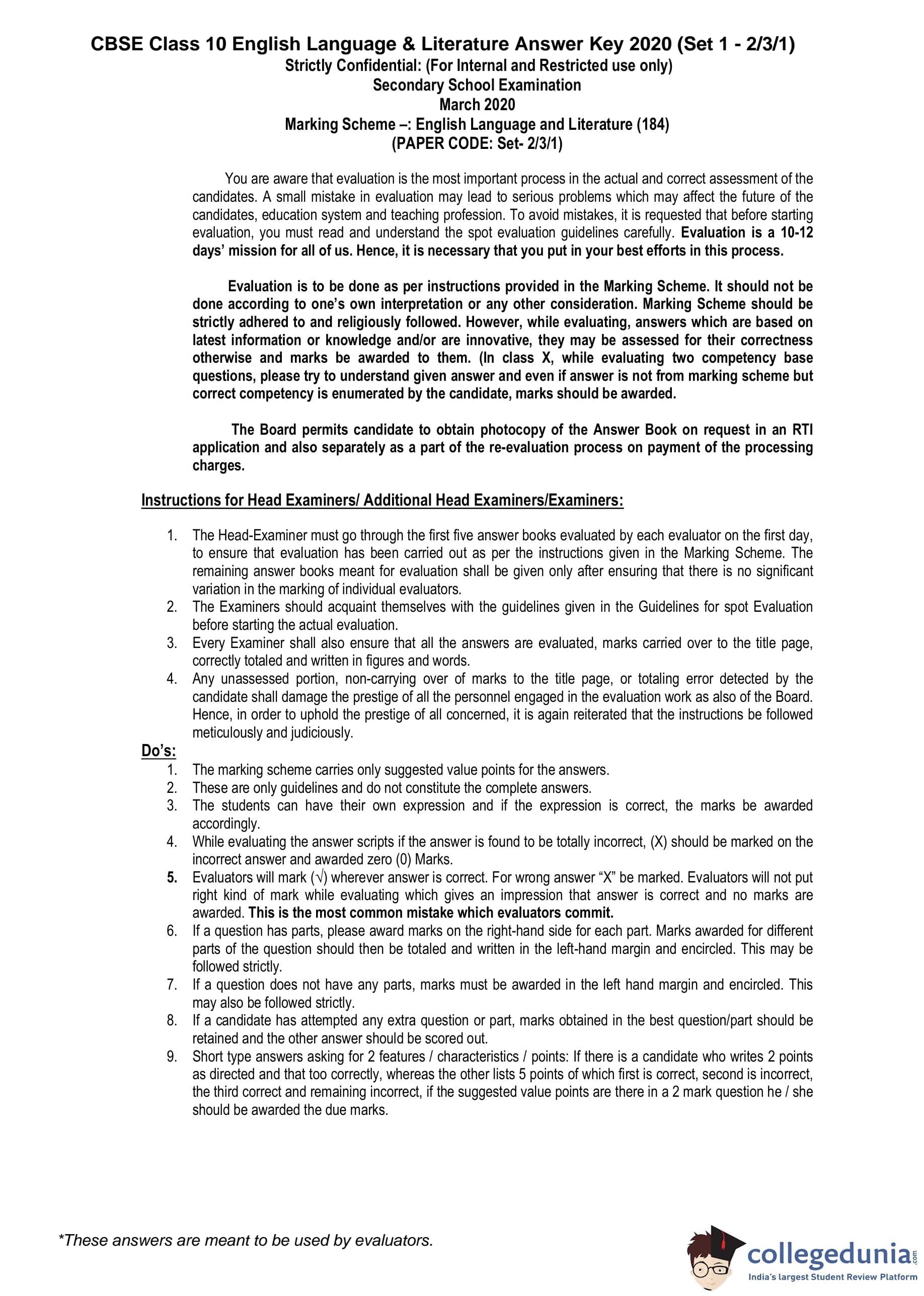 | CBSE Class 10 English Language & Literature Question Paper 2020 PDF | CBSE Class 10 English Language & Literature Answer Key 2020 PDF | Detailed Solutions |