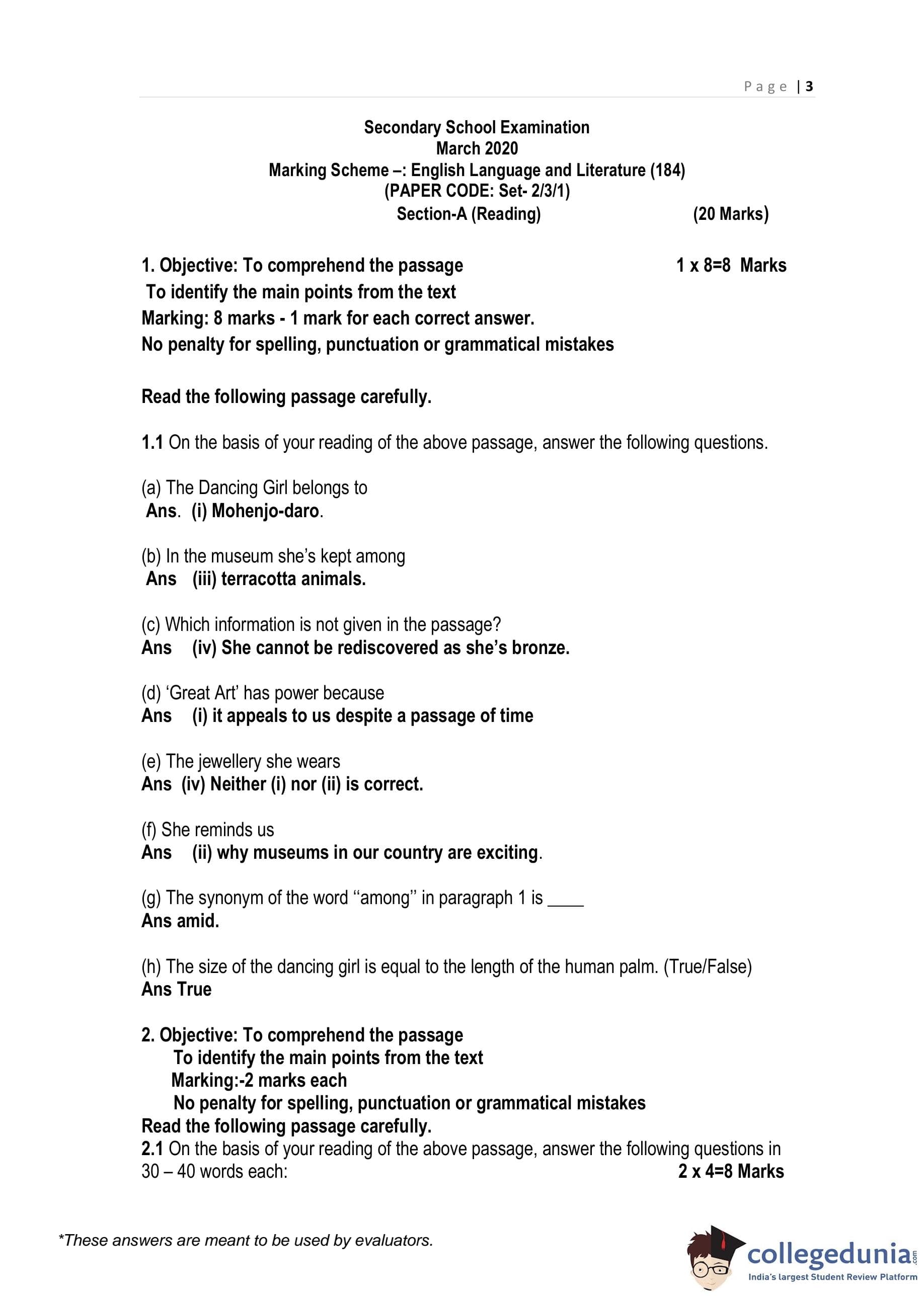 CBSE Class 10 English Language & Literature Set 1 - 2/3/1 Question Paper 2020 with Answer Key (February 26)