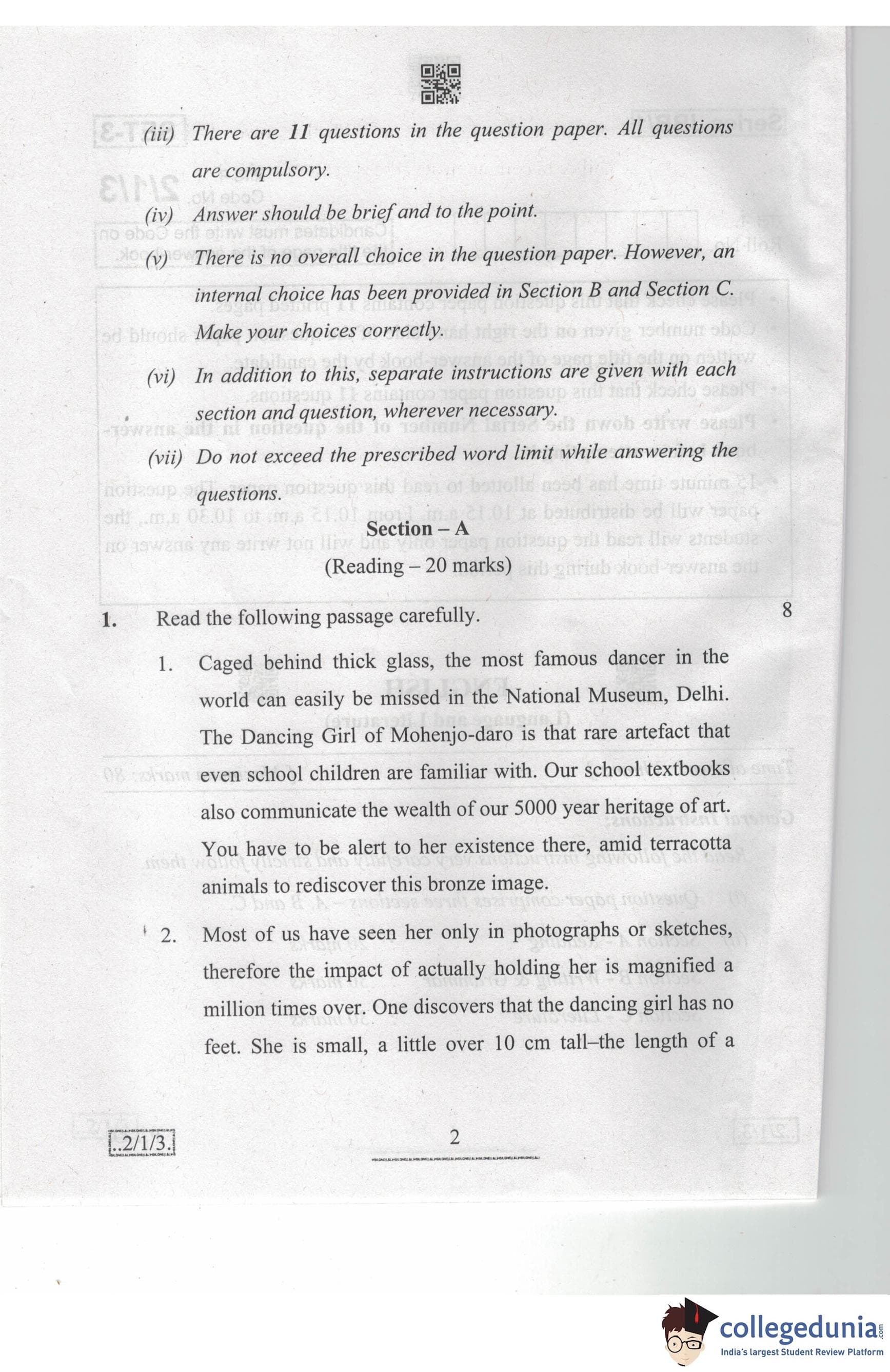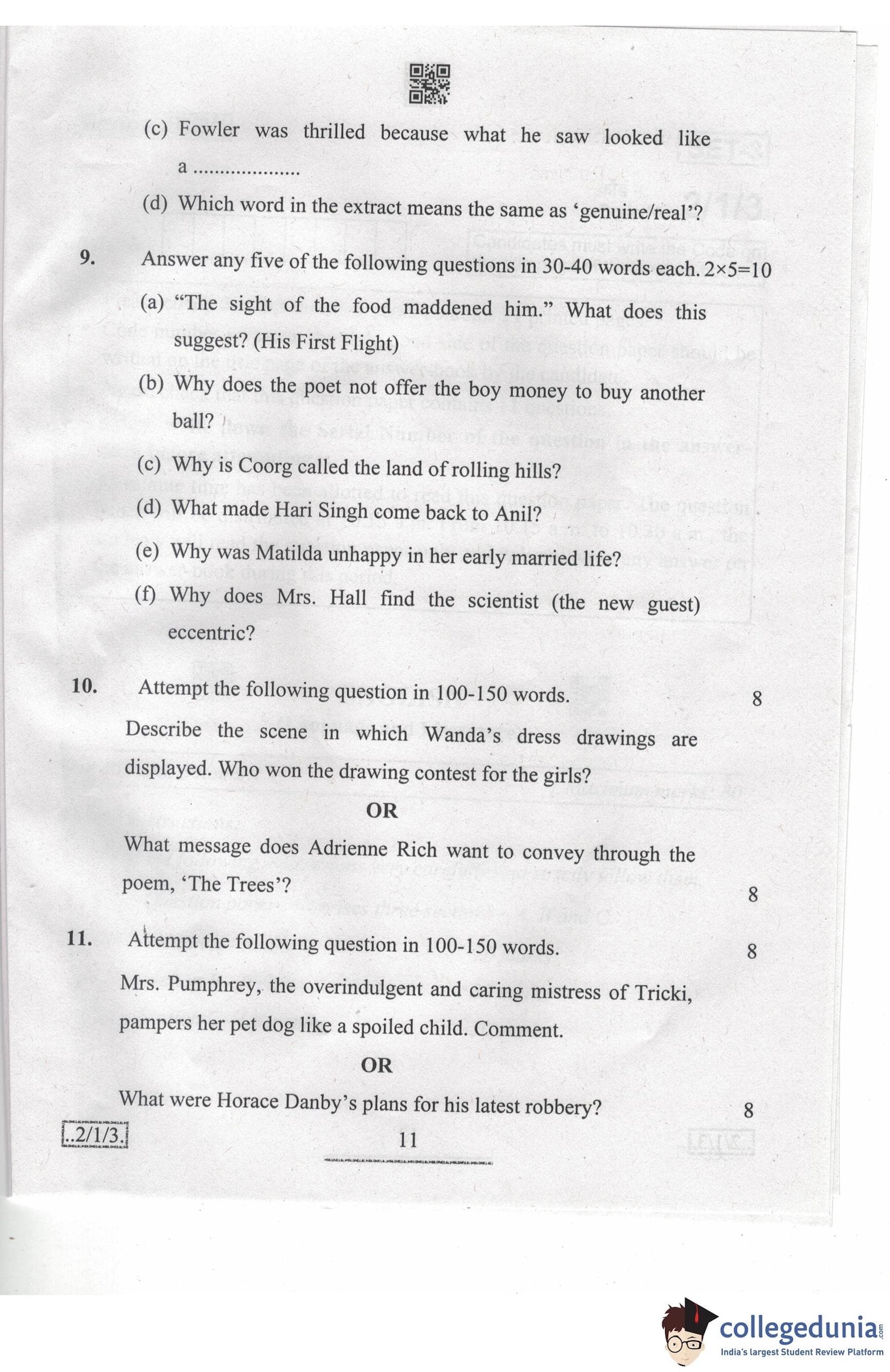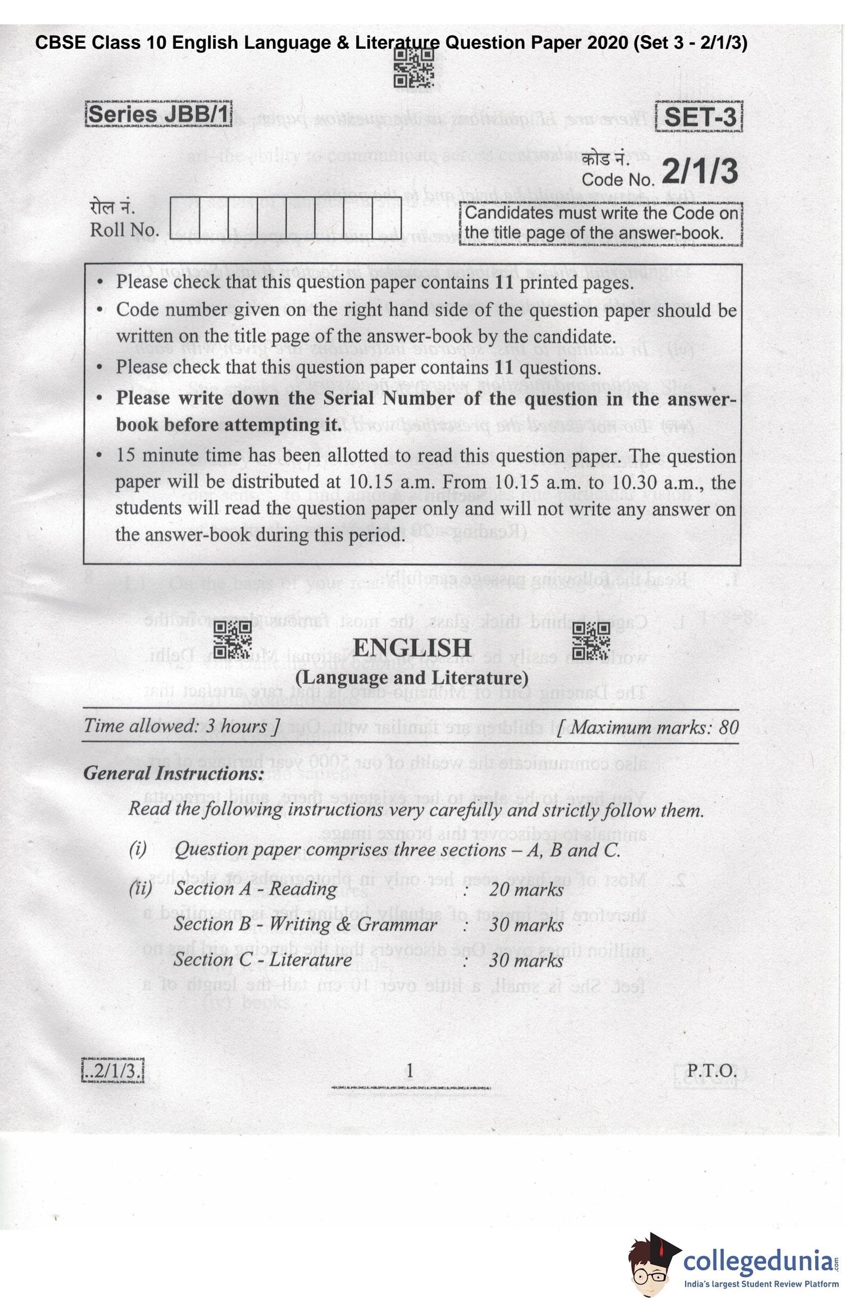 CBSE Class 10 English Language & Literature Question Paper 2020 with Answer Key Set 3 - 2/1/3 is available for download. The exam was conducted by the Central Board of Secondary Education on February 26, 2020 in the Morning Session 10:30 AM to 1:30 PM. The medium of paper was English. The question paper comprised a total of 11 questions divided among 3 sections.
