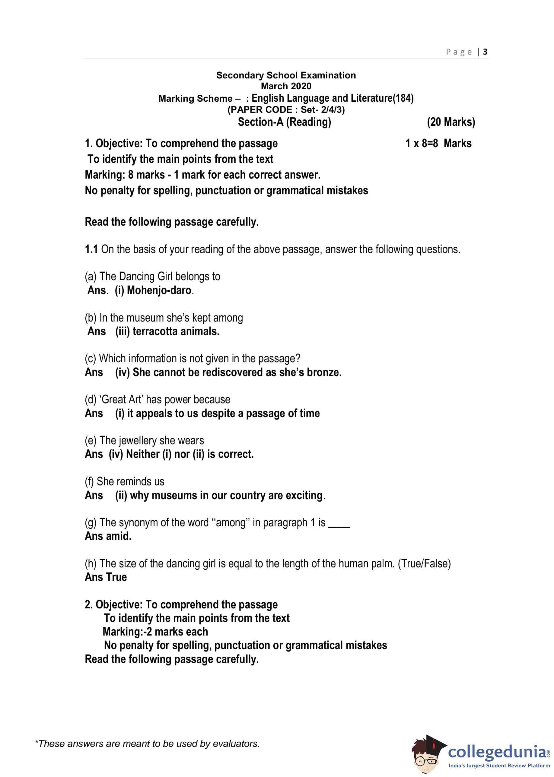 CBSE Class 10 English Language & Literature Set 3 - 2/4/3 Question Paper 2020 with Answer Key (February 26)