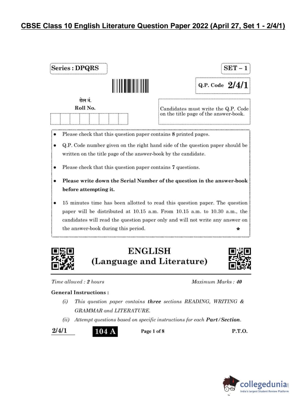 CBSE Class 10 English Literature Question Paper 2022 with Answer Key Set 1 - 2/4/1 is available for download. The exam was conducted by the Central Board of Secondary Education on April 27, 2022 in the Morning Session 10:30 AM to 12:30. The medium of paper was English. The question paper comprised a total of 7 questions divided among 3 sections.