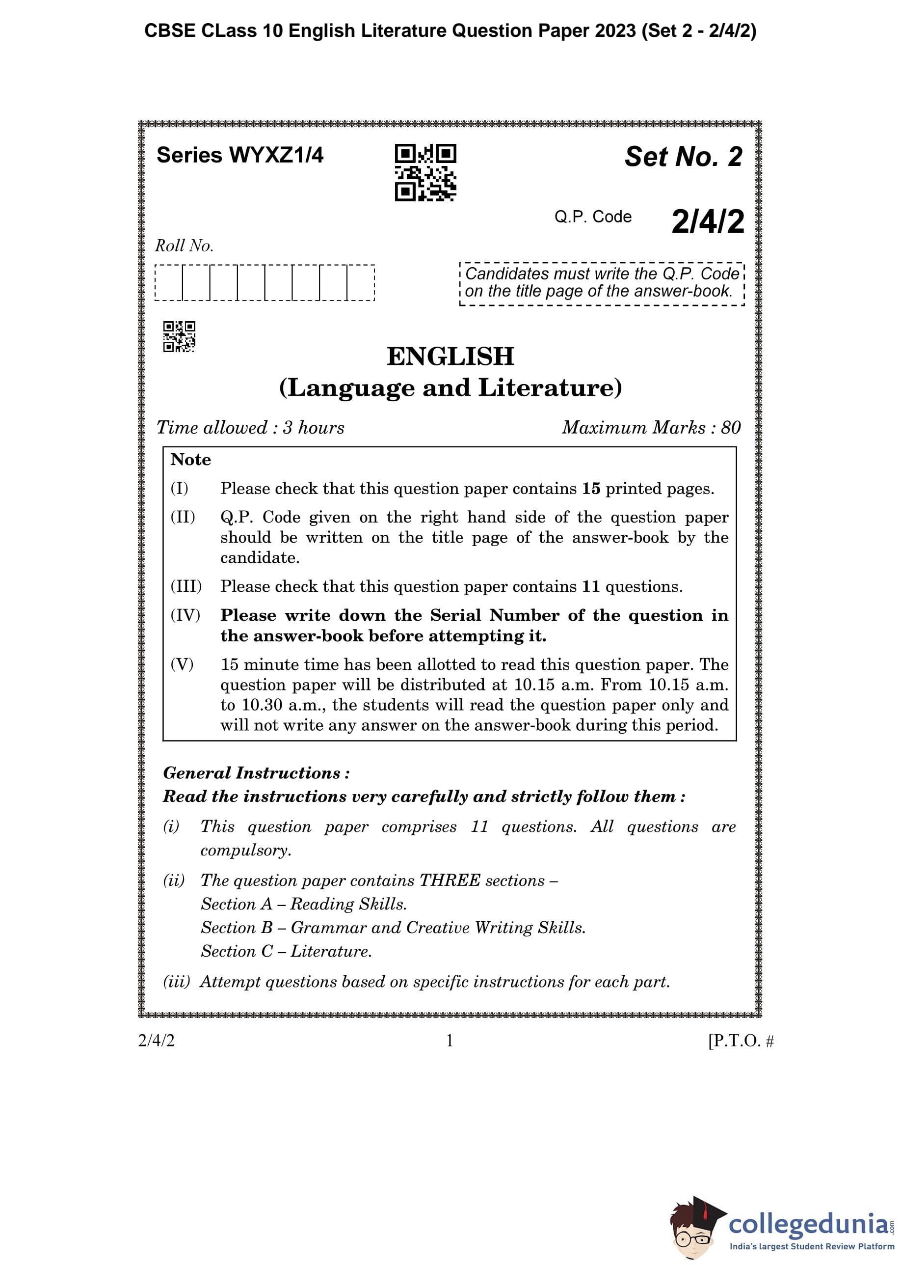 CBSE Class 10 English Question Paper 2023 with Answer Key (Set 2- 2/4/2) is available for download here. The exam was conducted by the Central Board of Secondary Education on February 27, 2023 in the Morning Session 10:30 AM to 1:30 PM. According to initial student reaction, the CBSE Class 10 English Paper was rated as easy in difficulty level. The question paper was divided into three sections Reading, Writing & Grammar and Literature.