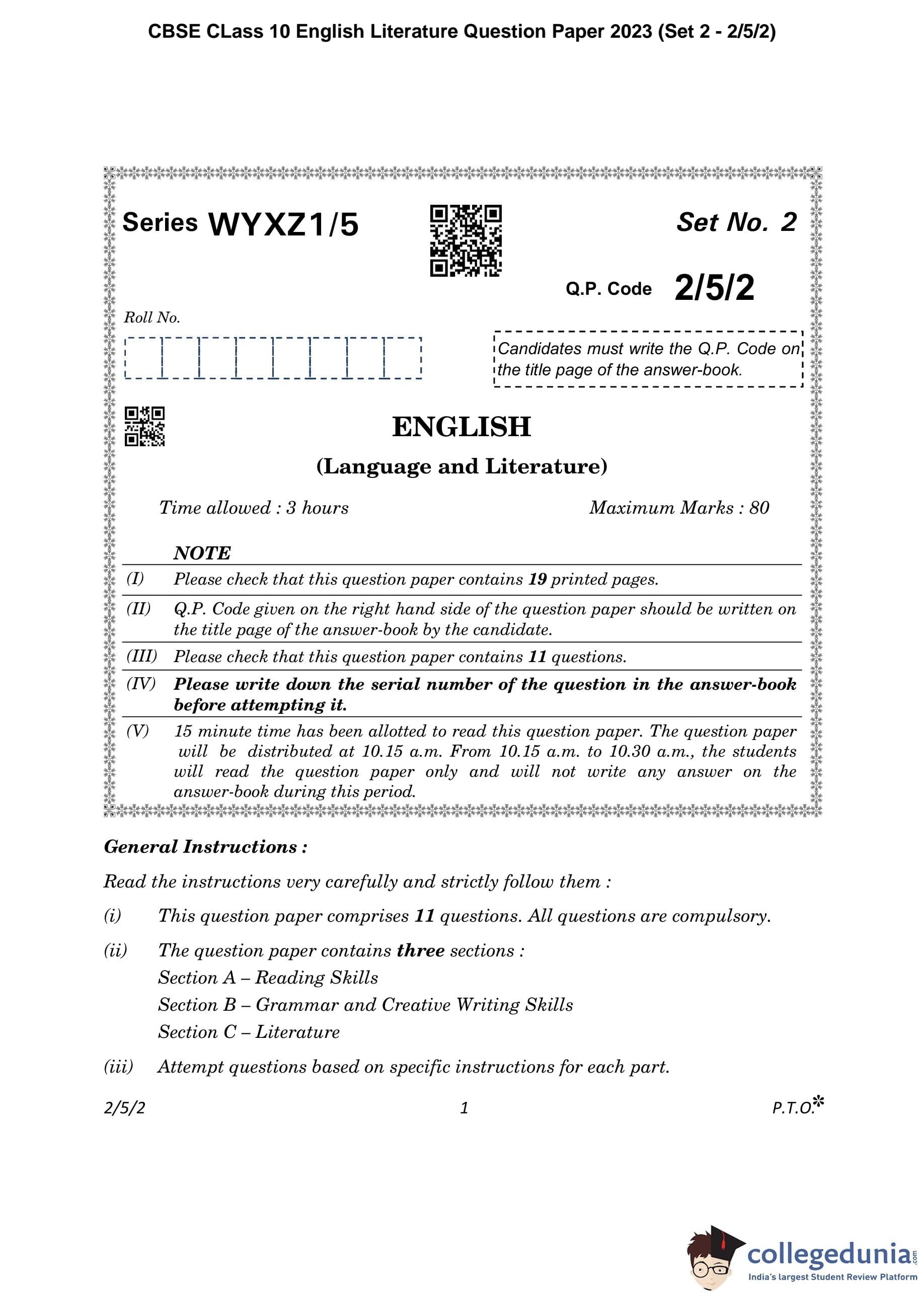 CBSE Class 10 English Question Paper 2023 with Answer Key (Set 2- 2/5/2) is available for download here. The exam was conducted by the Central Board of Secondary Education on February 27, 2023 in the Morning Session 10:30 AM to 1:30 PM. According to initial student reaction, the CBSE Class 10 English Paper was rated as easy in difficulty level. The question paper was divided into three sections Reading, Writing & Grammar and Literature.