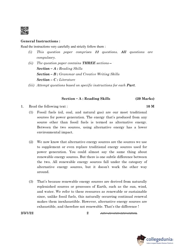 CBSE Class 10 English Question Paper 2024 PDF (Set 1 - 2/3/1) is available for download here. CBSE conducted the English exam on February 26, 2024, from 10:30 AM to 1:30 PM. The total marks for the theory paper are 80. The question paper contains 20% MCQ-based questions, 40% competency-based questions, and 40% short and long answer type questions.