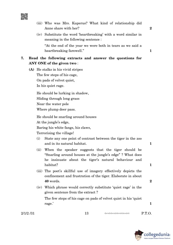 7. Read the following extracts and answer the questions for ANY ONE of the given two: