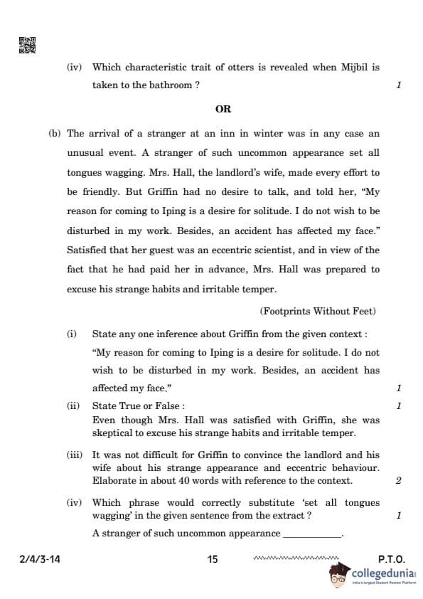 (b) The arrival of a stranger at an inn in winter was in any case an unusual event. A stranger of such uncommon appearance set all tongues wagging. Mrs. Hall, the landlord’s wife, made every effort to be friendly. But Griffin had no desire to talk, and told her, ‘My reason for coming to Iping is a desire for solitude. I do not wish to be disturbed in my work. Besides, an accident has affected my face.’ Satisfied that her guest was an eccentric scientist, and in view of the fact that he had paid her in advance, Mrs. Hall was prepared to excuse his strange habits and irritable temper. (Footprints Without Feet)