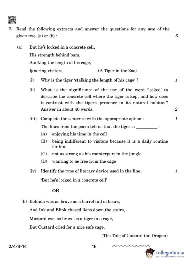 Answer: The literary device used is Alliteration. The repetition of the ‘c’ sound in “concrete cell” creates a rhythmic quality, emphasizing the harshness of the tiger’s confinement.