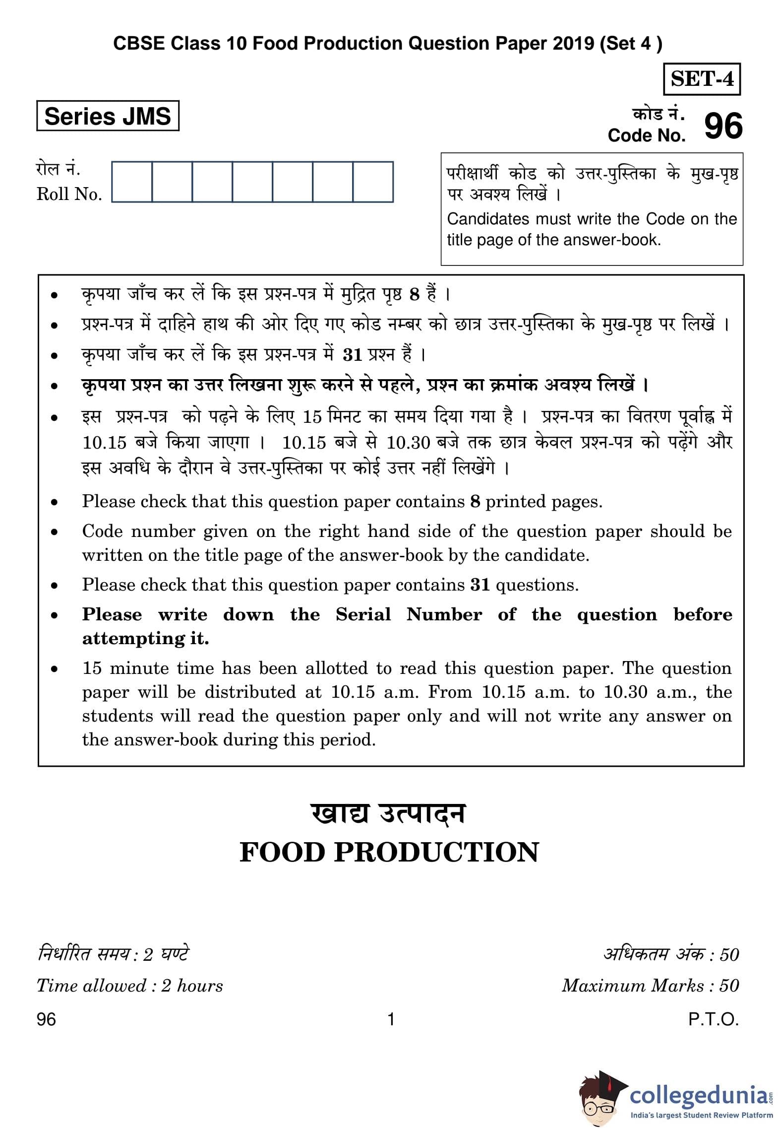CBSE Class 10 Food Production Question Paper 2019 with Answer Key (February 27)