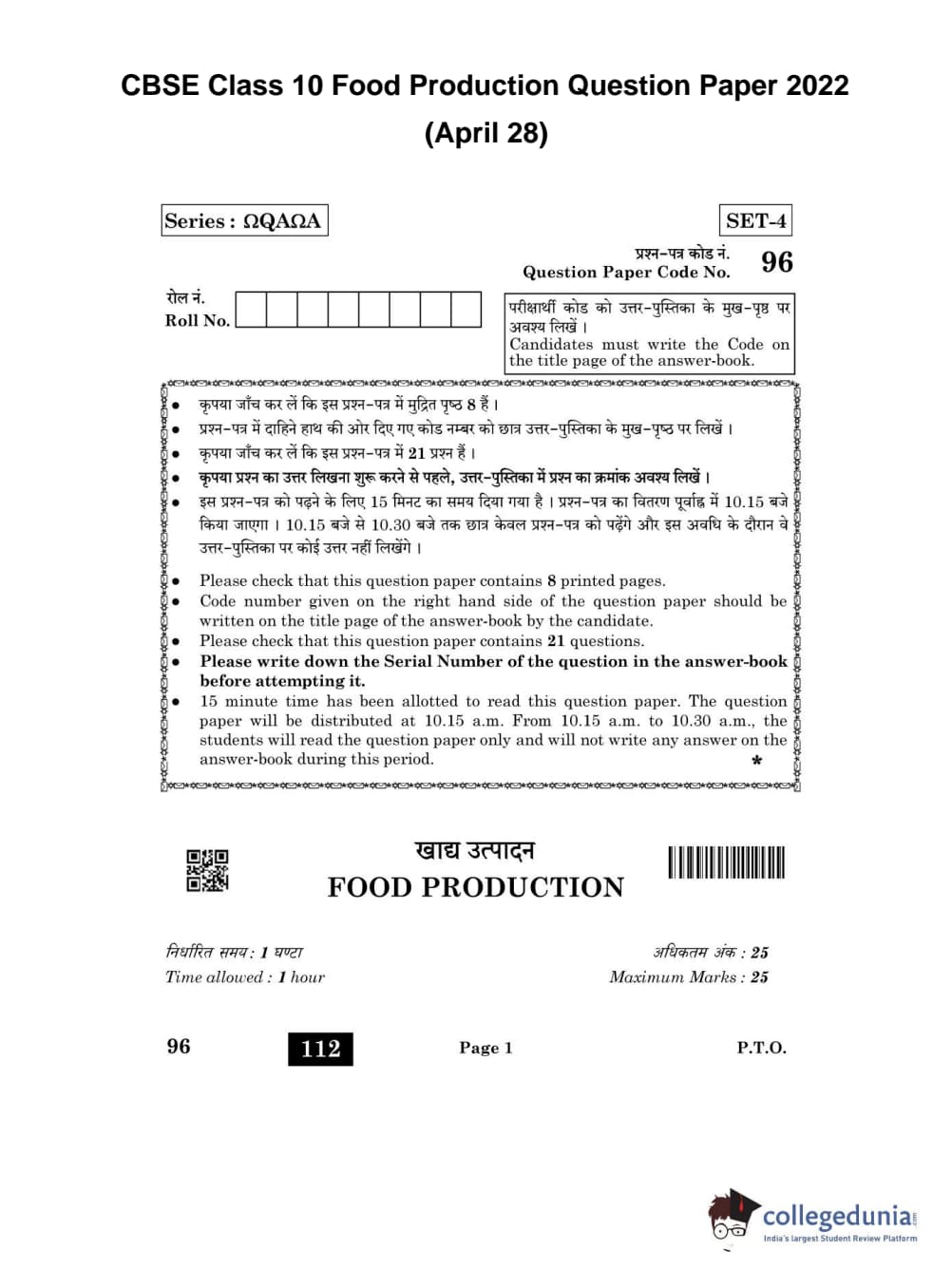 CBSE Class 10 Food Production Question Paper 2022 with Answer Key (April 28)
