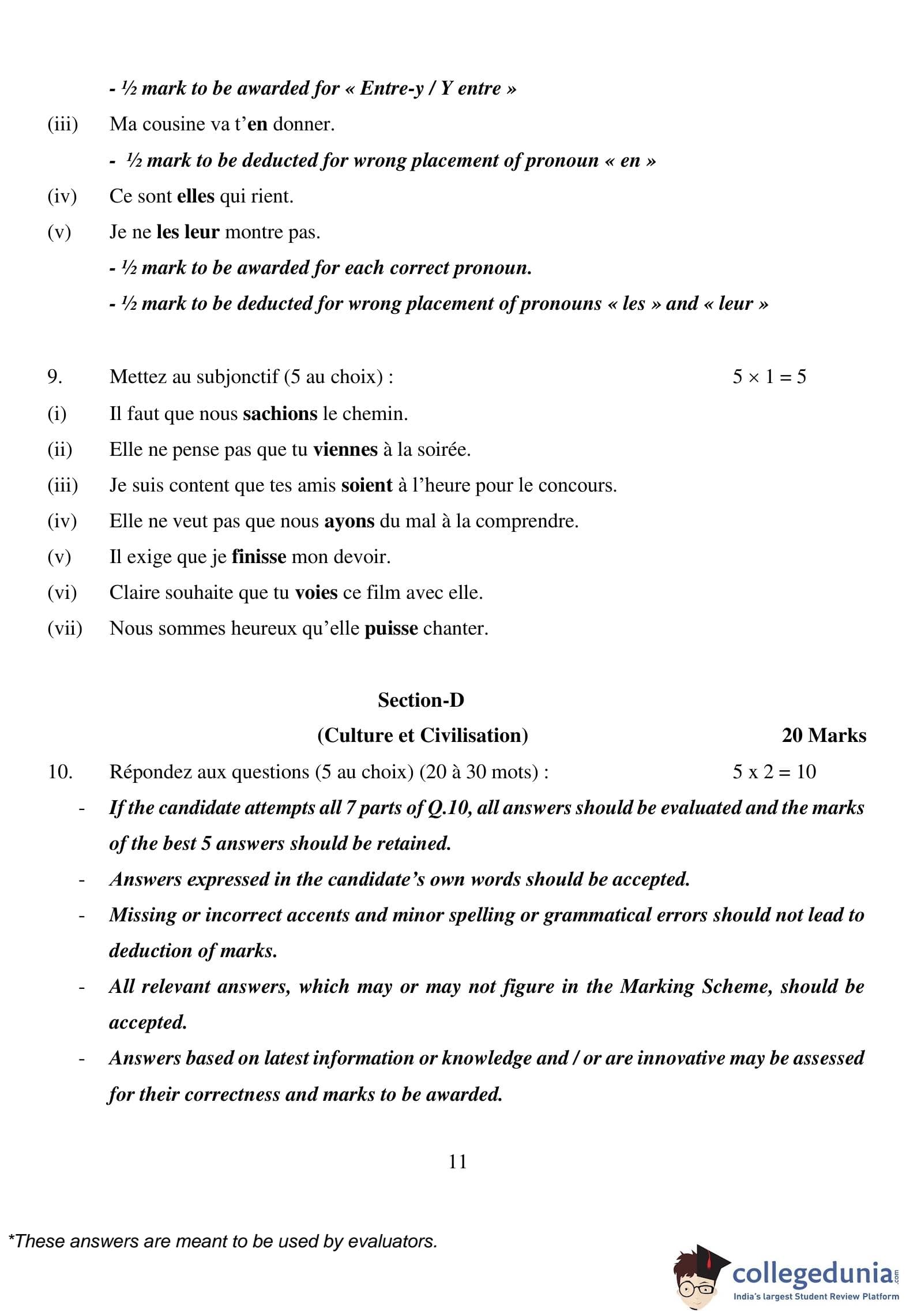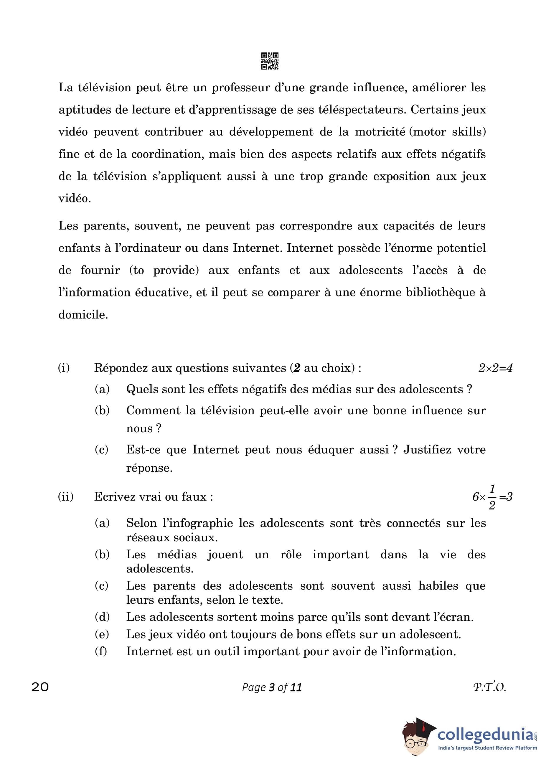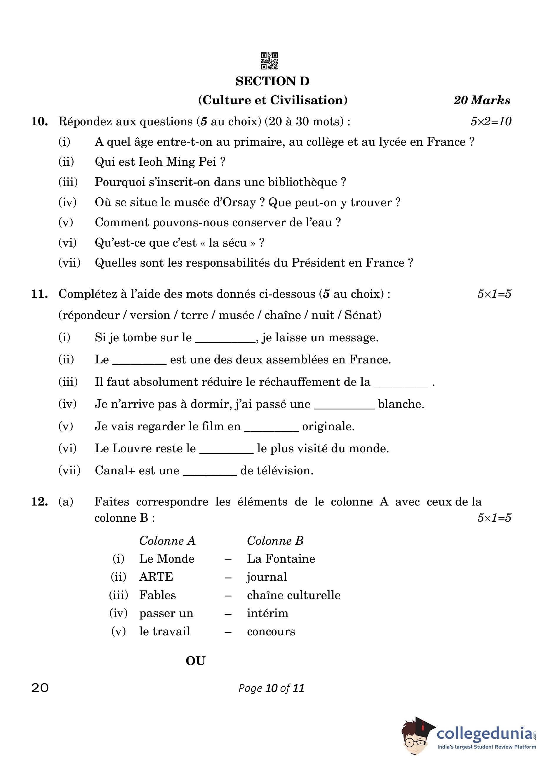 CBSE Class 10 French Question Paper 2023 with Answer Key