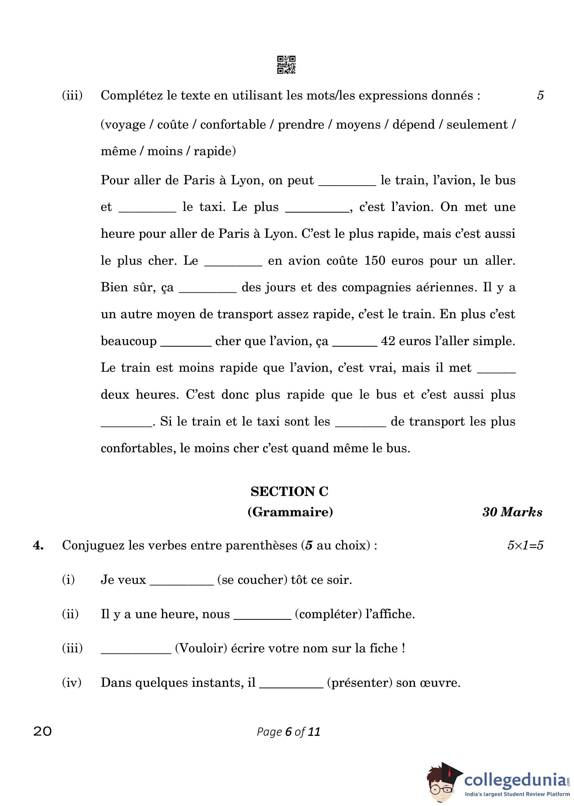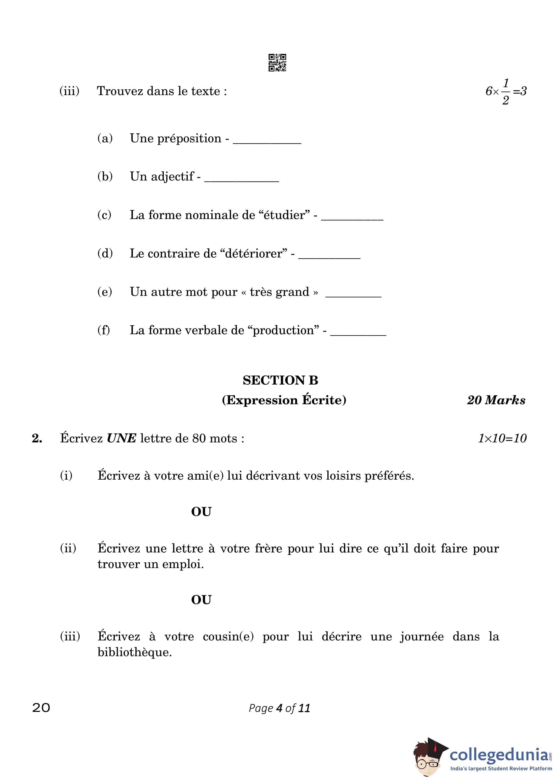 CBSE Class 10 French Question Paper 2023 (Set 4- 20) with Answer Key pdf is available for download here. The exam was conducted by Central Board of Secondary Education on February 20, 2023. The question paper comprised a total of 12 questions divided among 4 sections.